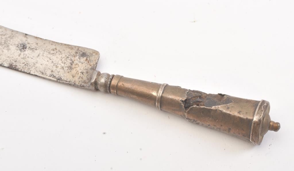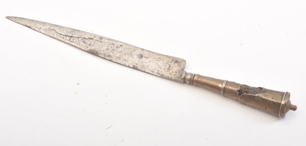Spanish style dagger with brass over wood grip. 17th century. Measures 11 3/4" overall with a 7 7/8" blade. Damage and loss to the grip. Blade shows some heavy pitting. Found in Mexico by old collector. Est.: $150-$300