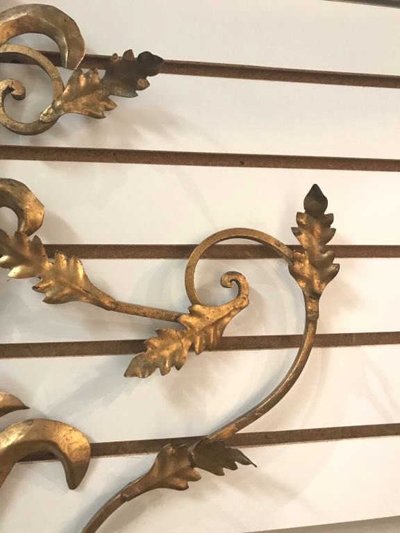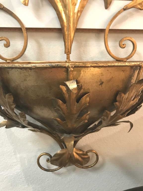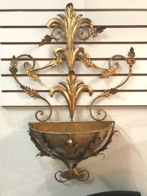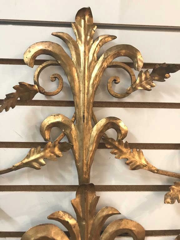 Fancy vintage-style gold painted metal wall piece; approximately 36” in height, 23” wide and 10” deep. Est.: $50-$100.