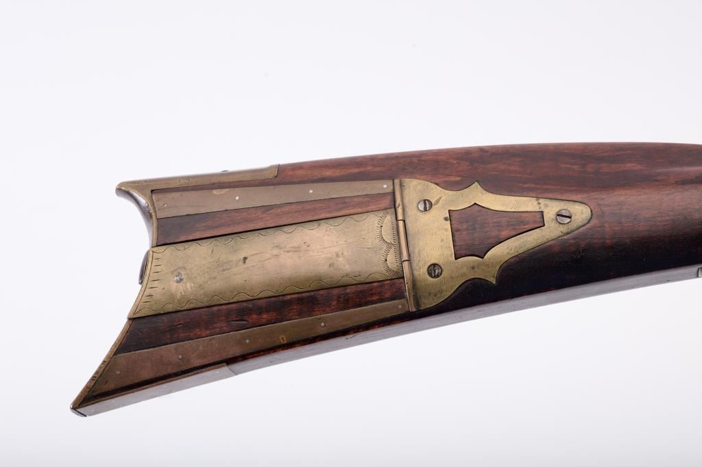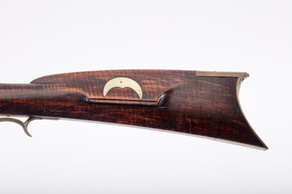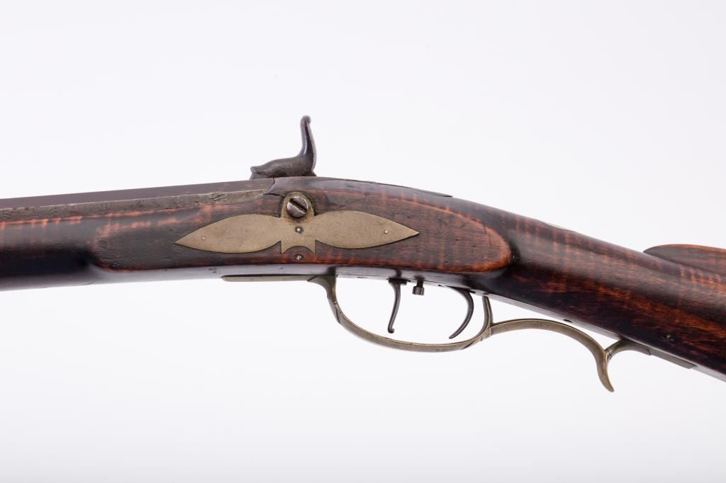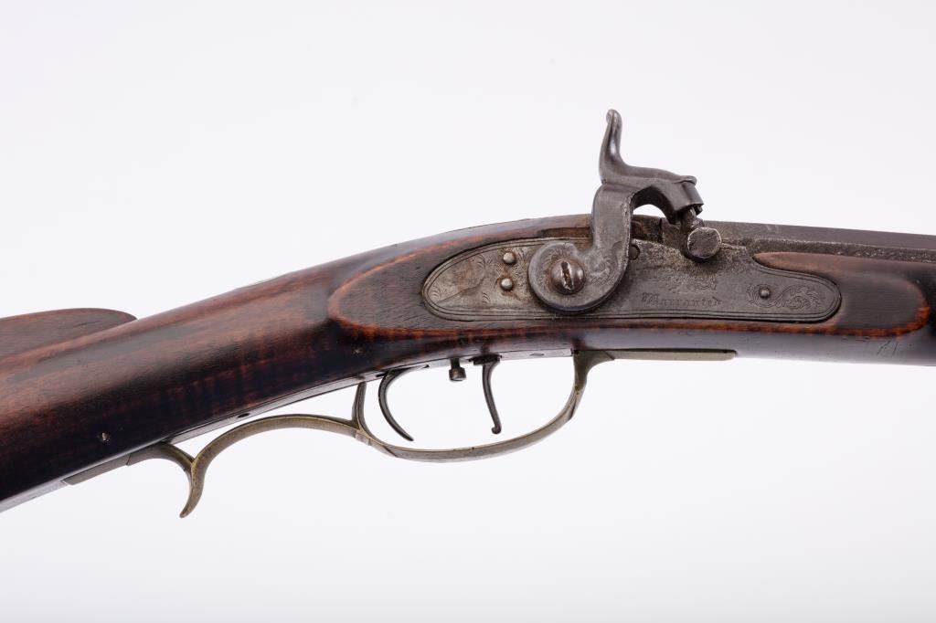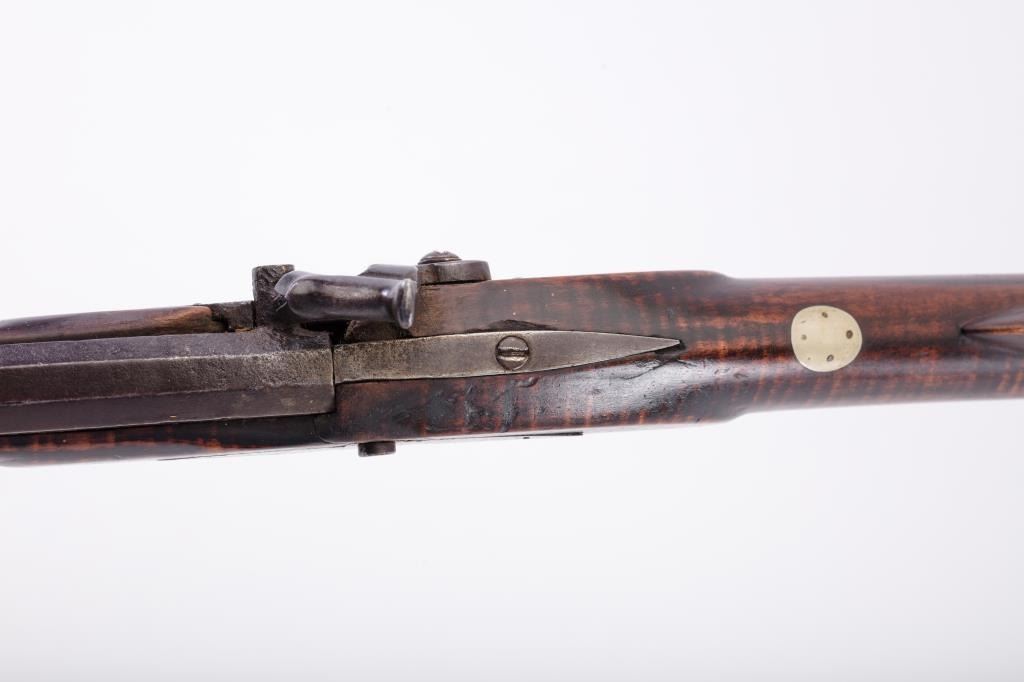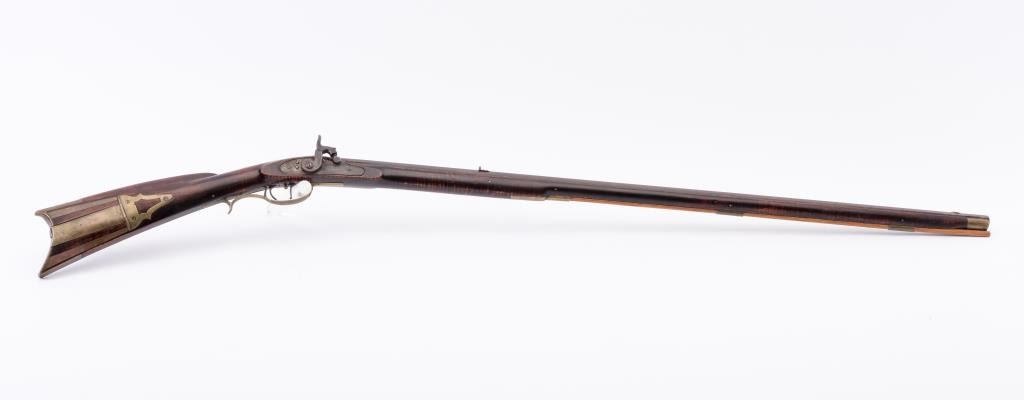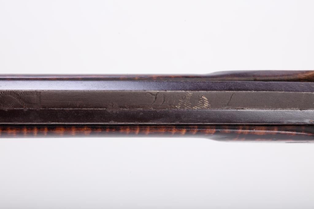 Percussion full stock Kentucky rifle signed in script letters on barrel “T M”. Measures 51 ½” overall with a 36” barrel of approximately .36 caliber rifled. Plain pierced patch box half-moon German silverinlay in cheek piece. Light with thin proportions. Double triggers. This rifle is in overall very good condition showing just normal aging with very minor imperfections. The lock works well,. Minor wood loss behinddrum from firing. From an old northern California collections. Est.: $700-$1400