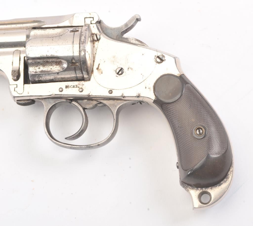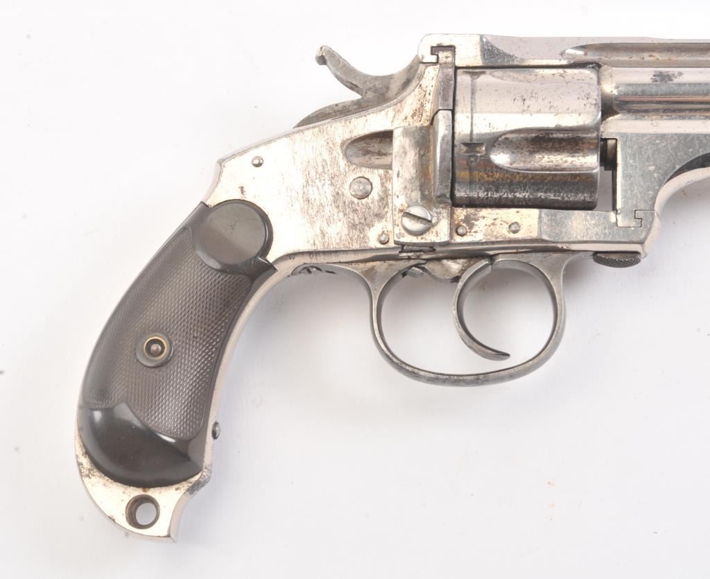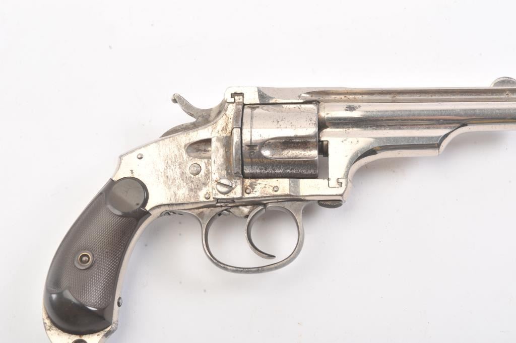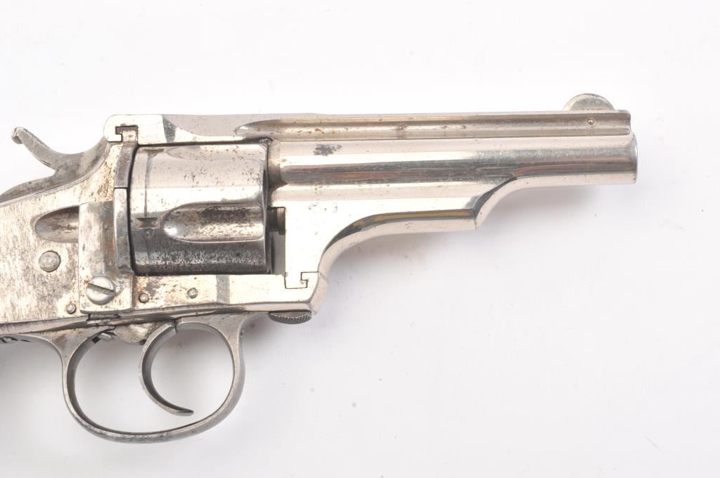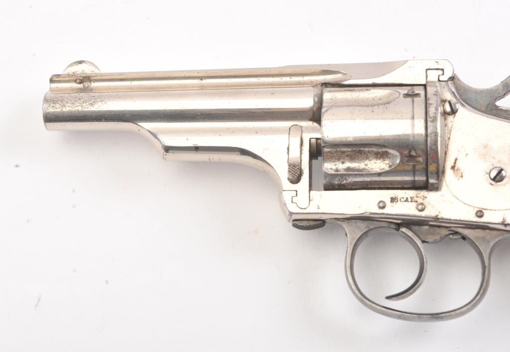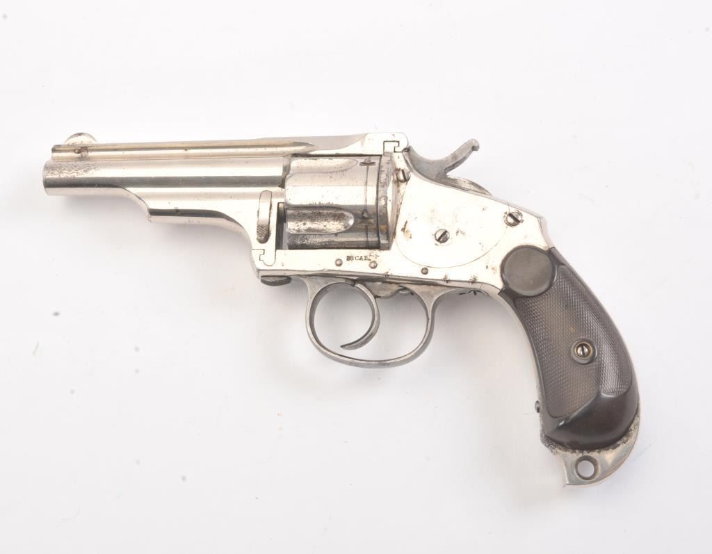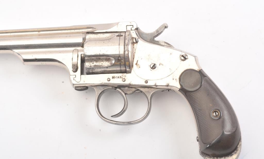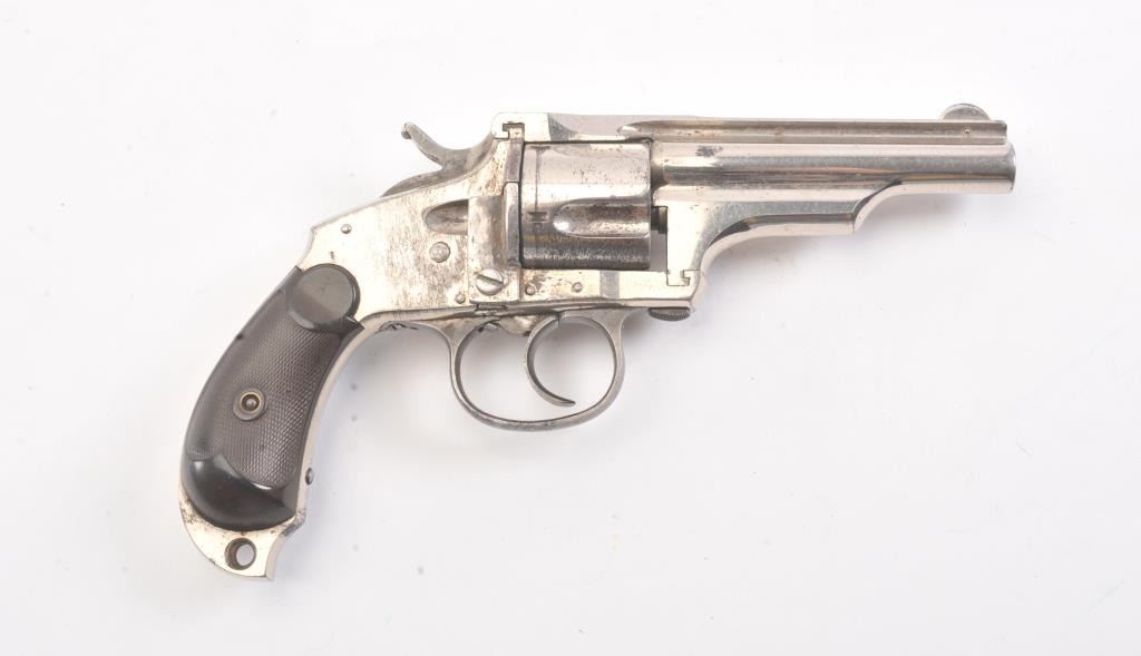 Merwin and Hulbert Double Action Pocket Revolver in .38 S&W with a 3 1/2" barrel, birds head grip with lanyard, nickel plated, S/N 24643. 80%-90% original nickel with minor losses and slight erosion and pinprickpitting where finish was lost. Gutta Percha grips are good with wear to the checkering from carry. The action is tight and the bore is very good. Western frontier era antique pocket pistol. (Antique) Est.: $300-$600