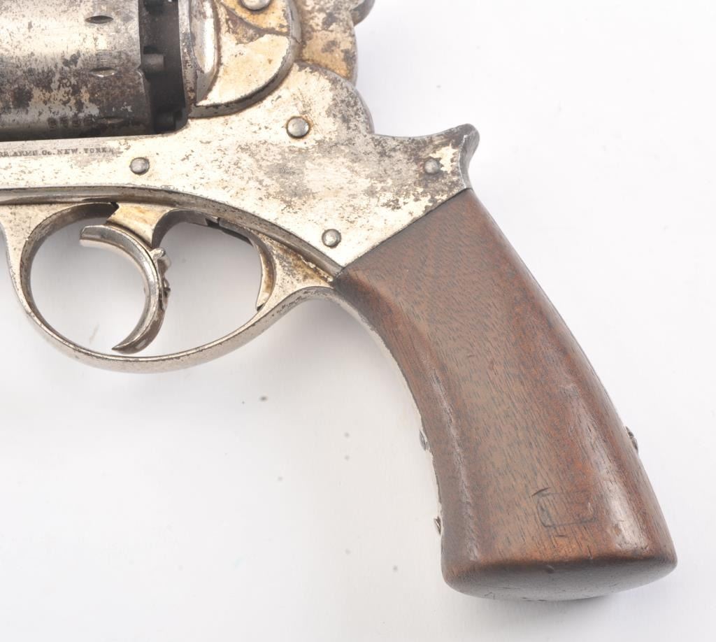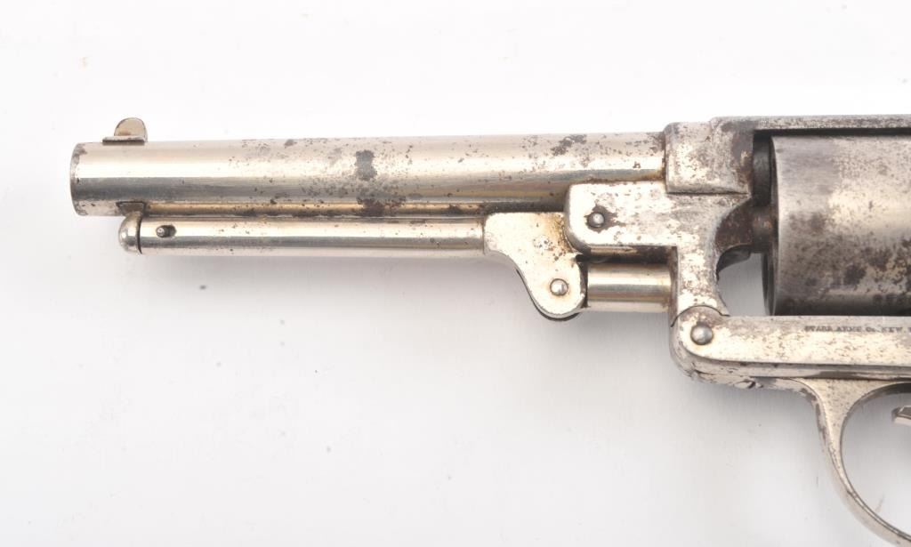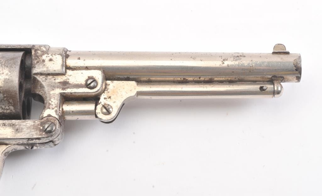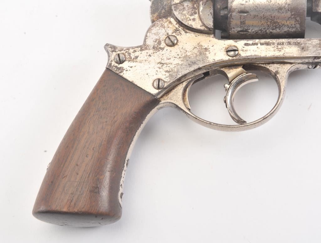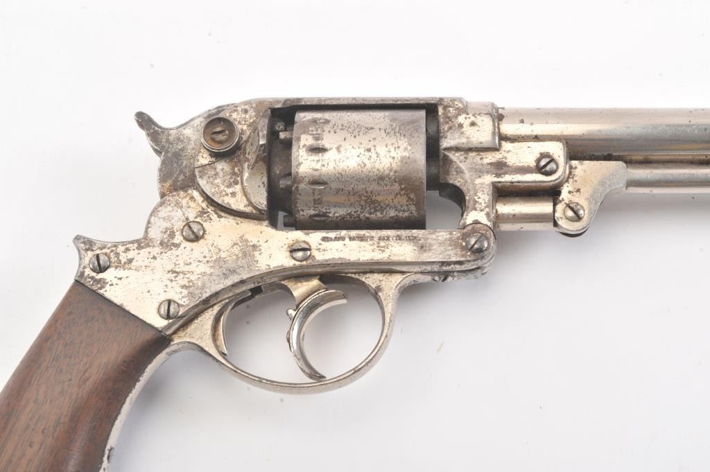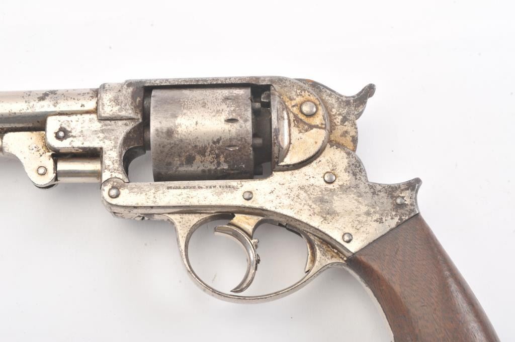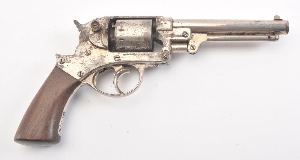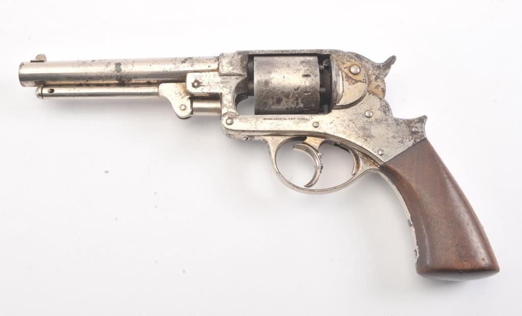 Starr .44 caliber Double Action Percussion revolver showing old re-nickel finish, S/N 3796. The action works well and the frame markings are crisp. Trace of cartouche on the grip. Approximately 50%-70% old flakingnickel of "Yellow" color remains with some minor pitting and erosion where finish has lifted. "G.A.R." magazines advertised nickel plating services for swords, guns and artifacts which many veterans utilized toembellish their war trophy and artifacts. A nice looking Starr. (Antique) Est.: $500-$1000