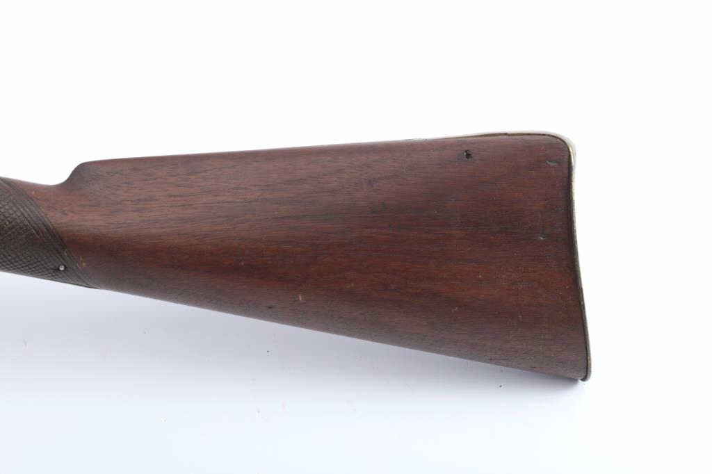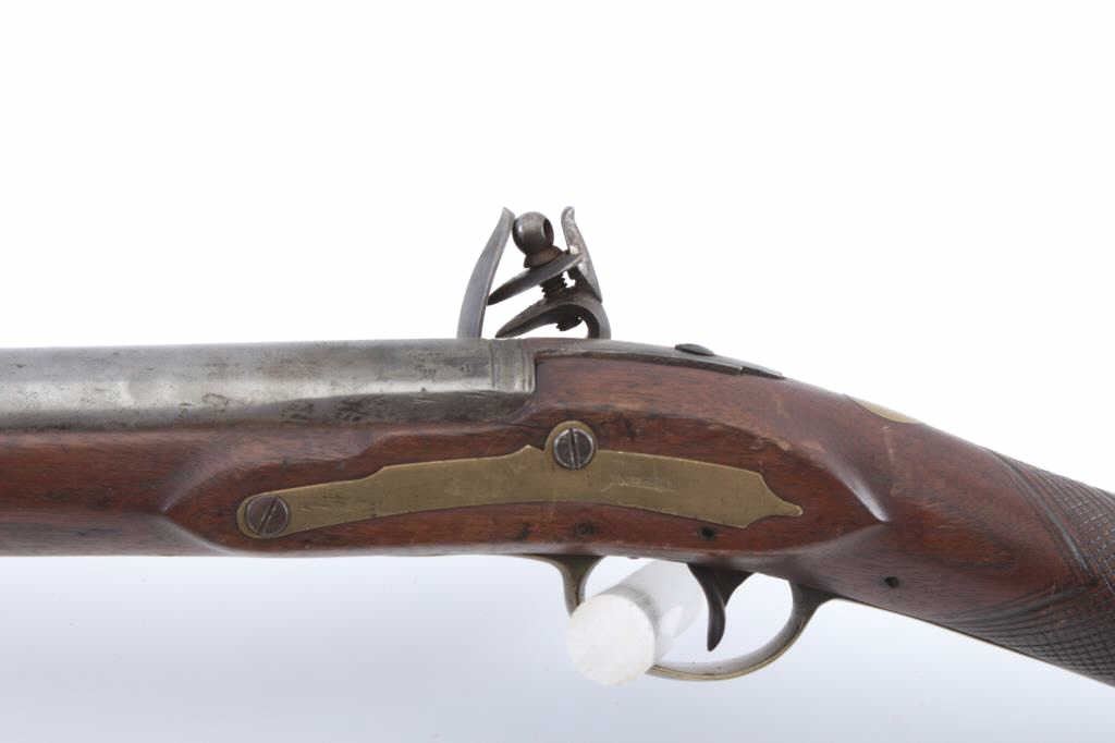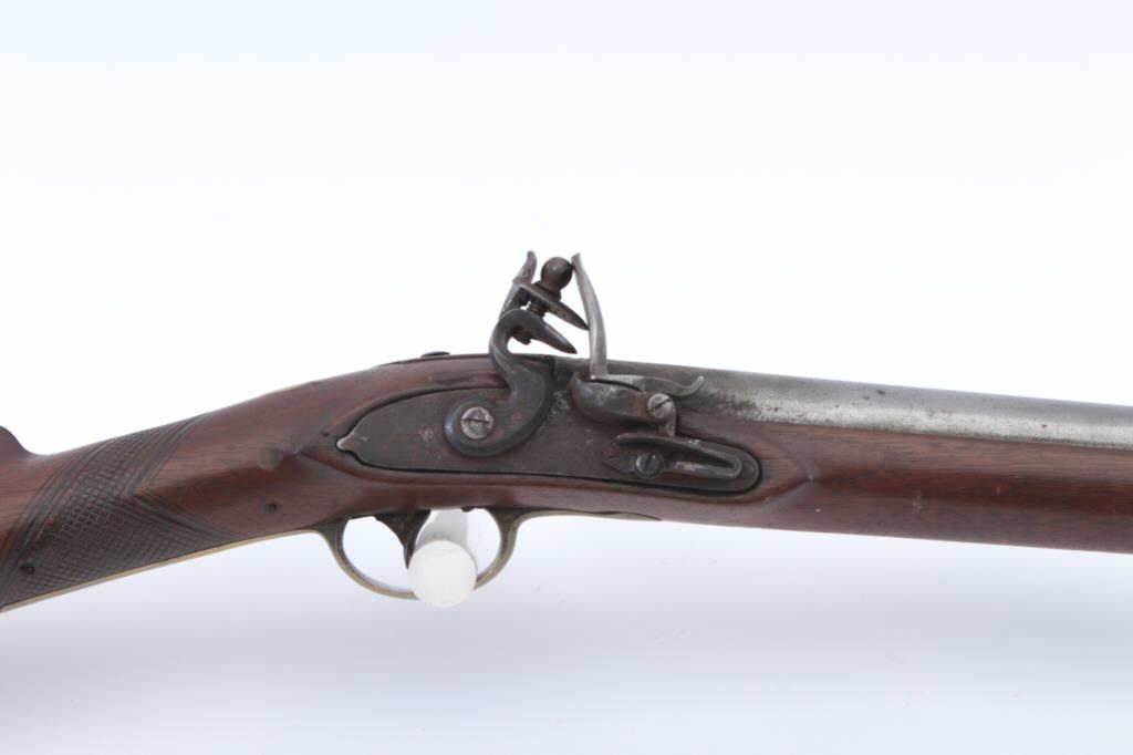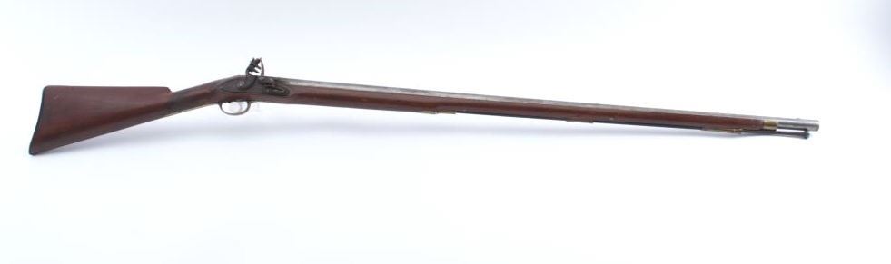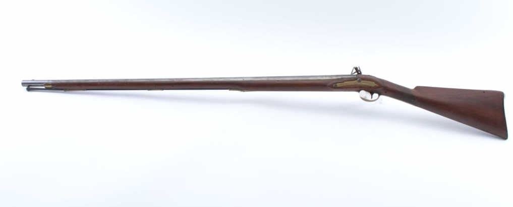 New England style flintlock militia musket stamped "T. French" on brass side plate and "P.M. 1836" on the breech of the barrel. 39" barrel of approximately .69-70 smoothbore and 54" overall. Plain brass mounts andcheckered wrist. Re-converted with a few screws replaced and restoration to the stock. The lock works "weakly". The wood shows minor losses along the edge and light refinishing. Period ramrod included.(Antique) Est.: $500-$1000