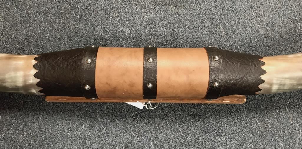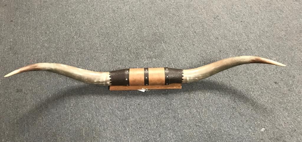 Wood plaque mounted large pair of steer horns; approximately 5 feet wide. Est.: $125-$175.