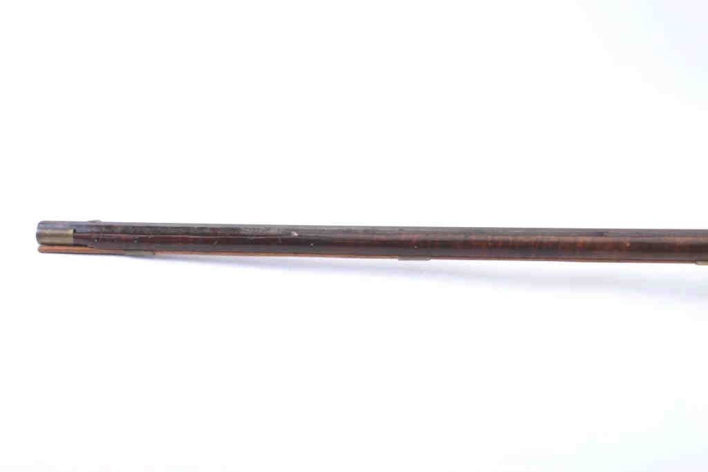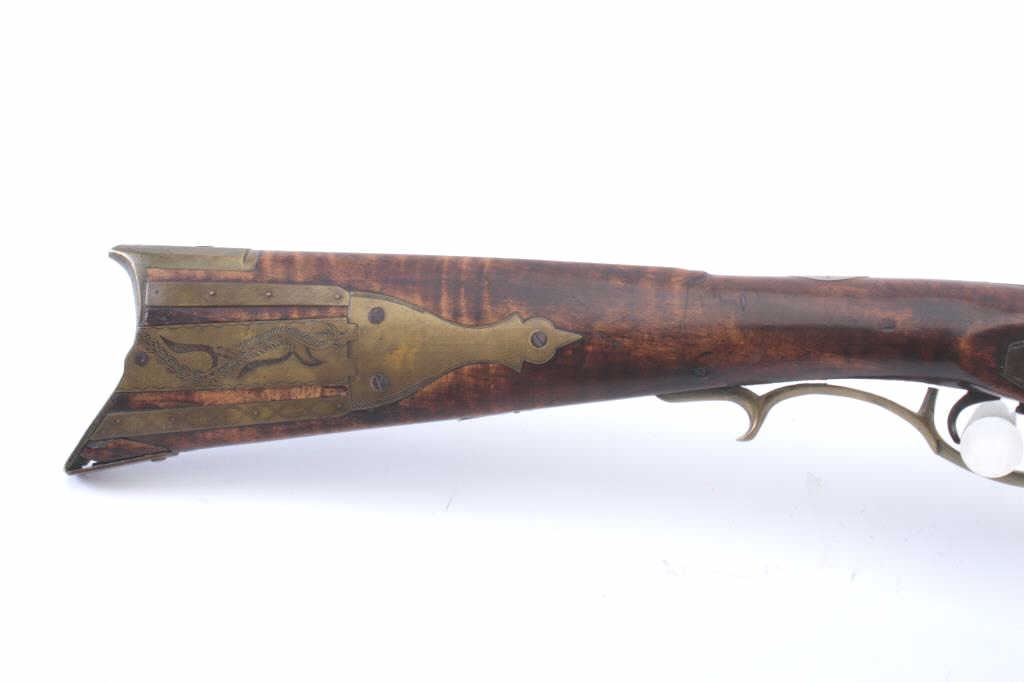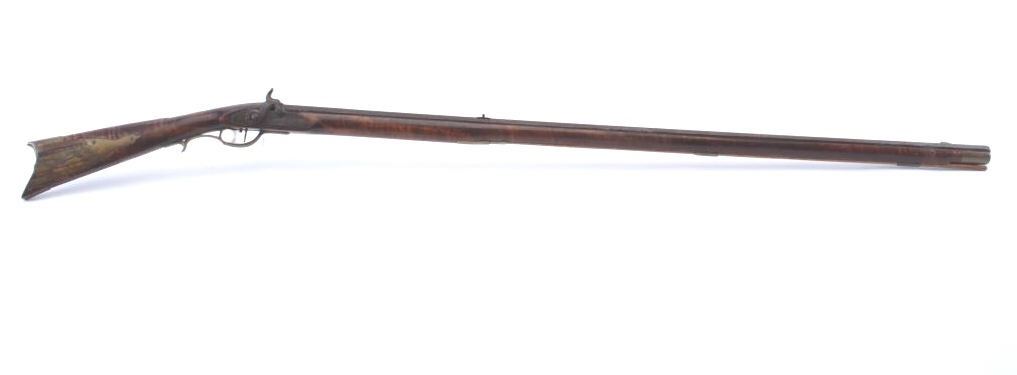 Full stocked percussion Kentucky rifle with barrel engraved “A.M.” in script. The lock is marked “Bird Bros, Philadelphia”. Measures 57” overall with a 43” barrel of .41 caliber rifled. Sleek styling with narrow buttmeasuring only 3 5/8” from top to the bottom of butt plate at heel. Set trigger with engraved patch box. The stock is fair to good and would have been very good except large sliver of wood missing at the top leftforward edge of the stock approximately 10” x ¼” also some damage to toe and blackening of stock which may hide damage or filled in wood on the left rear of buttstock (Sounds worse than it really is). The action workswell but the nipple is missing. From an old Northern California collection found between Clear Lake and Happy Camp. (Antique) Est.: $1250-$2500