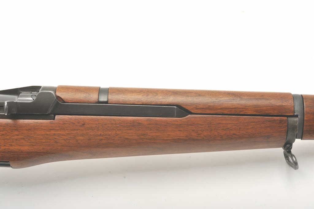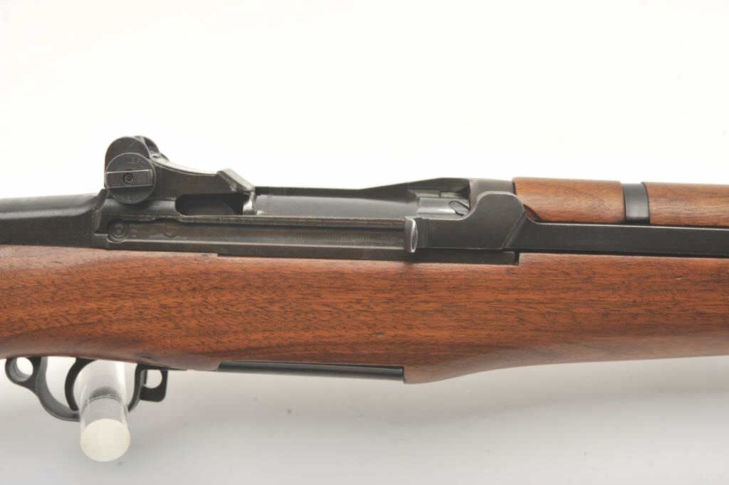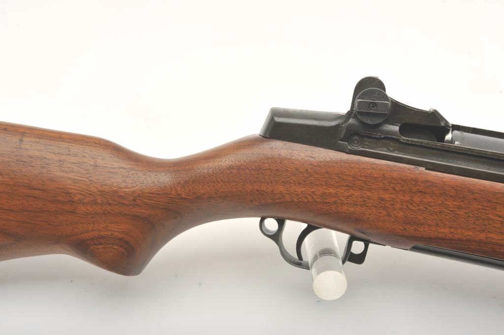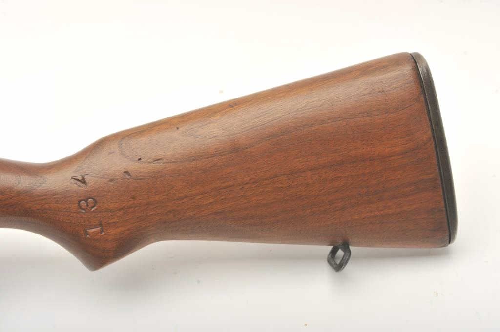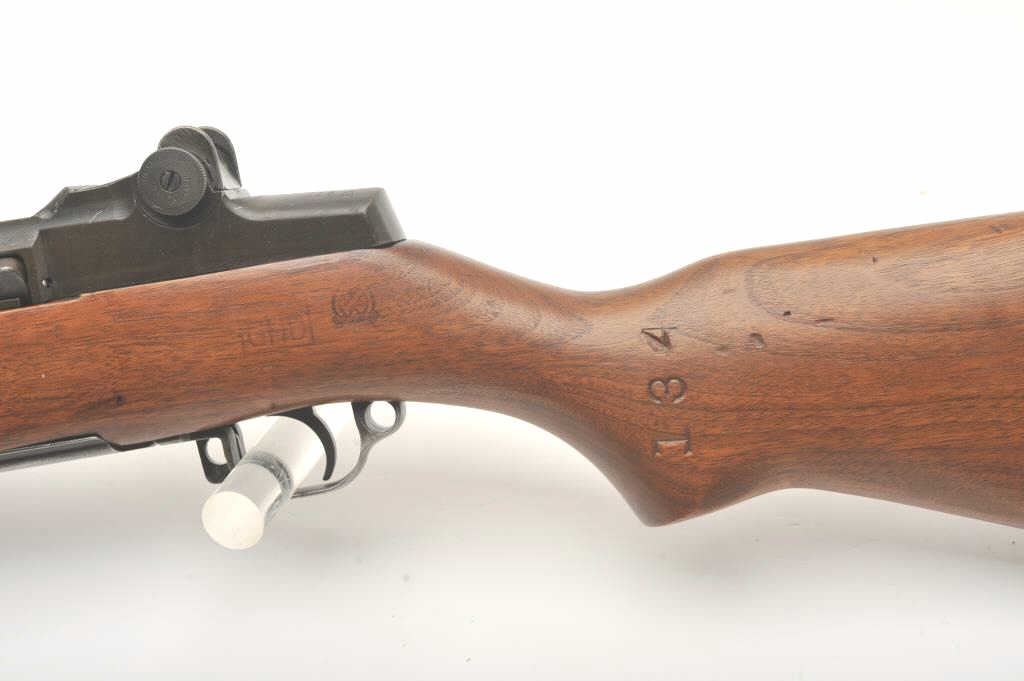 U.S. Springfield M1 Garand semi-automatic rifle, .30 caliber, 24” Winchester barrel (per consignor, TE=3.0 MW=2.0), military finish, wood stock, S/N 2449874; sharp markings, crisp action, very good + bore;consignor notes “The rifle has been restored to approximately 80% with WRA parts; the stock is correct for this time period (ca. May 1944) with WRA/GHD cartouche stock, crossed cannons and circle P proof; the stock and handguards have been completely restored”; additionally, “134” has been stamped on the left side of the stock at grip. (C&R). Est.: $1,500-$3,000.