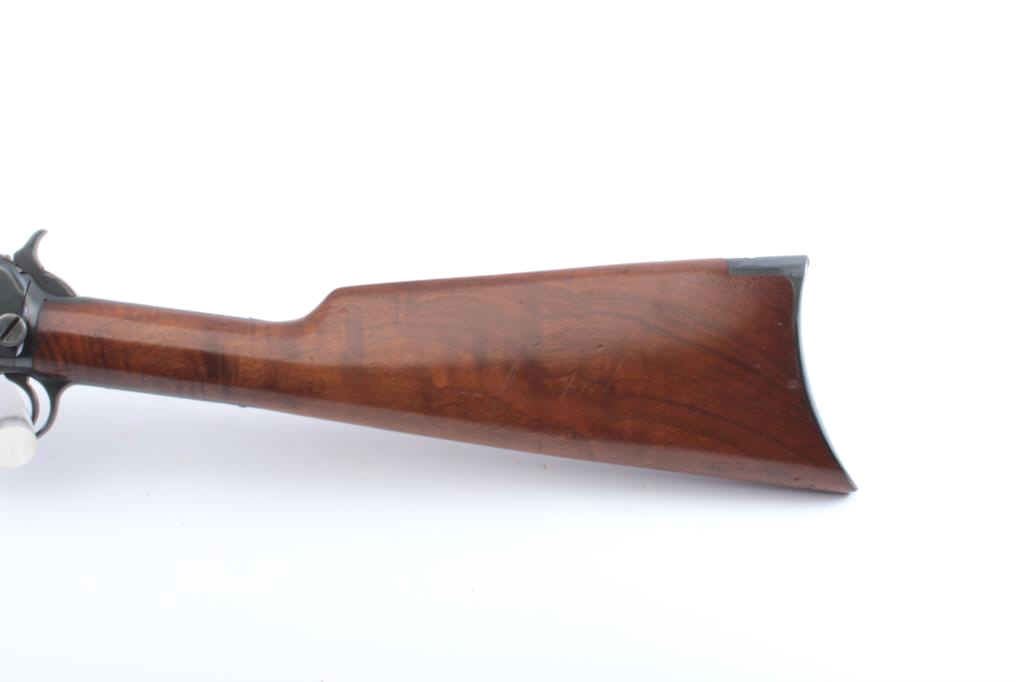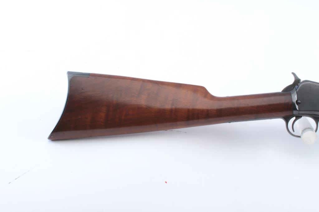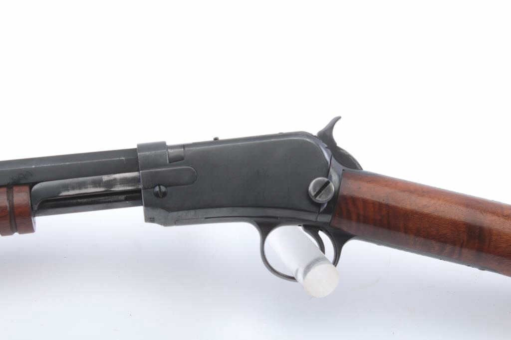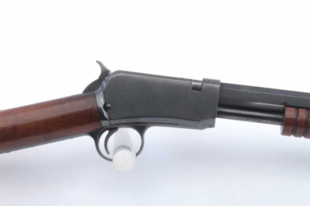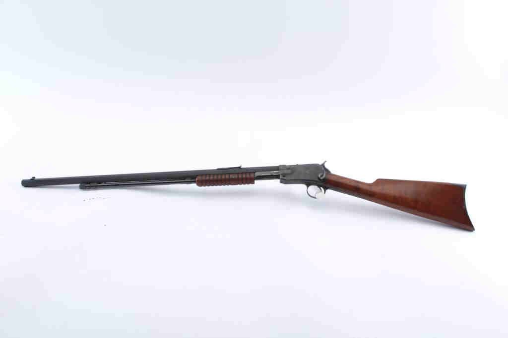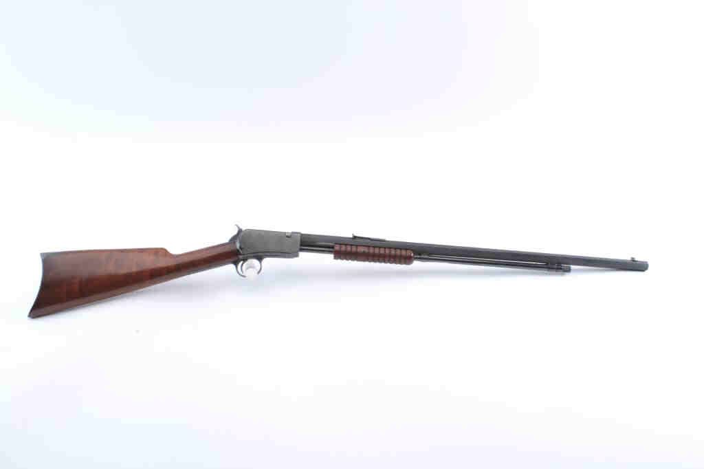 Winchester Model 90 pump action rifle, .22 Long Rifle caliber, Serial #672461. The rifle is in fine overall condition with a 24” octagon barrel with a ¾ length magazine. The rifle retains approximately 90% of theoriginal blue finish with sharp edges and small scratches from carry and use. The smooth wood stocks are in very good condition with small mars and compressions associated with field use. The butt stock is beautifulselect Walnut with great figure and ends with a smooth steel crescent butt plate. The bore is good, the action is crisp and the markings are sharp. Est.: $700-$1,400. (C+R).
