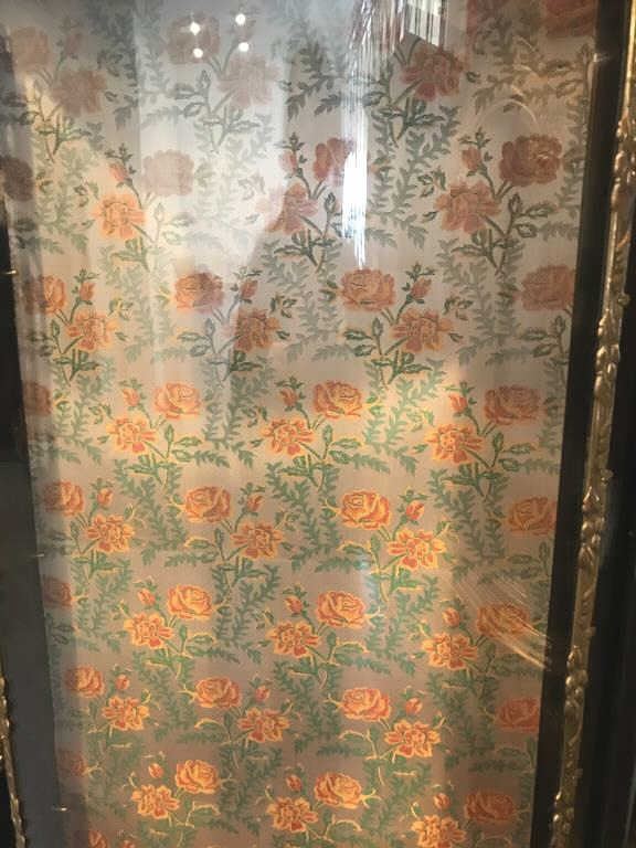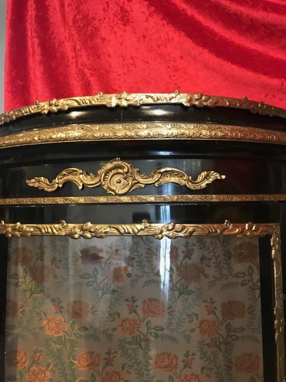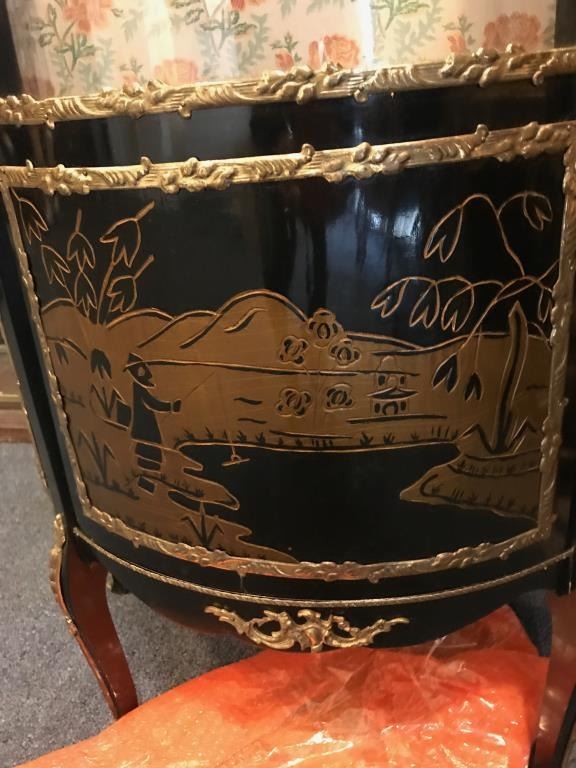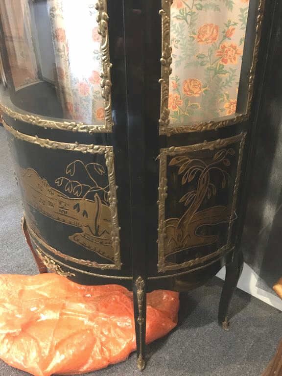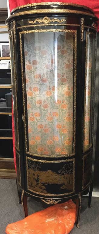 Vintage-style Oriental bow front black painted cabinet with brass accents, painted scenery at base and flowered material background in cabinet; three shelves; overall approximately 68” tall, 30” wide and 13”deep. Est.: $200-$400.