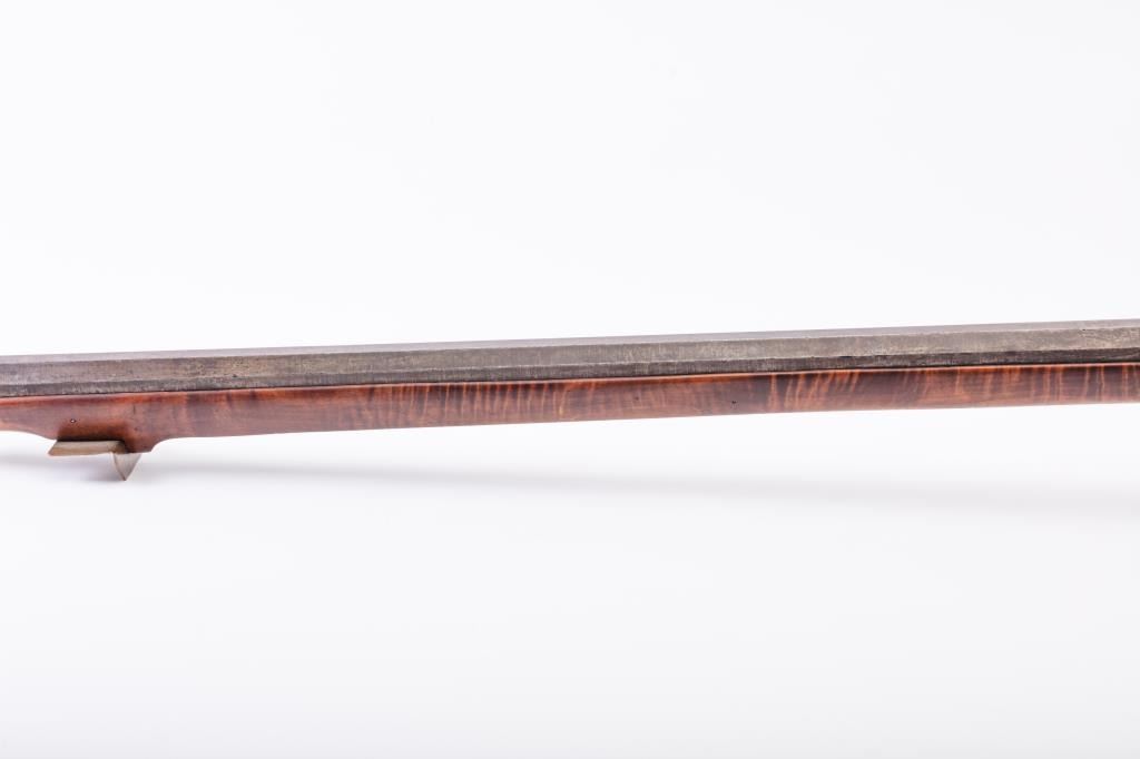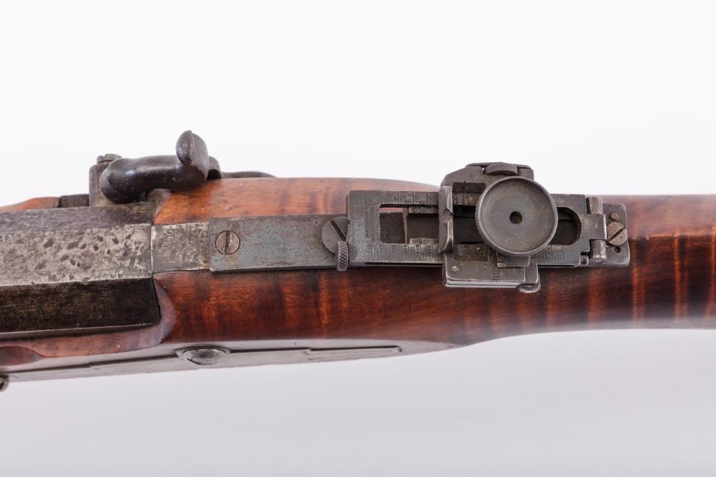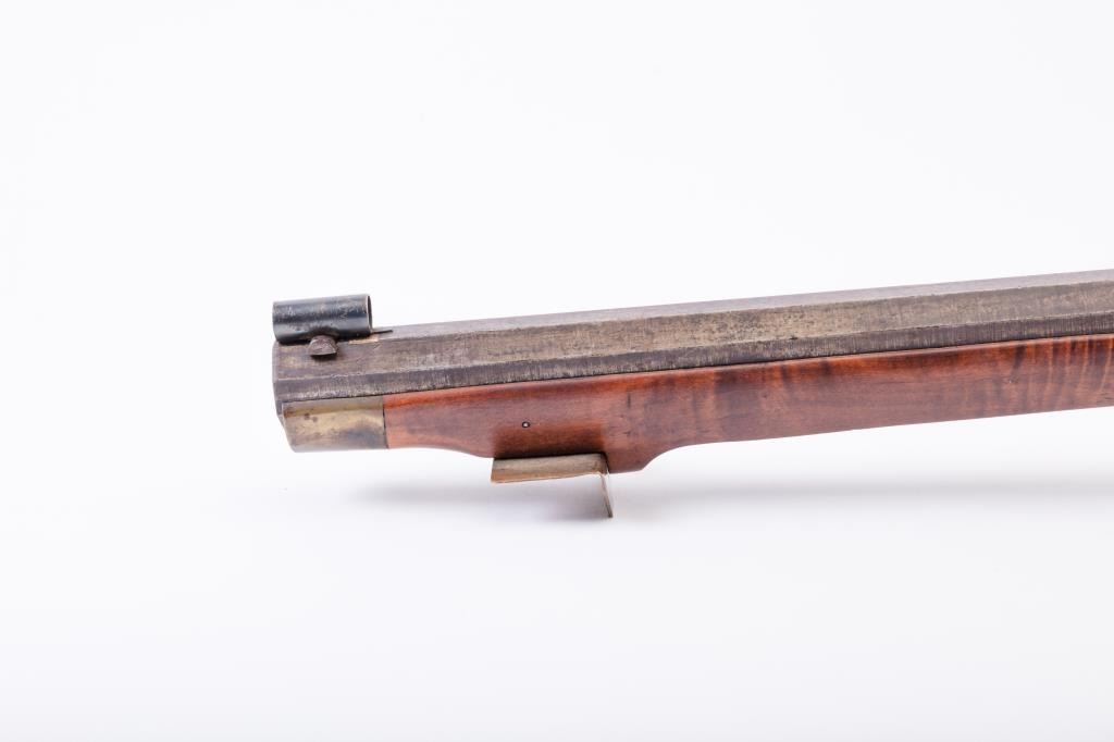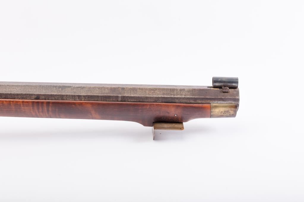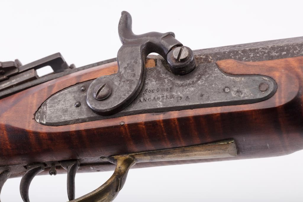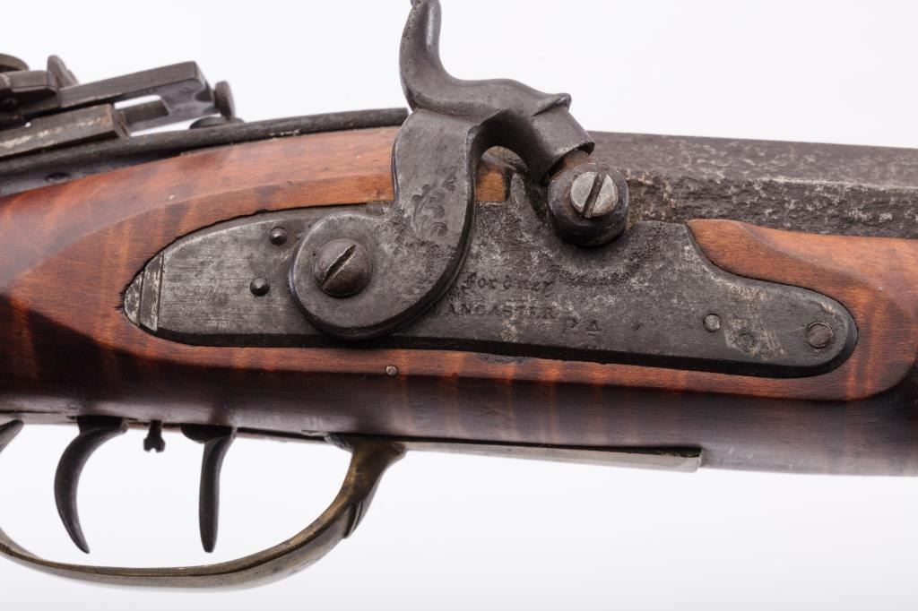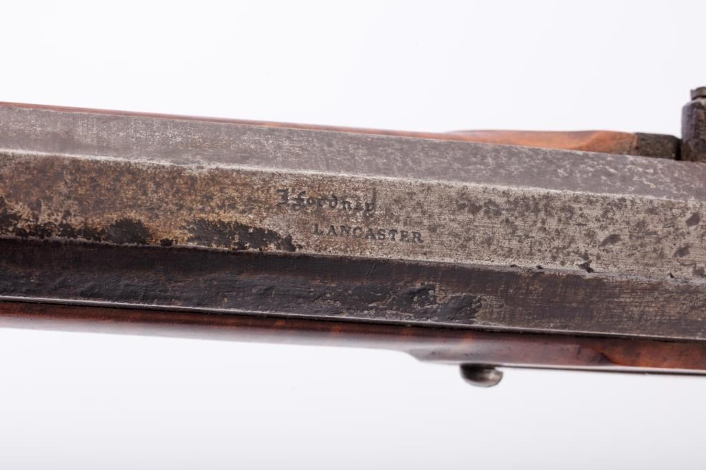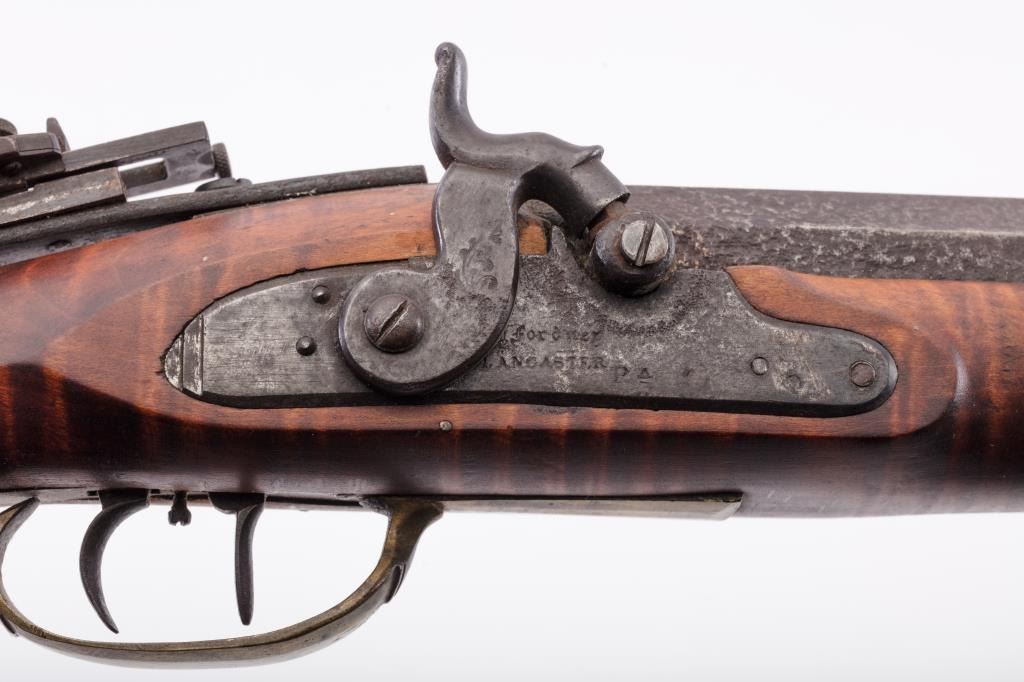 Full Stock Heavy barrel percussion Target rifle marked “J. Fordney Lancaster”. Measures 61 ½” overall with a 45” heavy octagon barrel of .57-58” caliber rifled bore. Shows quality manufacture and engraved piercedpatch box. Adjustable tang sight and hooded target type front sight. Set triggers. Locks working and triggers set. The wood is very good plus with rifle shape and nice proportions with pleasing aesthetics. Themetal shows some erosion and pitting and the original sight has been reset and original dove tail plugged. The Fordney family were famous in Lancaster Penn. From an old Northern California collector. (Antique)Est.: $1500-$3000