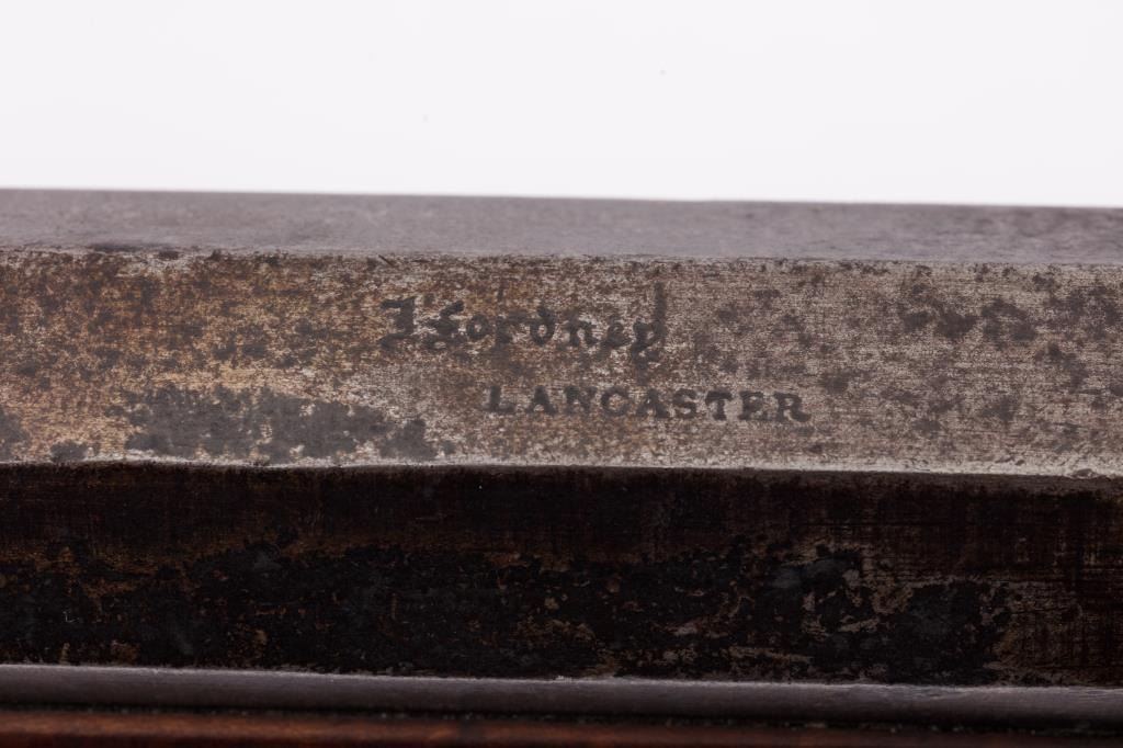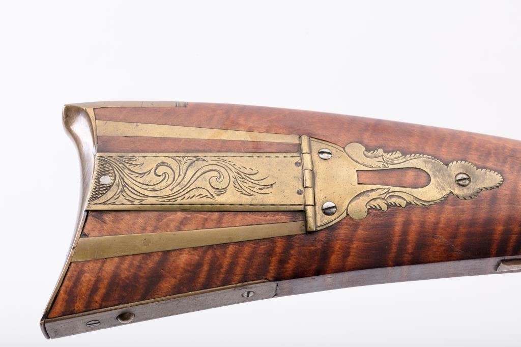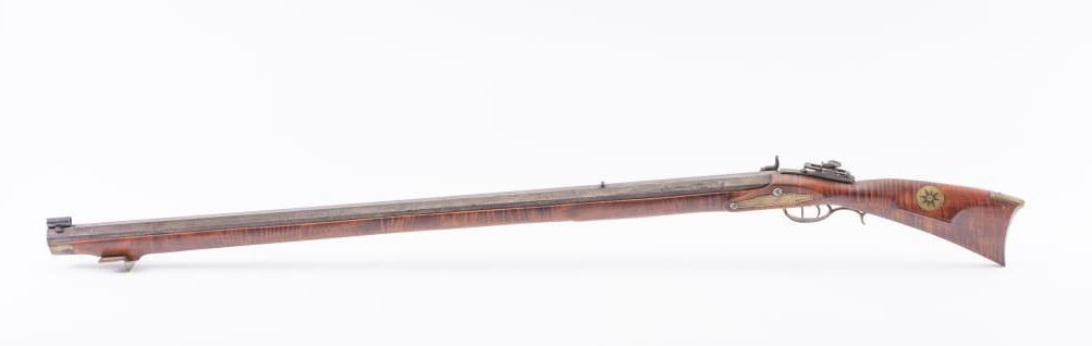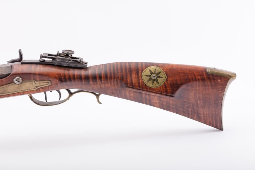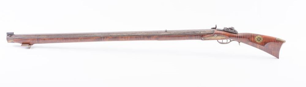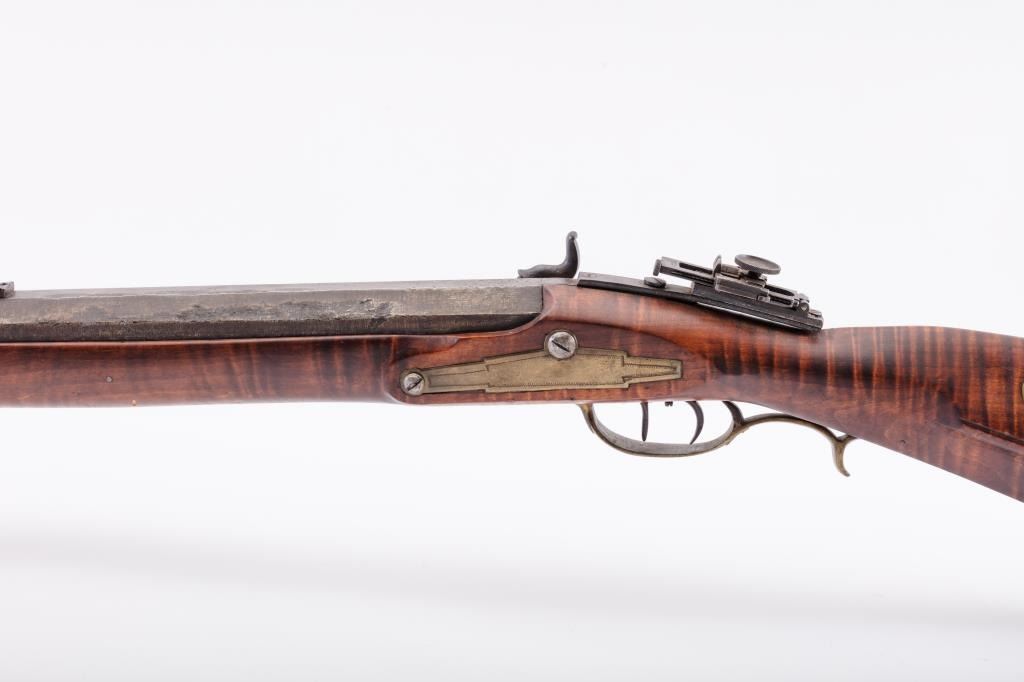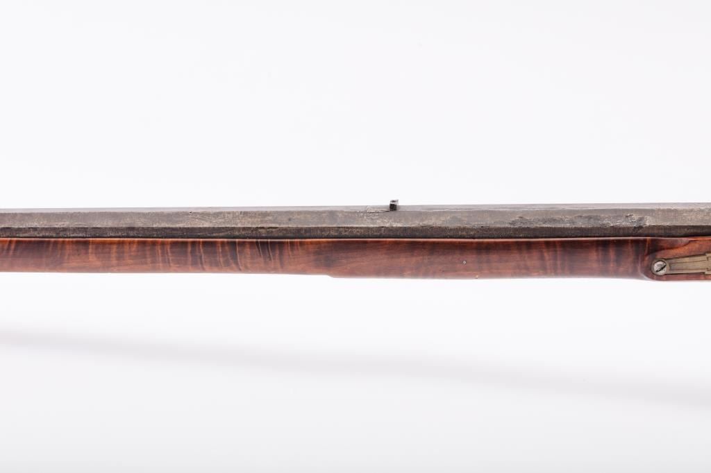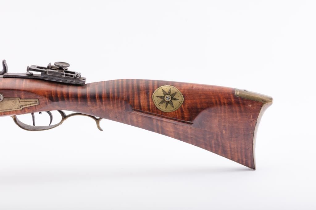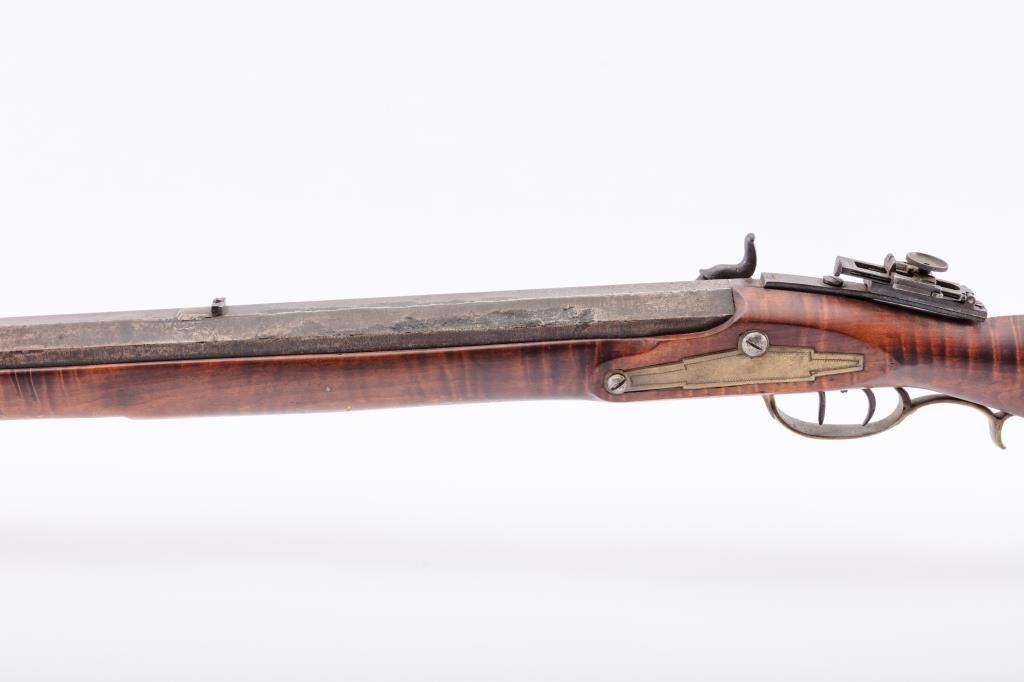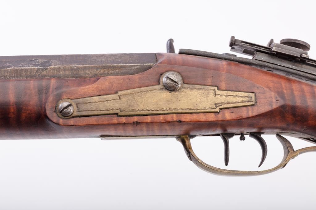 Full Stock Heavy barrel percussion Target rifle marked “J. Fordney Lancaster”. Measures 61 ½” overall with a 45” heavy octagon barrel of .57-58” caliber rifled bore. Shows quality manufacture and engraved piercedpatch box. Adjustable tang sight and hooded target type front sight. Set triggers. Locks working and triggers set. The wood is very good plus with rifle shape and nice proportions with pleasing aesthetics. Themetal shows some erosion and pitting and the original sight has been reset and original dove tail plugged. The Fordney family were famous in Lancaster Penn. From an old Northern California collector. (Antique)Est.: $1500-$3000