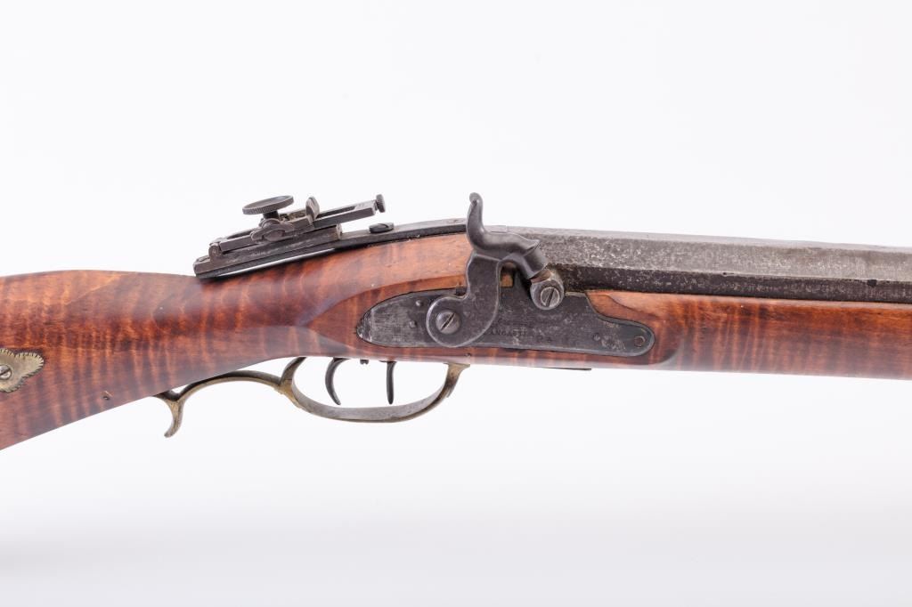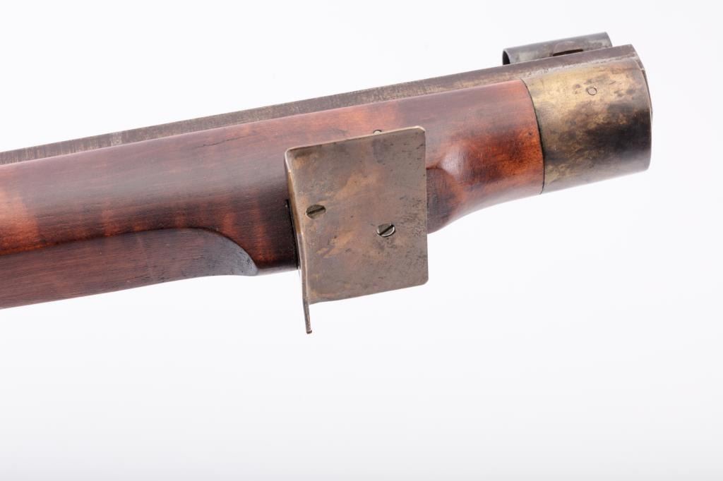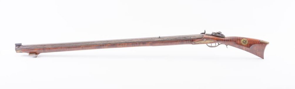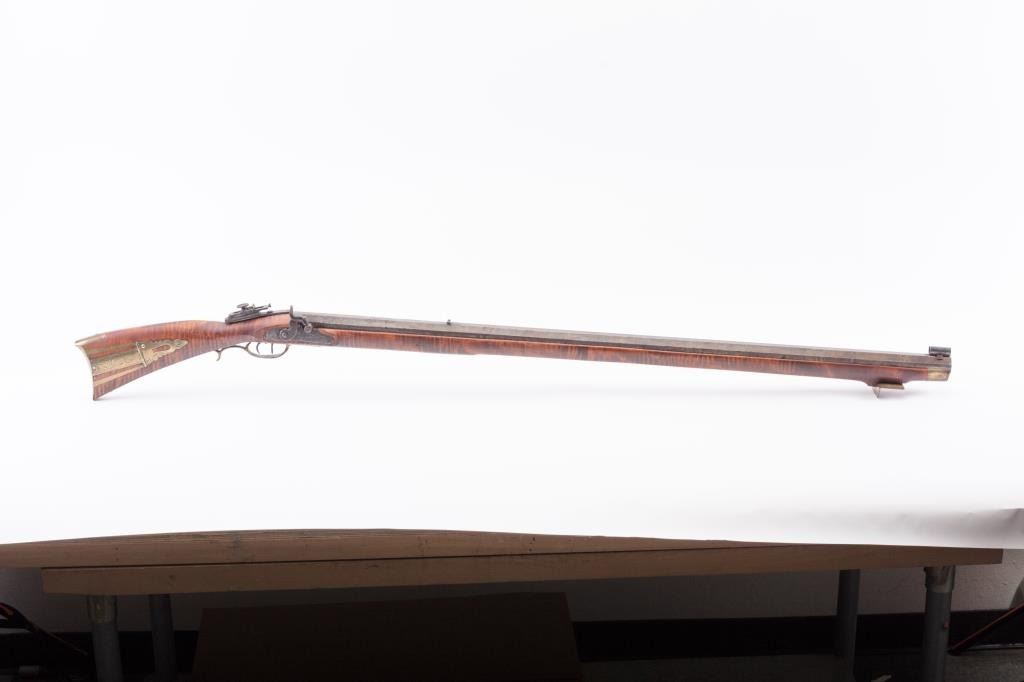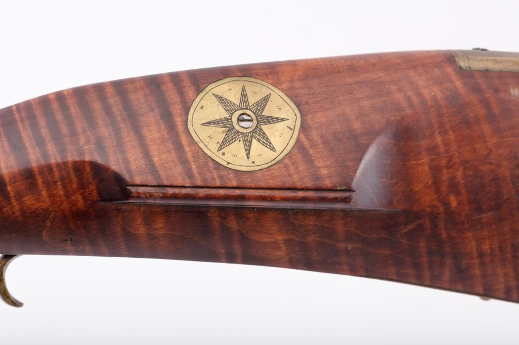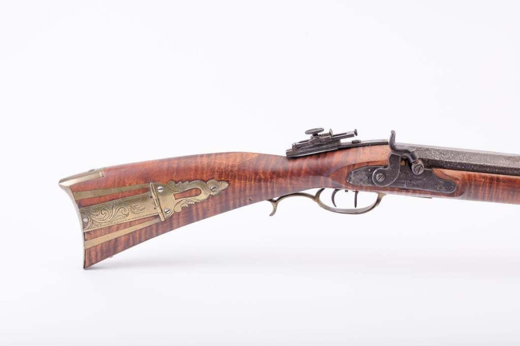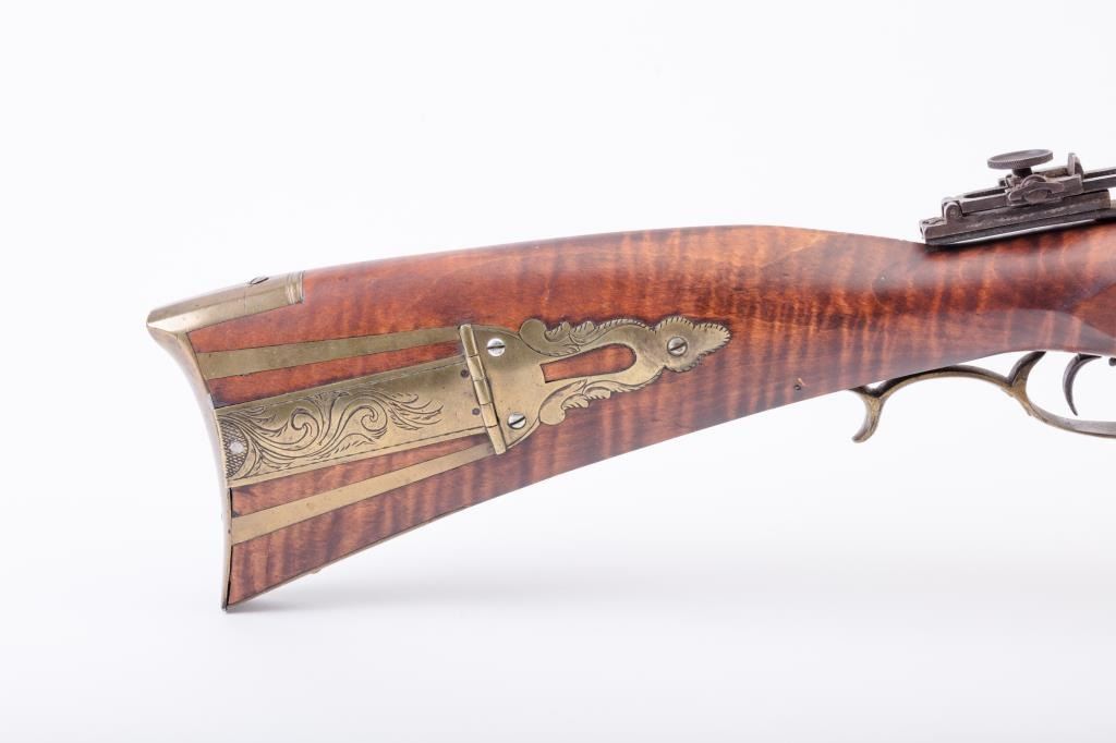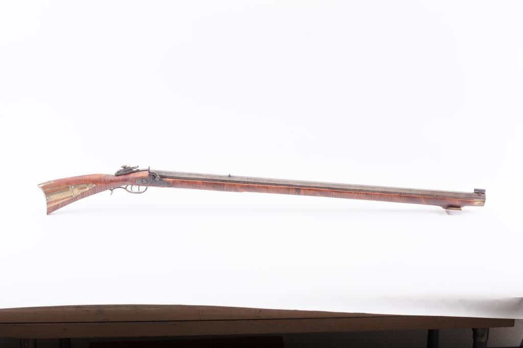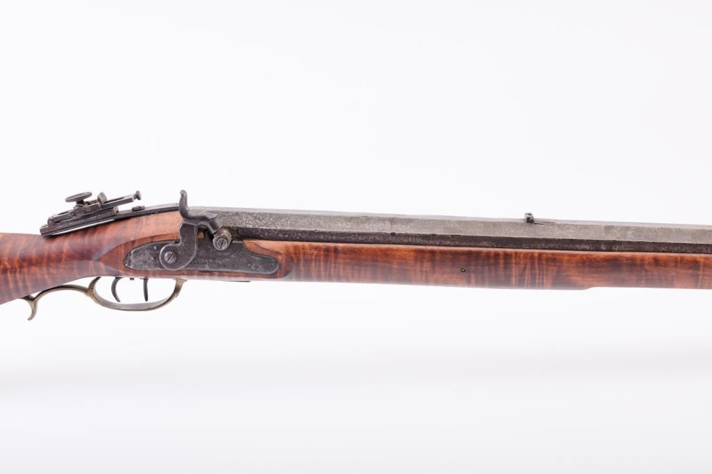 Full Stock Heavy barrel percussion Target rifle marked “J. Fordney Lancaster”. Measures 61 ½” overall with a 45” heavy octagon barrel of .57-58” caliber rifled bore. Shows quality manufacture and engraved piercedpatch box. Adjustable tang sight and hooded target type front sight. Set triggers. Locks working and triggers set. The wood is very good plus with rifle shape and nice proportions with pleasing aesthetics. Themetal shows some erosion and pitting and the original sight has been reset and original dove tail plugged. The Fordney family were famous in Lancaster Penn. From an old Northern California collector. (Antique)Est.: $1500-$3000