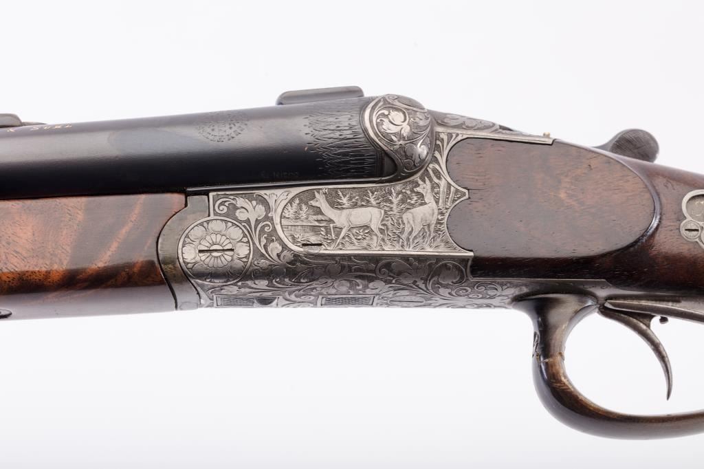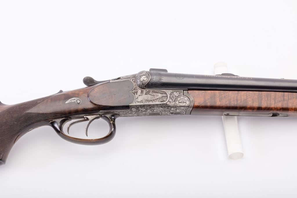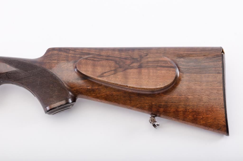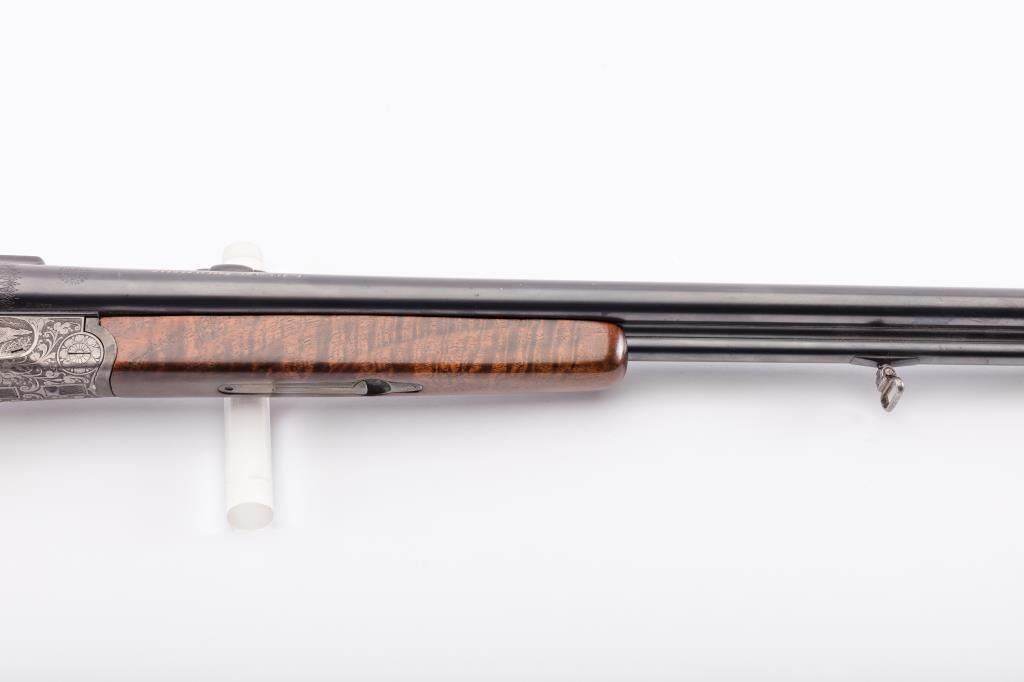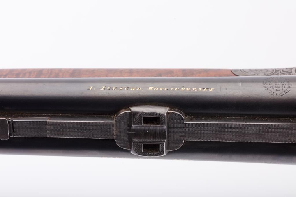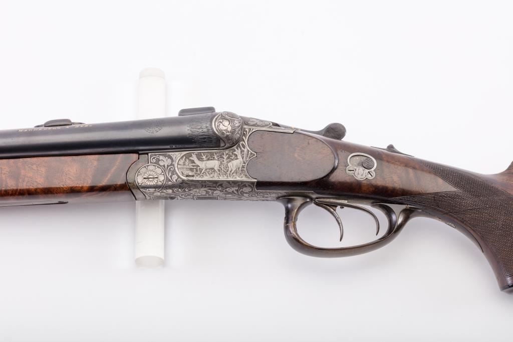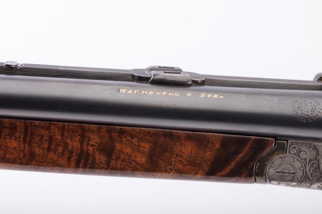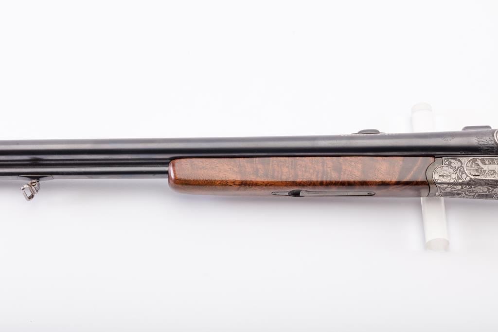 Fine quality Pre-War Drilling inlaid in gold on the barrel “A. Loeschl Hofidferant, Magdeburg and Suhl”. The action is master engraved in game scenes and scrolls. Marked 16GA/8.8MM with nitro proofs and Krupp steel. The barrels show 95% plus original blue with most case colors just faded slightly. Mounts for claw scope, cocking indicators, side safety, and set triggers on rifle barrel. The stocks are in very good plus to almost finecondition also and the fore end is an old well matched replacement. The bores are bright and the gun is mechanically sound. Very impressive. Measures 44” overall with 27 ½” barrels. (C&R) Est.: $1400-$2800