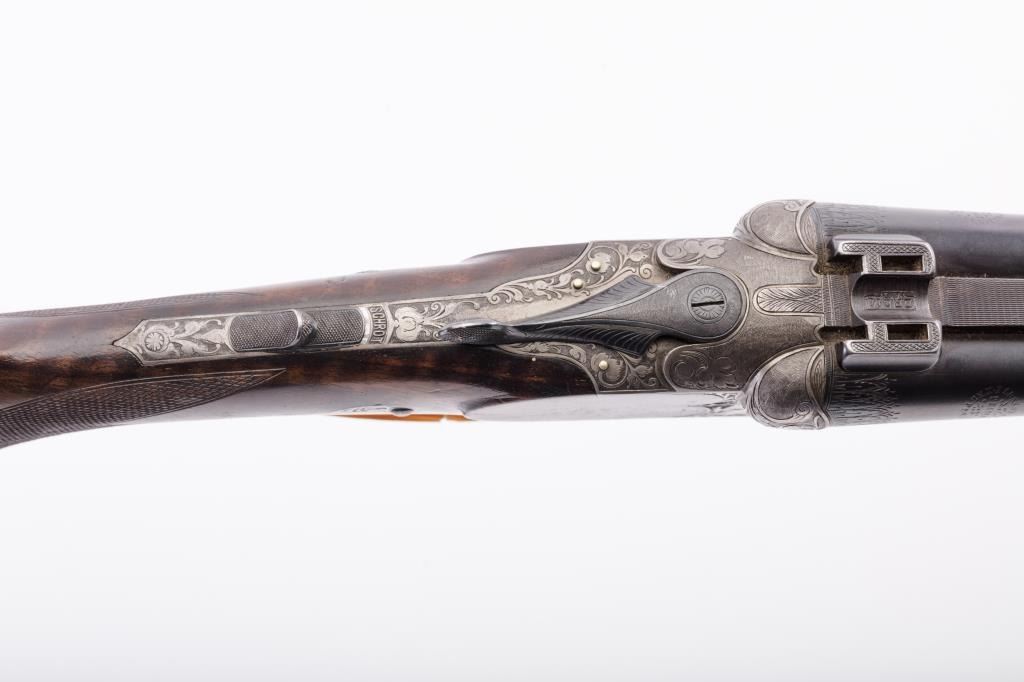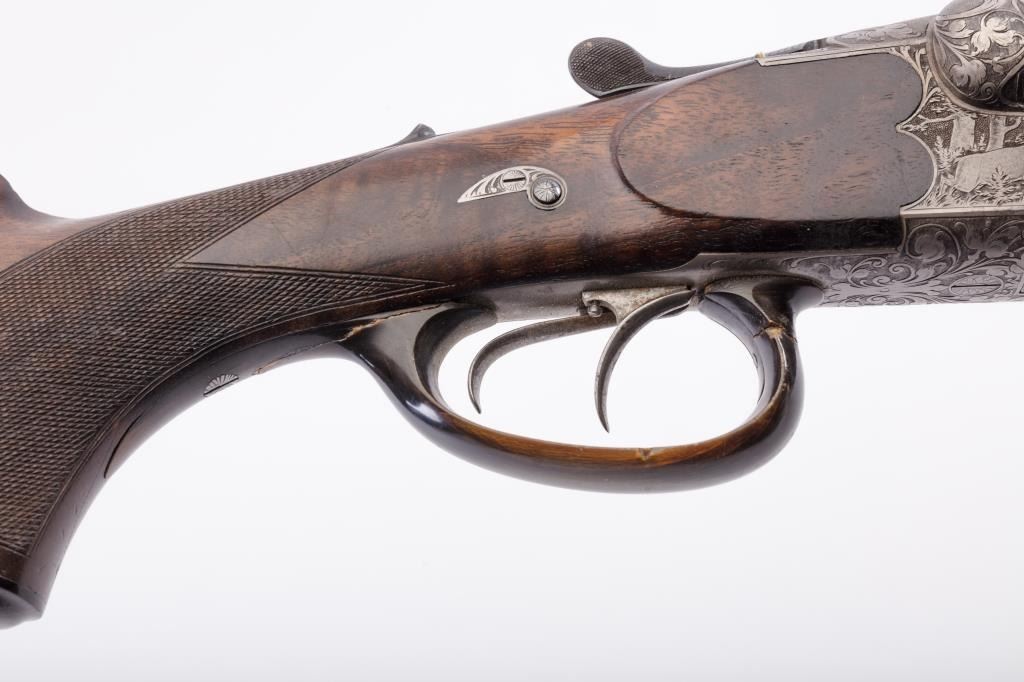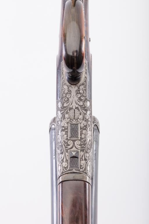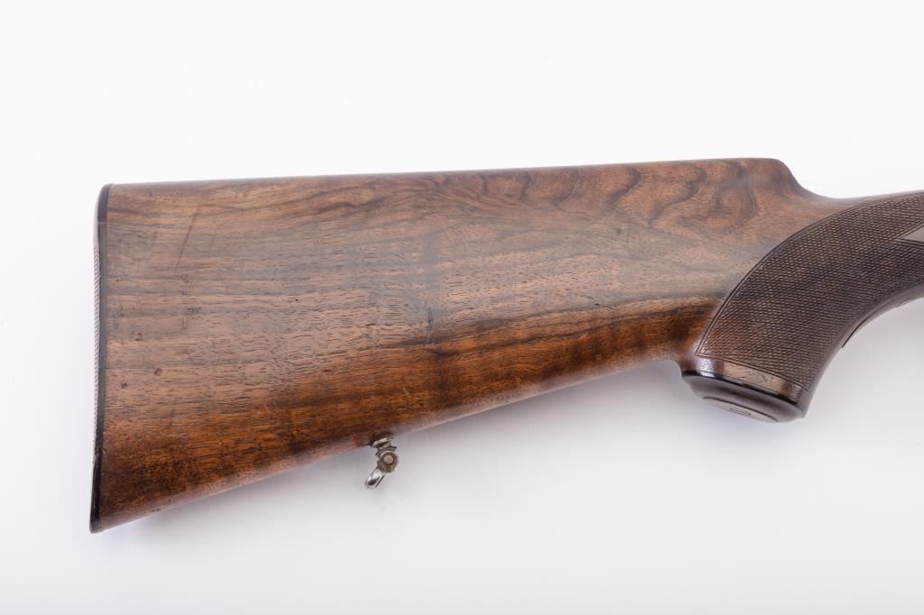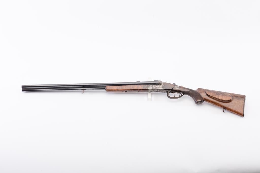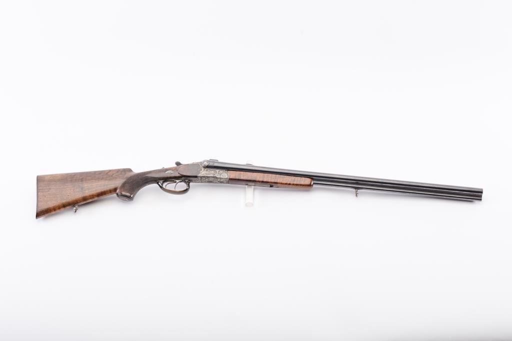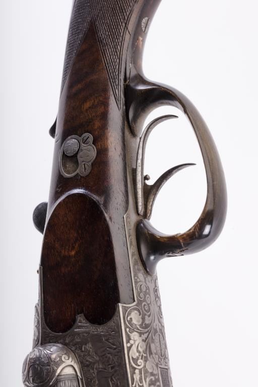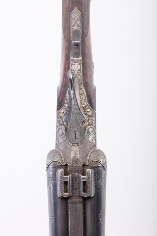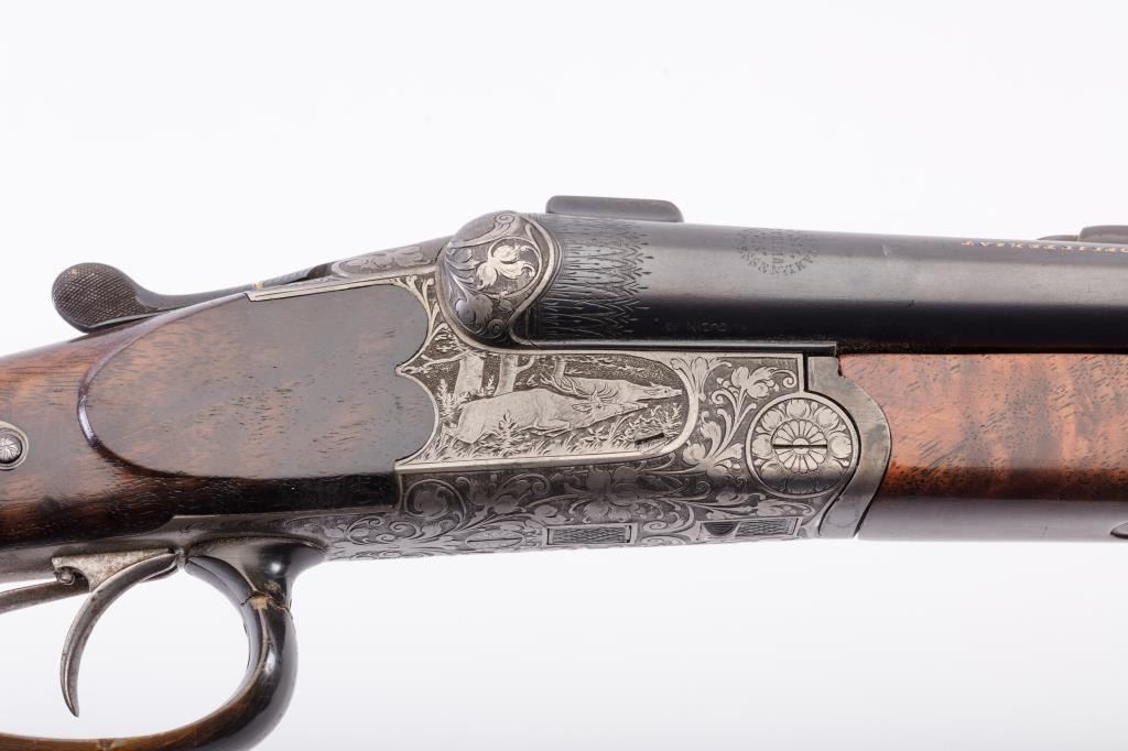 Fine quality Pre-War Drilling inlaid in gold on the barrel “A. Loeschl Hofidferant, Magdeburg and Suhl”. The action is master engraved in game scenes and scrolls. Marked 16GA/8.8MM with nitro proofs and Krupp steel. The barrels show 95% plus original blue with most case colors just faded slightly. Mounts for claw scope, cocking indicators, side safety, and set triggers on rifle barrel. The stocks are in very good plus to almost finecondition also and the fore end is an old well matched replacement. The bores are bright and the gun is mechanically sound. Very impressive. Measures 44” overall with 27 ½” barrels. (C&R) Est.: $1400-$2800