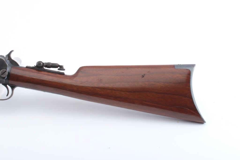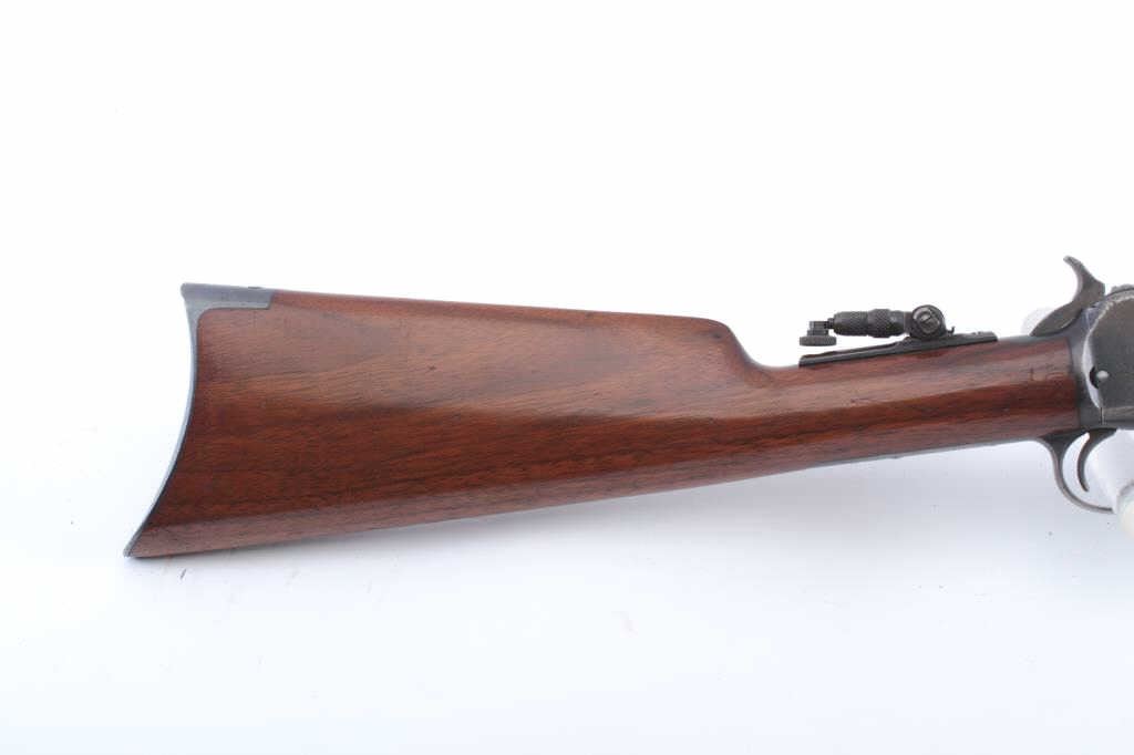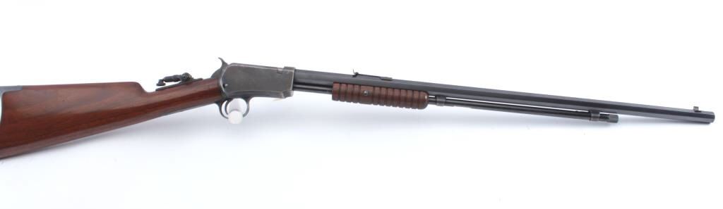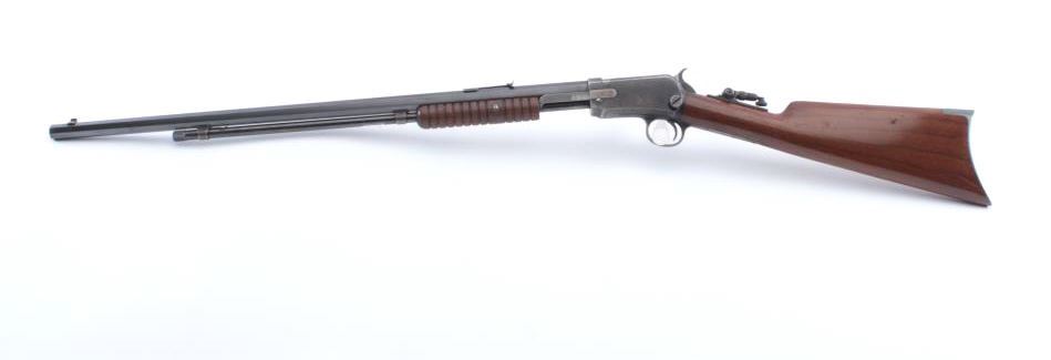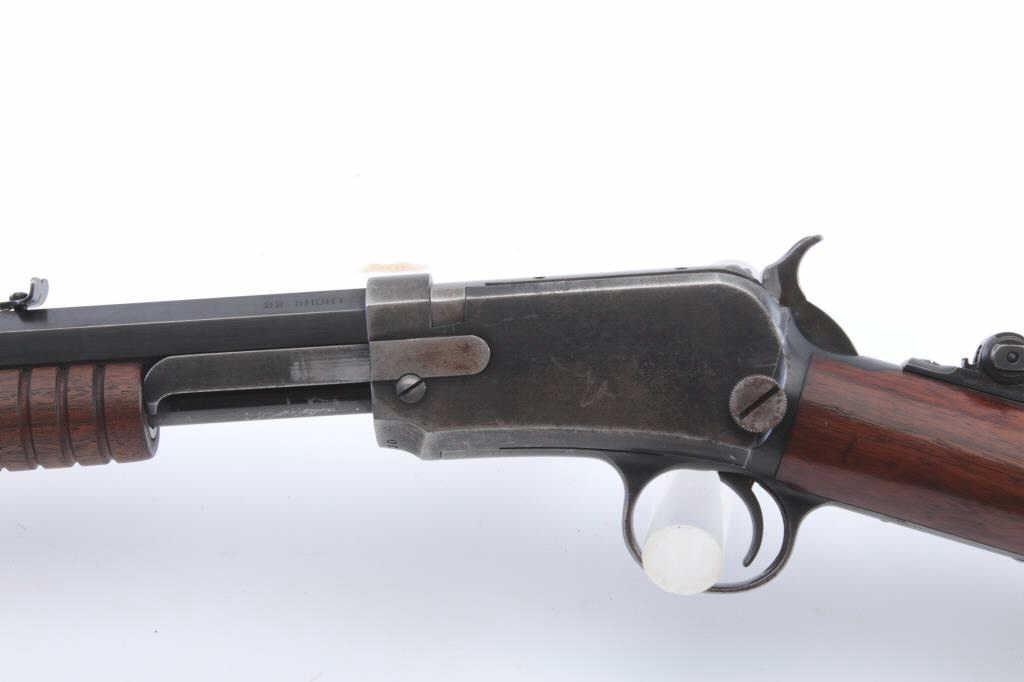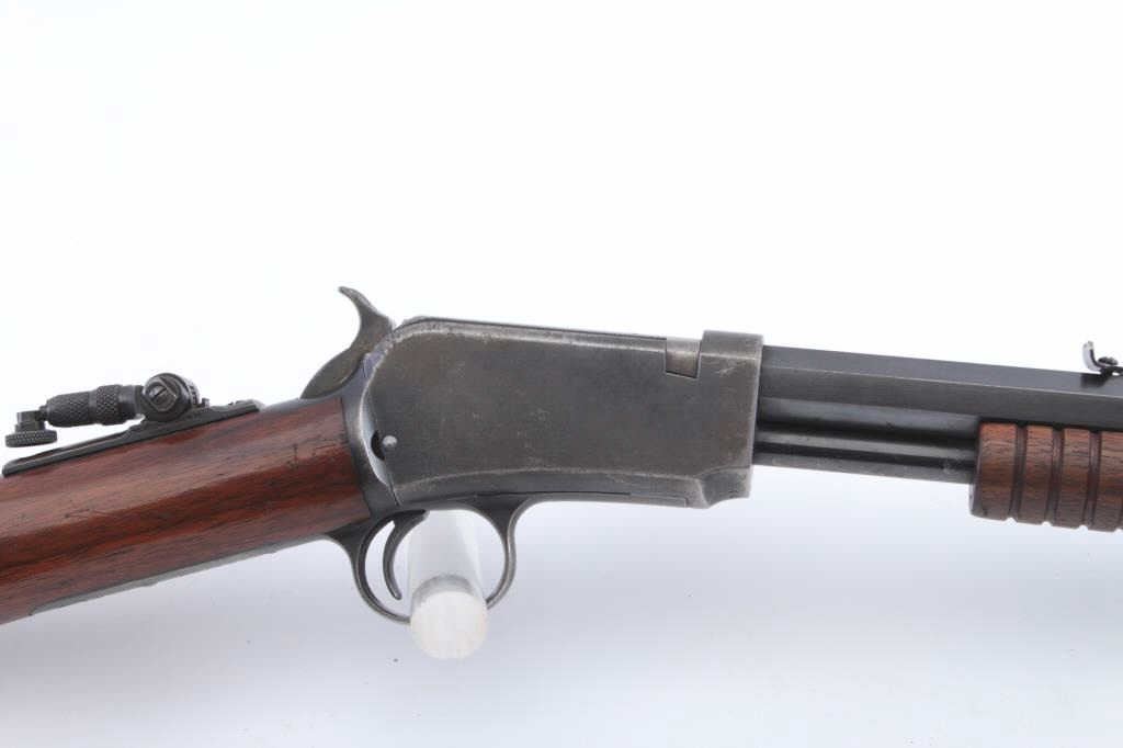 Winchester Model 1890 pump action rifle, .22 Short caliber, Serial #441730. The rifle is in fine overall condition with a 24” octagon barrel with a ¾ length magazine. The barrel and magazine retain approximately 90%-95% ofthe original blue finish with sharp edges and areas of flaking finish on the tube. The receiver is a mixture of toning blue and brown patina with a period Marbles tang sight added. The smooth wood stock is in verygood condition with mars and scrapes associated with field use. The butt ends with a smooth steel crescent butt plate. The bore is bright, the action is crisp and the markings are sharp. Est.: $600-$1,200.(C+R).