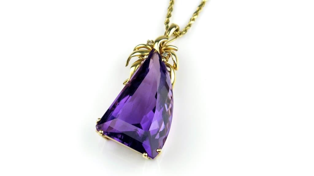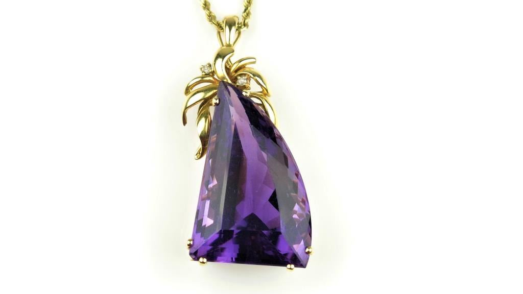 Artistic Vintage Estate Amethyst Pendant featuring an approx. 30.00 carat one of a kind Fantasy cut Amethyst with rich color and custom setting with high quality rope style chain all crafted in 14 karat yellow gold.Retail $3,000-$4,000 Estimates $1,500-$2,000
