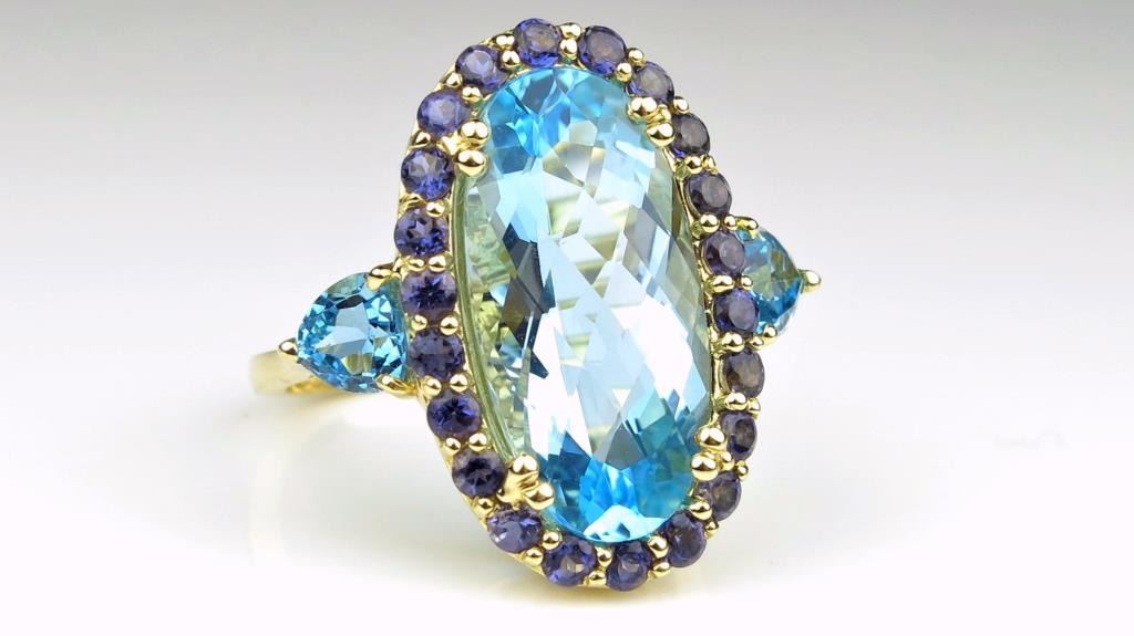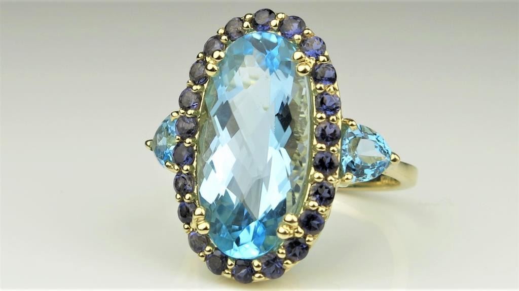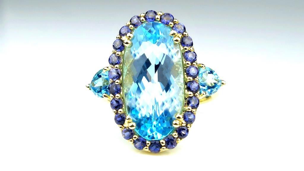 Vibrant Swiss Blue Topaz Ring featuring an approx. 12.00 carat Topaz beautifully accented by Blue Iolites (water sapphires) set in 14 karat yellow gold setting. Estimates $1,500-$2,000