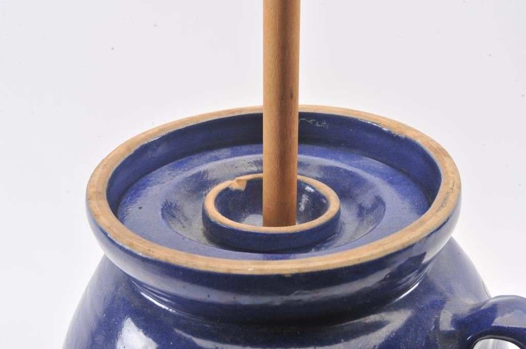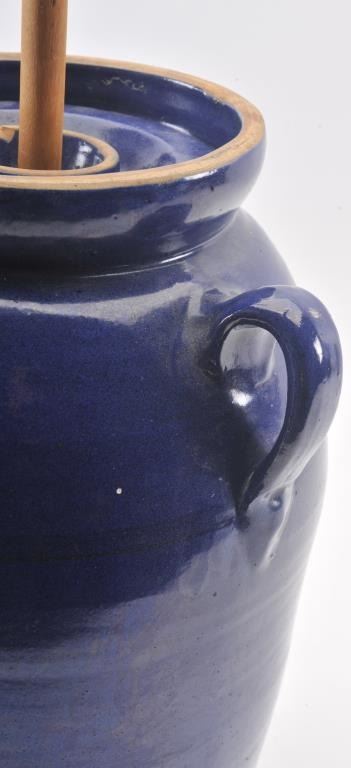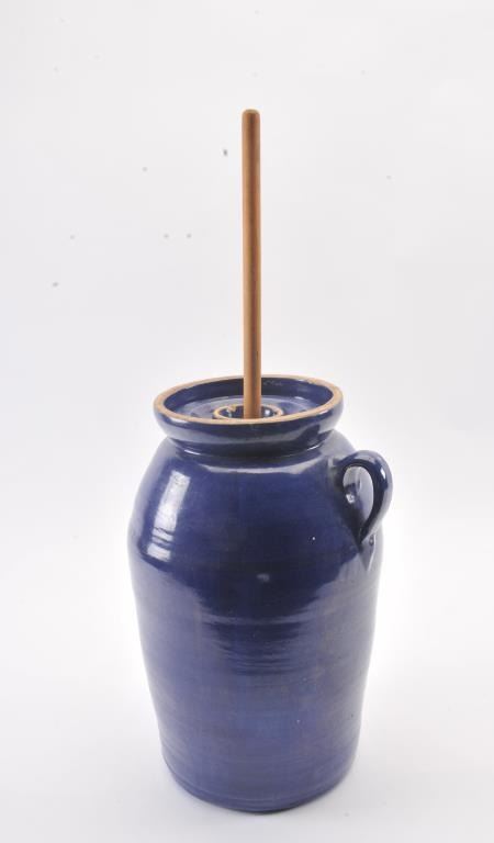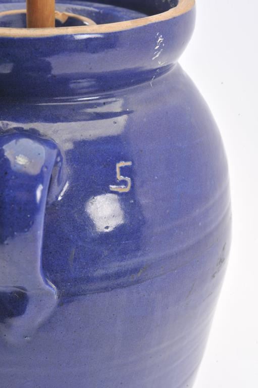 Vintage large butter churn crock approximately 17” in height and fire blue finish; great decorator piece. Est.: $50-$100.