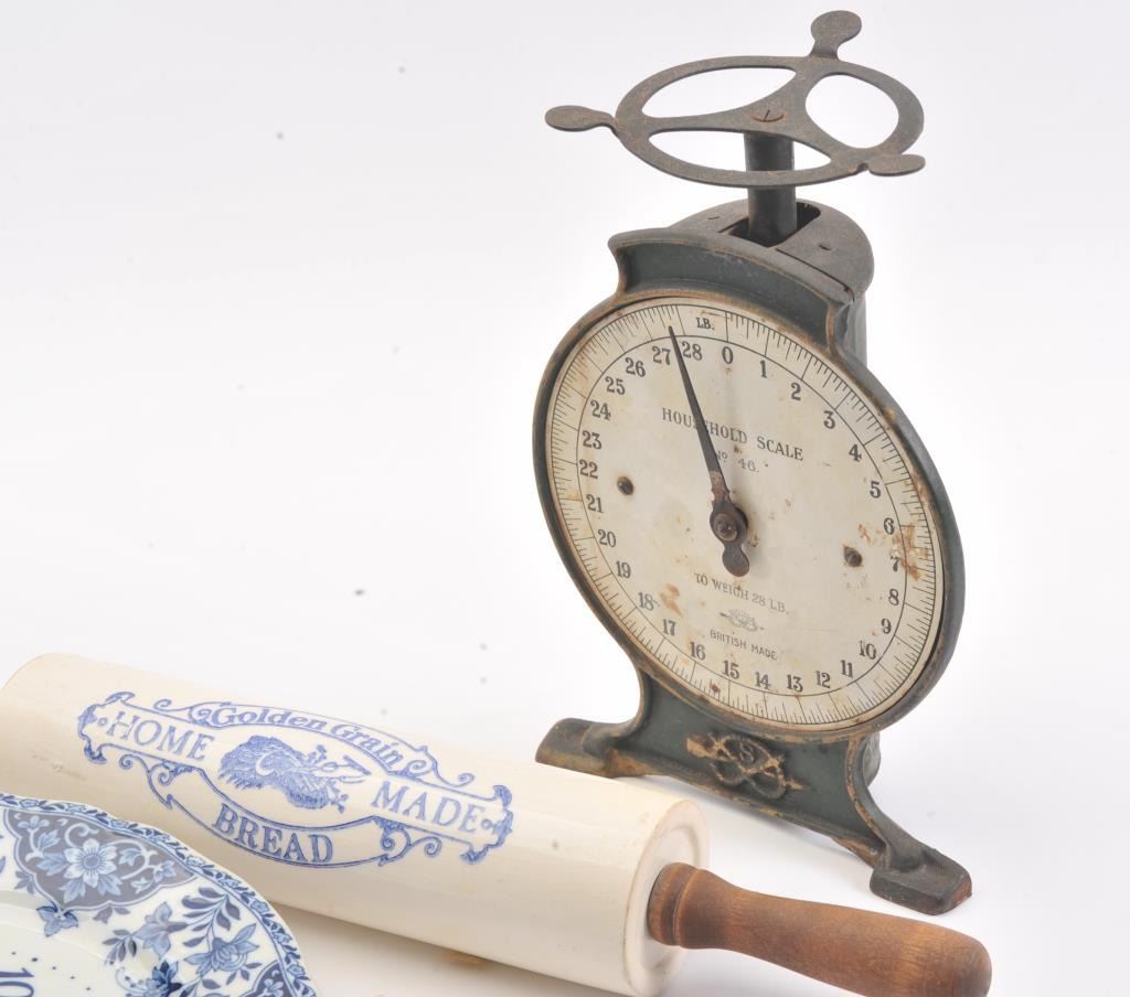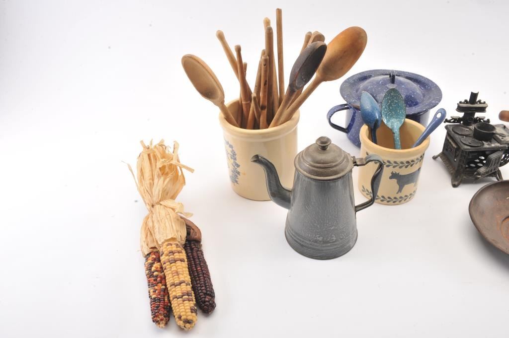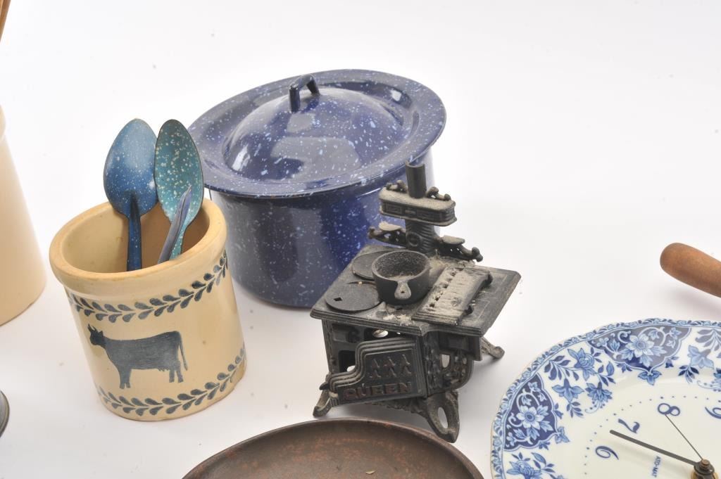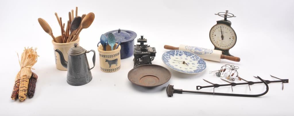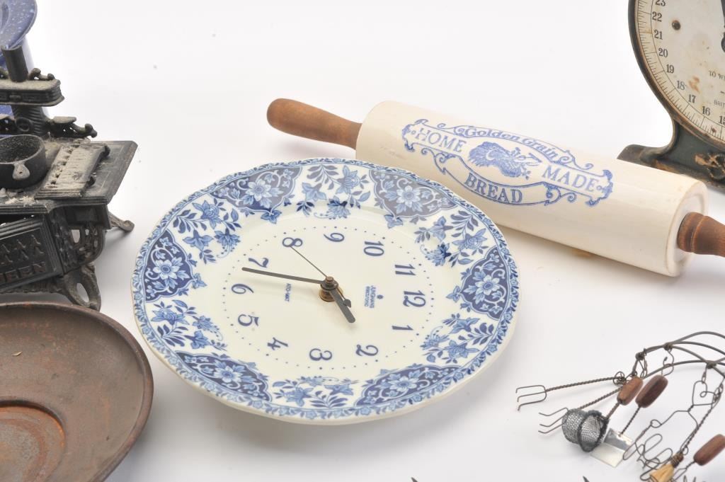Knick Knack lot of kitchen wear including: a vintage scale, wooden spoons, enameled pot with lid, coffee pot, scale, ceramic rolling pin and flow blue style ceramic wall clock. The items are in good overall condition.Est.: $25-$50.