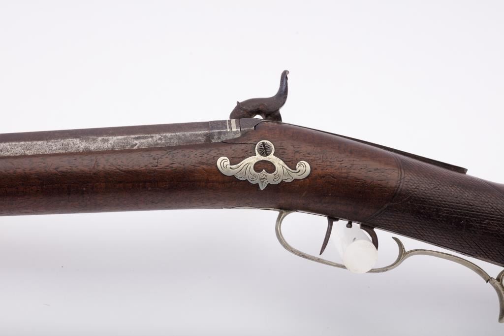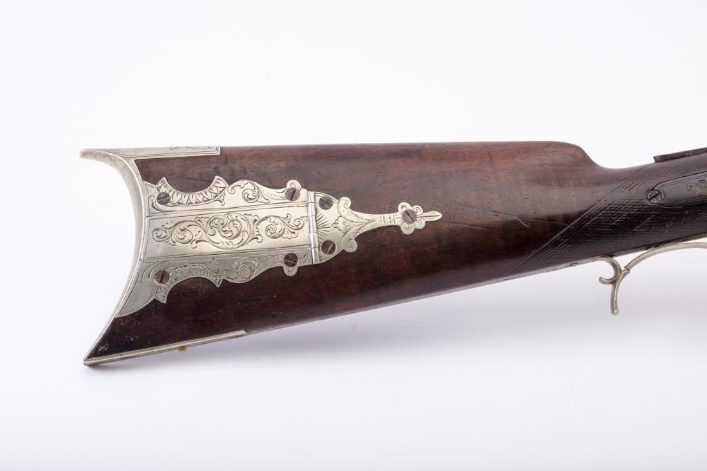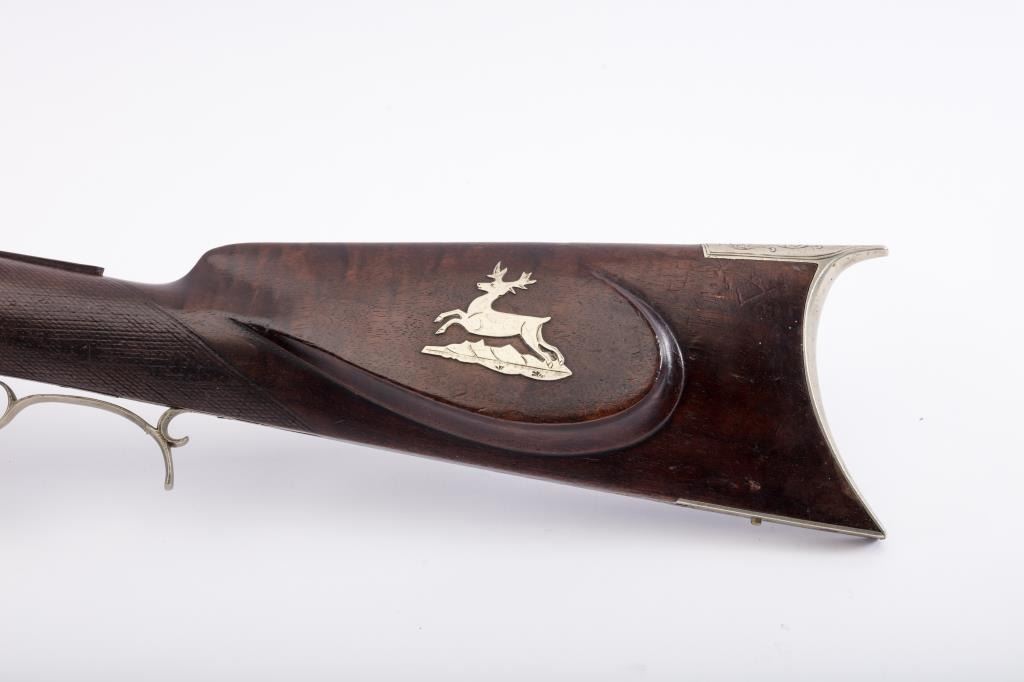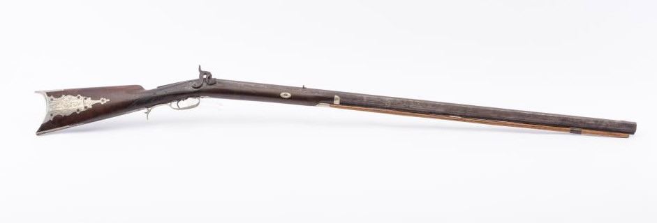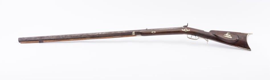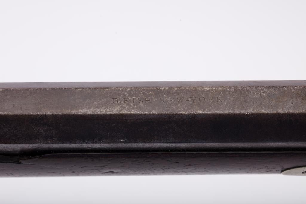 Fancy Half stock Percussion plains rifle with German silver engraved patch box and decorated mounts signed “D. Fish New York” with .50 caliber rifled octagon barrel of medium to slightly heavy weight measuring 41” in length and 7/8” across the center of the muzzle to outside edges. Very nice engraved patch box with butt plate and mounts all nicely engraved en-suite. A large inlay of jumping stag is inlaid into the cheek piece.The stock shows light and simple checkering at the wrist. Double set triggers with V notch and blade front sight. The action and triggers are working well. The rear tang screw is missing. The condition is good withoverall brown patina showing minor erosion, rust and light to moderate scattered pitting. The top edge of the stock shows slivers of wood missing on each side but otherwise good. From an old Northern California collector.58” overall. Est.: (Antique) Est.: $1400-$2800