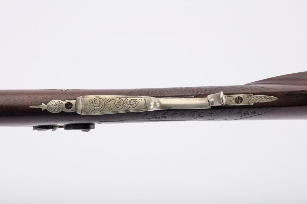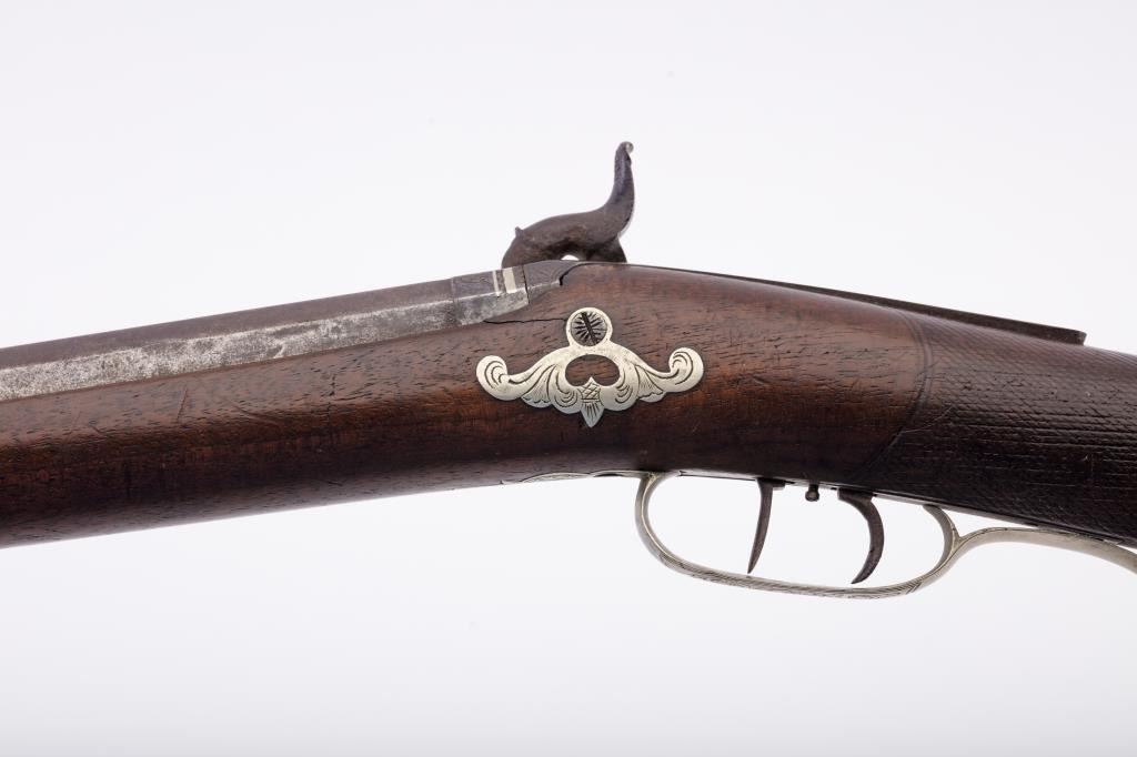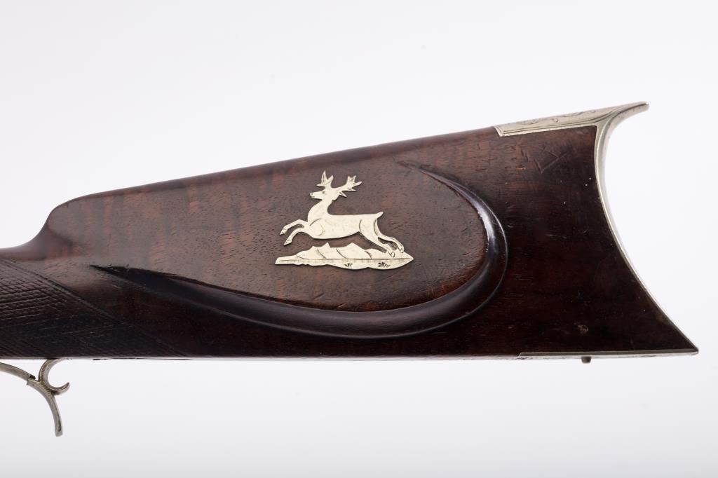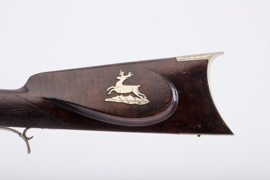 Fancy Half stock Percussion plains rifle with German silver engraved patch box and decorated mounts signed “D. Fish New York” with .50 caliber rifled octagon barrel of medium to slightly heavy weight measuring 41” in length and 7/8” across the center of the muzzle to outside edges. Very nice engraved patch box with butt plate and mounts all nicely engraved en-suite. A large inlay of jumping stag is inlaid into the cheek piece.The stock shows light and simple checkering at the wrist. Double set triggers with V notch and blade front sight. The action and triggers are working well. The rear tang screw is missing. The condition is good withoverall brown patina showing minor erosion, rust and light to moderate scattered pitting. The top edge of the stock shows slivers of wood missing on each side but otherwise good. From an old Northern California collector.58” overall. Est.: (Antique) Est.: $1400-$2800
