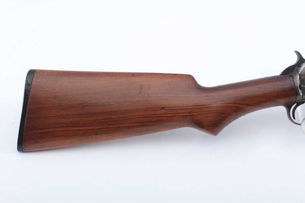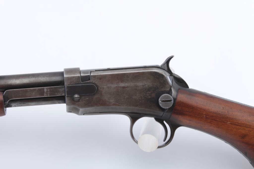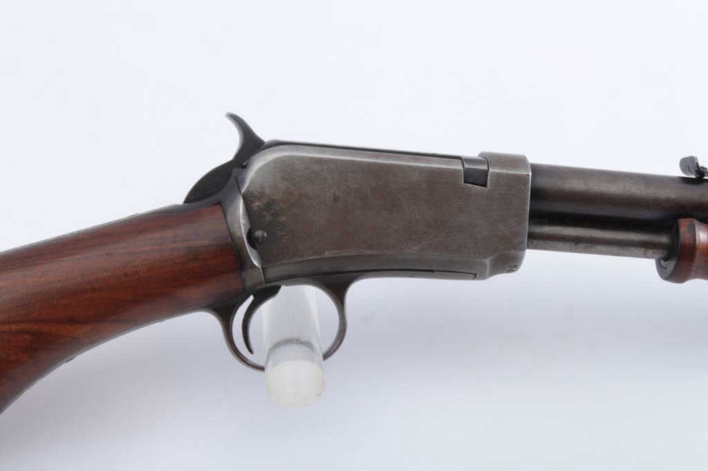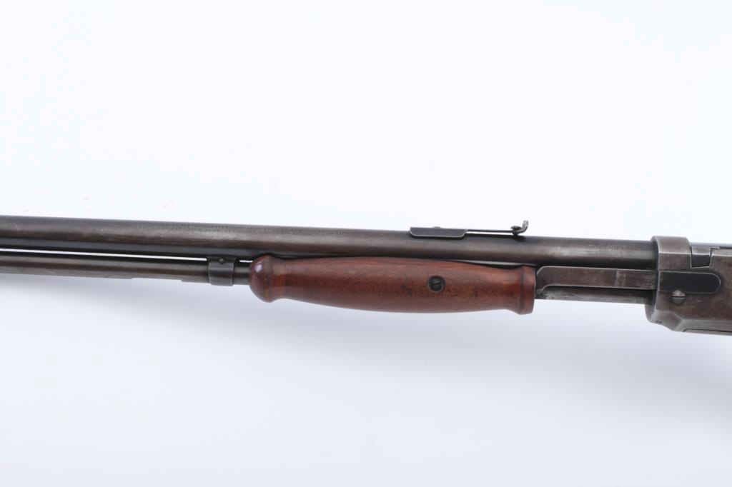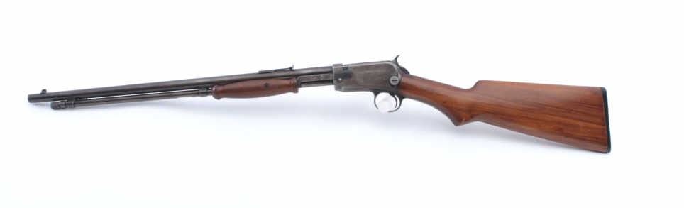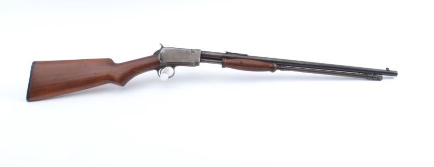 Winchester Model 1906 Marksman pump rifle, .22 Short-Long or Long Rifle caliber, Serial #544682. The rifle is in very good overall condition with a 20” round barrel. The metal surfaces retain a significant amount offlaking blue original finish, particularly on the bolt and in the protected areas with the remainder going to grey patina. The smooth wood stock is in very good condition with a pistol grip and hard rubber butt plate. Thebore is fair, the action is crisp and the markings are sharp. Est.: $600-$1,200. (C+R).