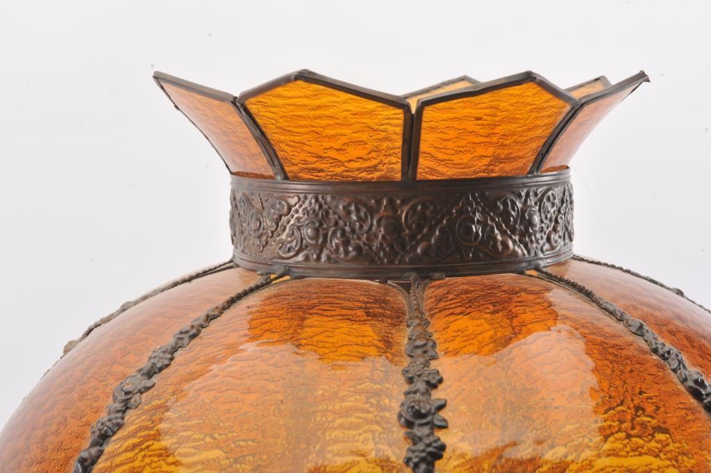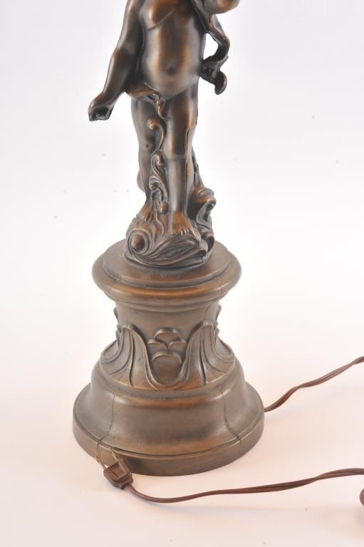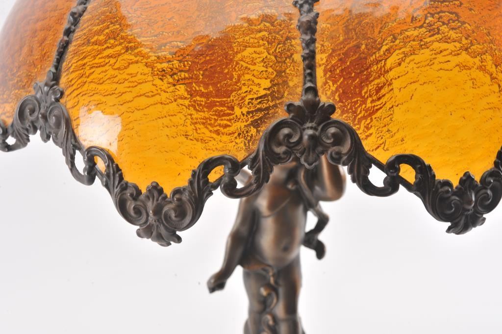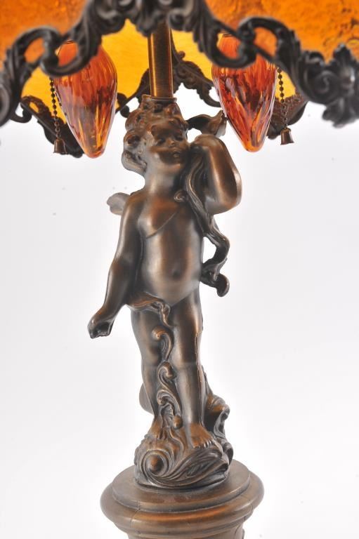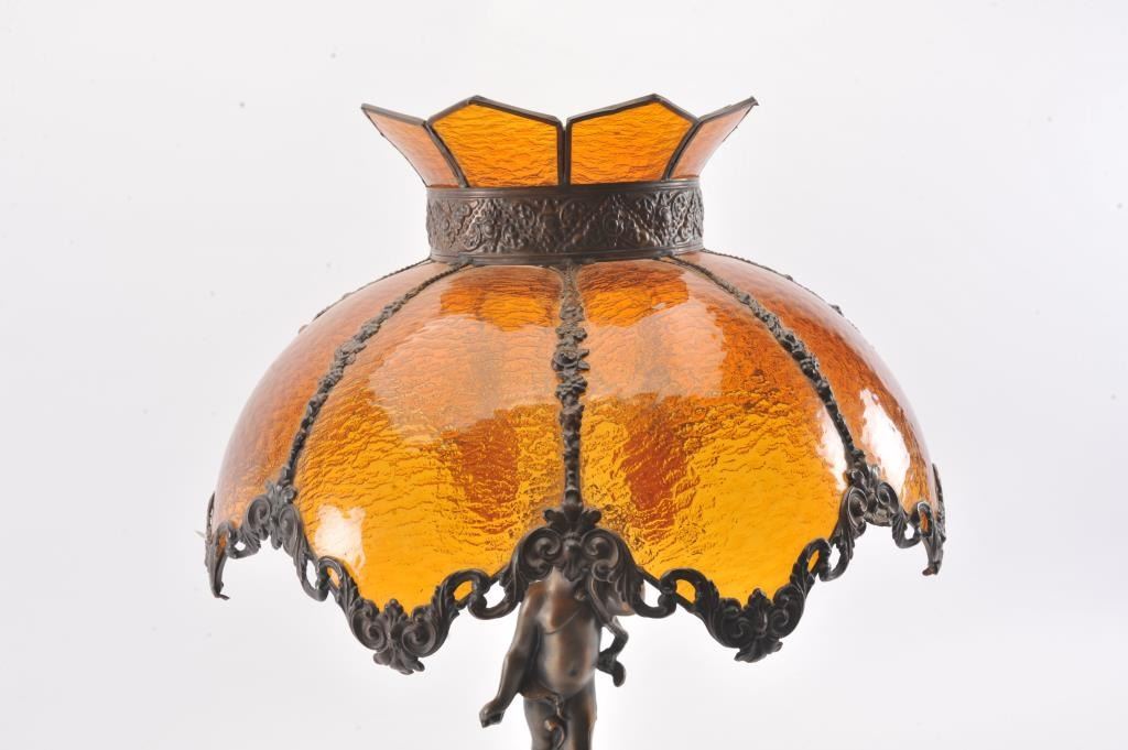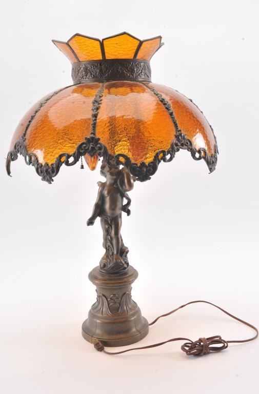 Vintage brass cherub table lamp with amber shade. The lamp is approximately 27” in height with a 19” wide shade. The lamp is in good condition, working at the time of description. Est.: $25-$50.