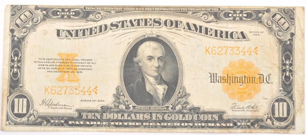 U.S. Series 1922 gold back $10 gold note. K6273344. Not professionally graded. Old collection. Est.: $125-$250