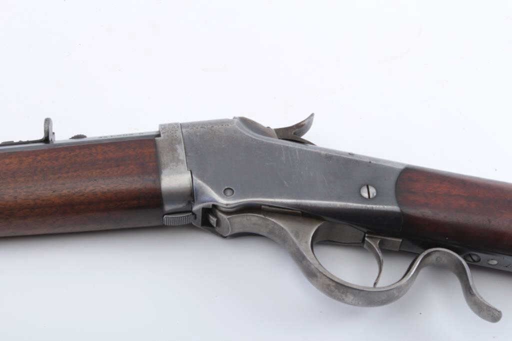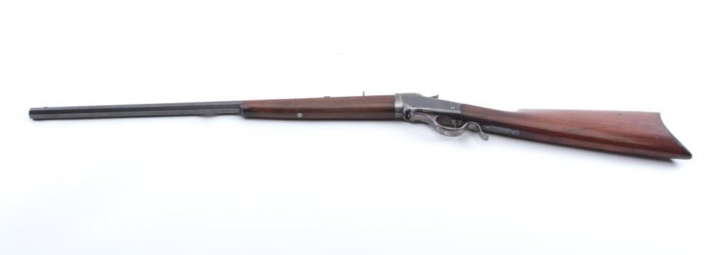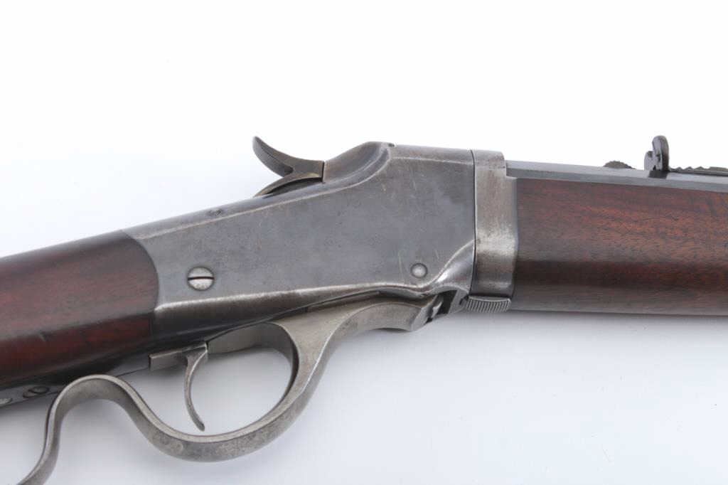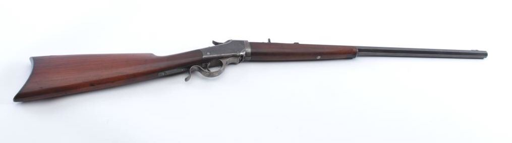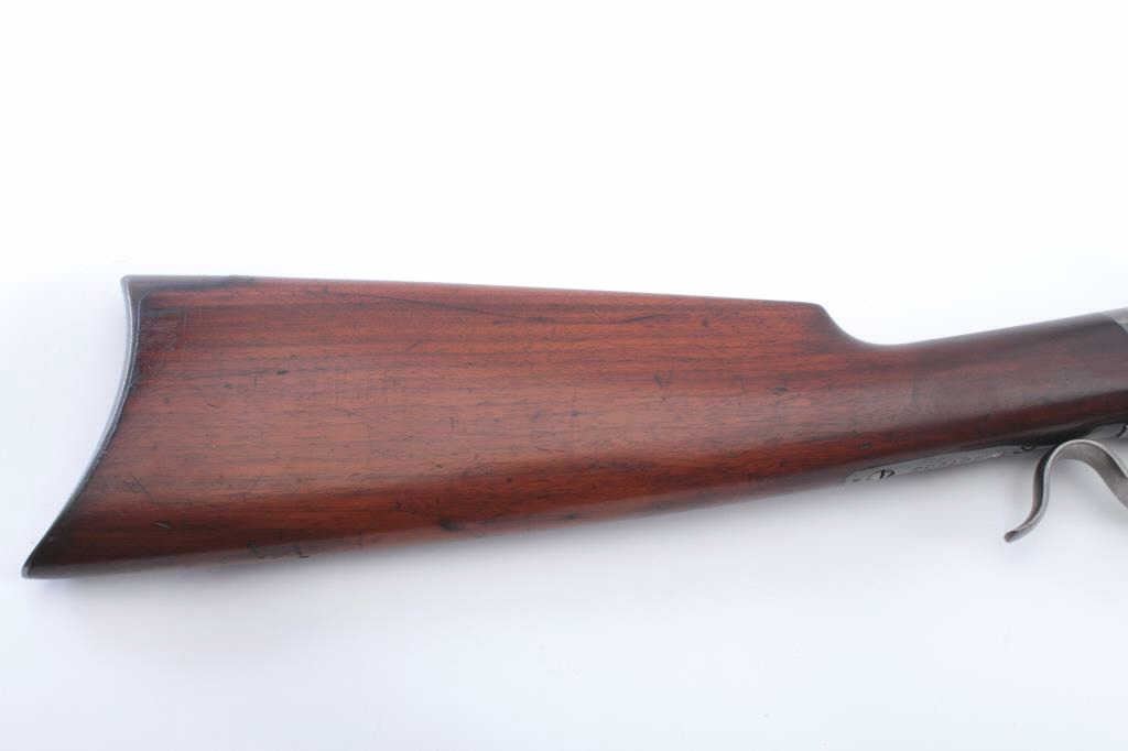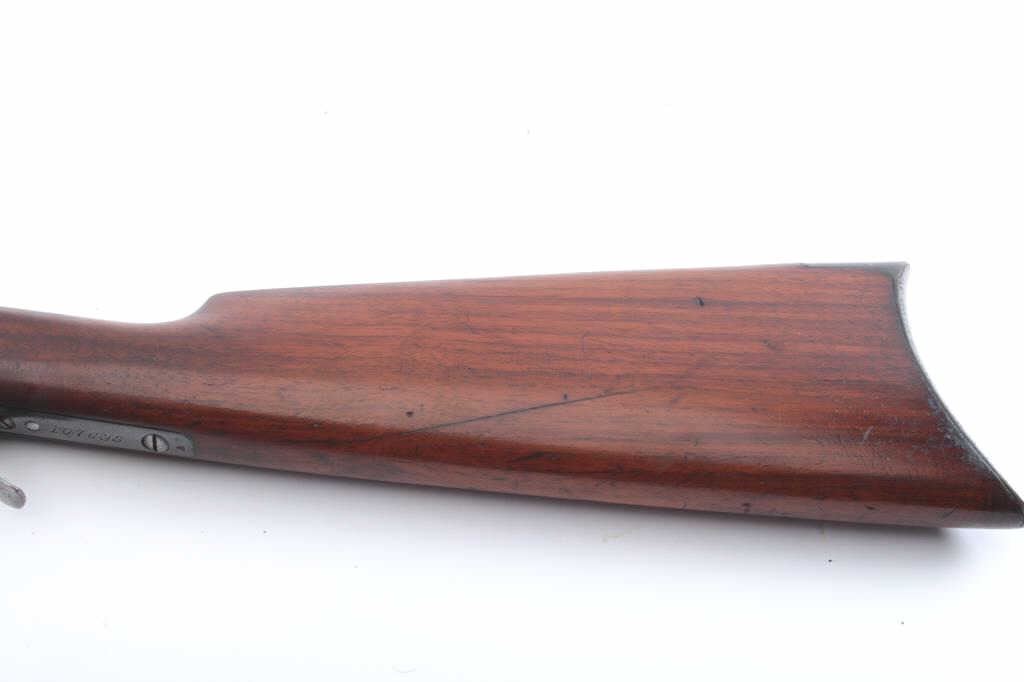 Winchester Model 1885 Low Wall Takedown, #107638, .22 Long Rifle cal., 26" octagon barrel, blued finish with buckhorn sights, plain wood stock with crescent butt. Rifle is in very good condition overall, retaining85%+ original blue, bore is very good with minor corrosion near the chamber, action is good. The stock is very good plus, with minor nicks, dings and blemishes. Overall, a very nice takedown. (Modern) Est.$900-1800
