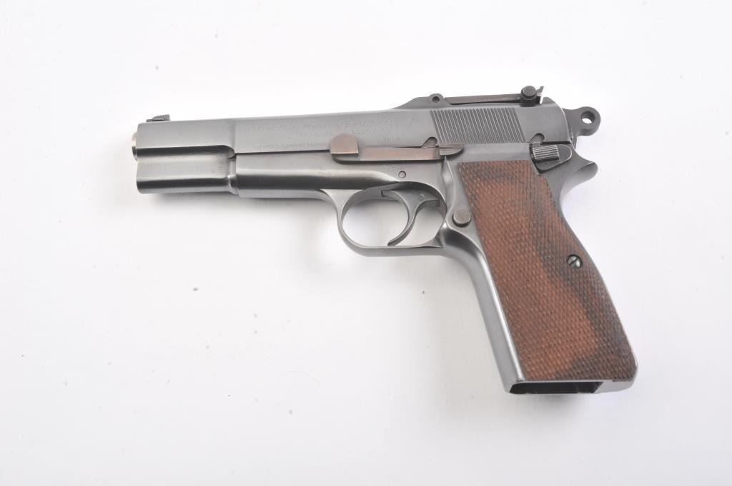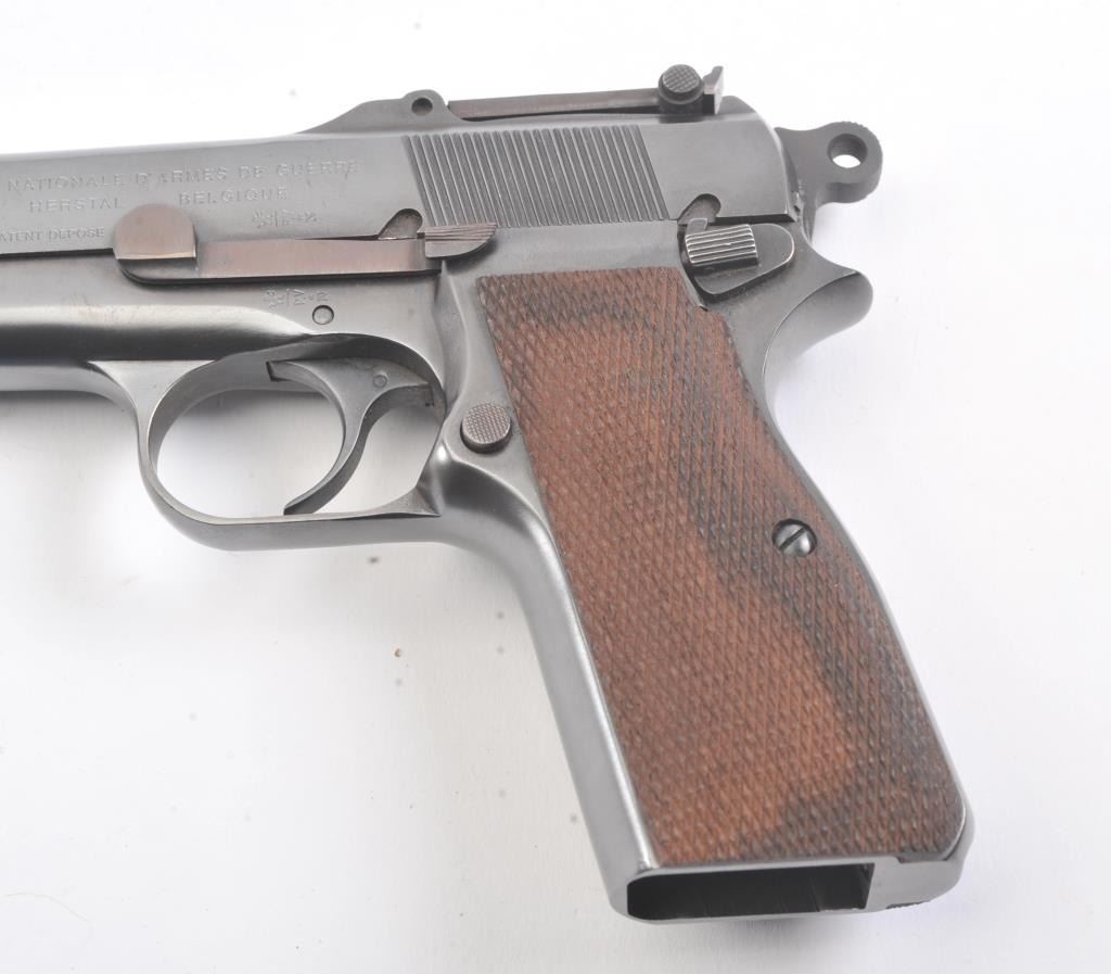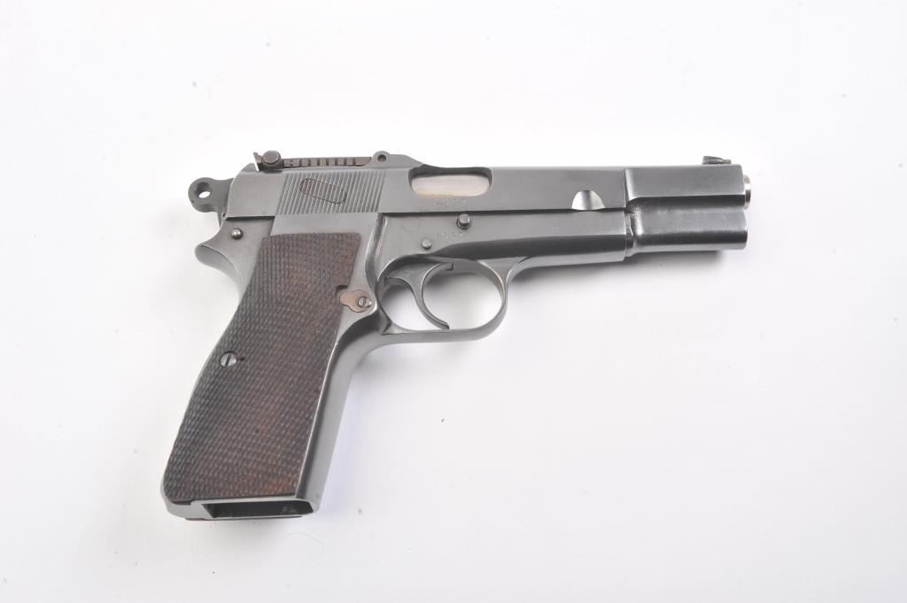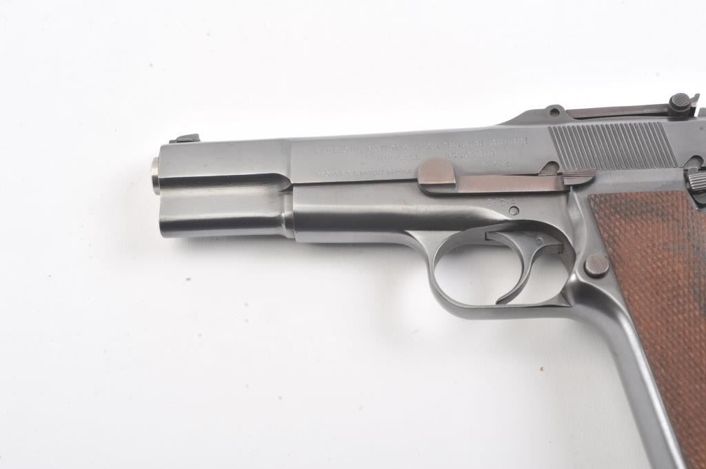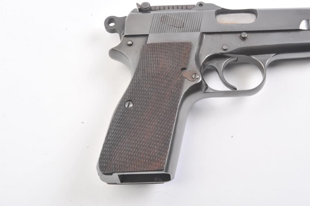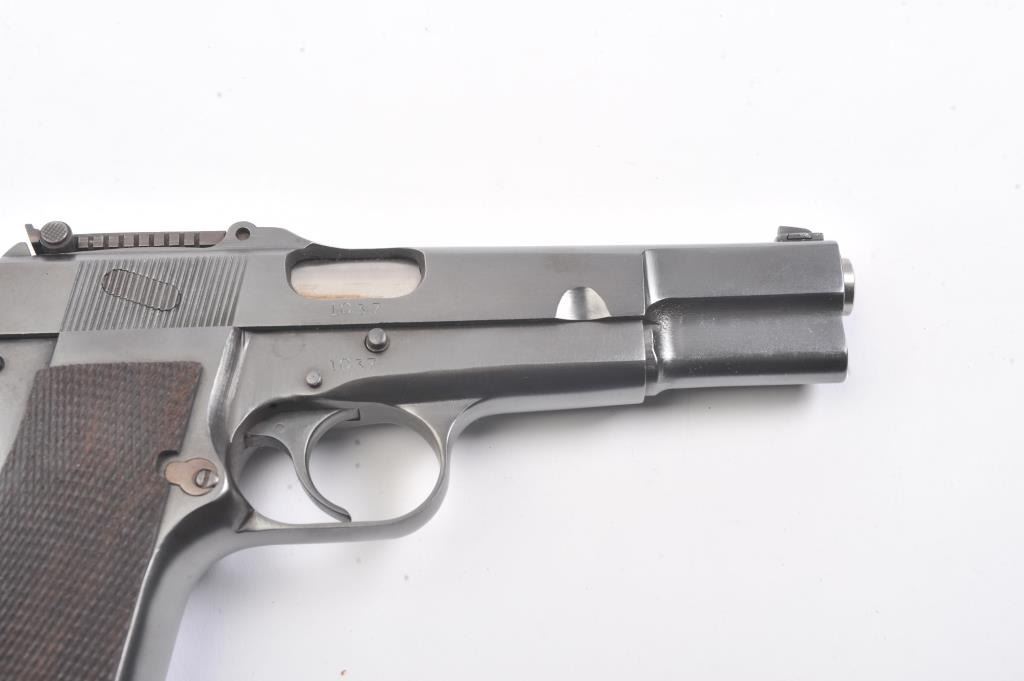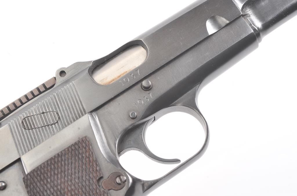 Belgian FN Hi-Power semi-automatic pistol, 9mm caliber, Serial #1037. The pistol is in excellent overall condition as professionally restored. The pistol retains nearly all of a high quality re-finish with Belgian proofs, tangent rear sight, ring hammer and cut for shoulder stock. The checkered wood replacement grips are contoured with sharp checkering. The bore is good, the action is crisp and the markings are sharp on thisearly first or second year production pre-war, pre-Nazi era Hi-Power that has been restored to excellent condition. The lot does not include a magazine. Est.: $900-$1,800. (C+R).