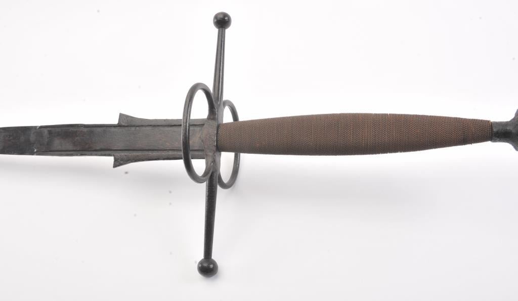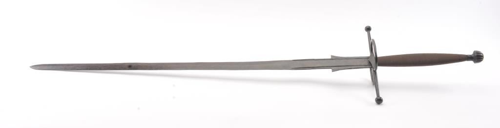 Good European 19th Century copy of a 17th Century two-handed sword. The sword measures 63 ½” overall with a 49” blade. It shows some forging and early style elements. The sword is a true antique probably made bySchmidt or Castle armorer. The piece is over 100 years old. Est.: $500-$1,000.