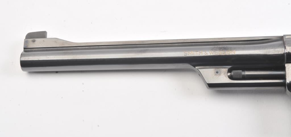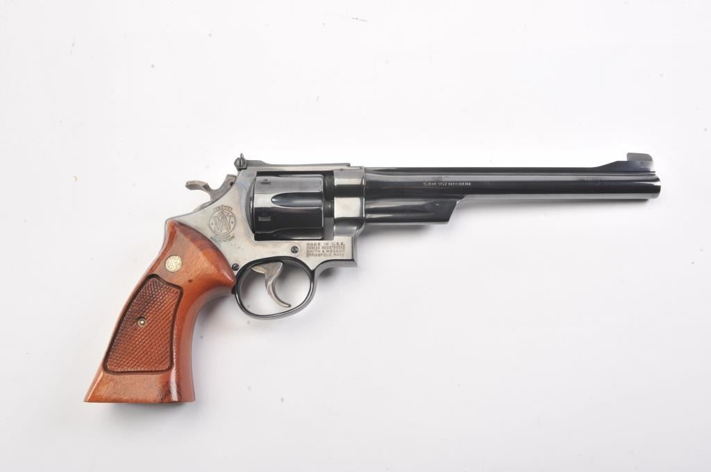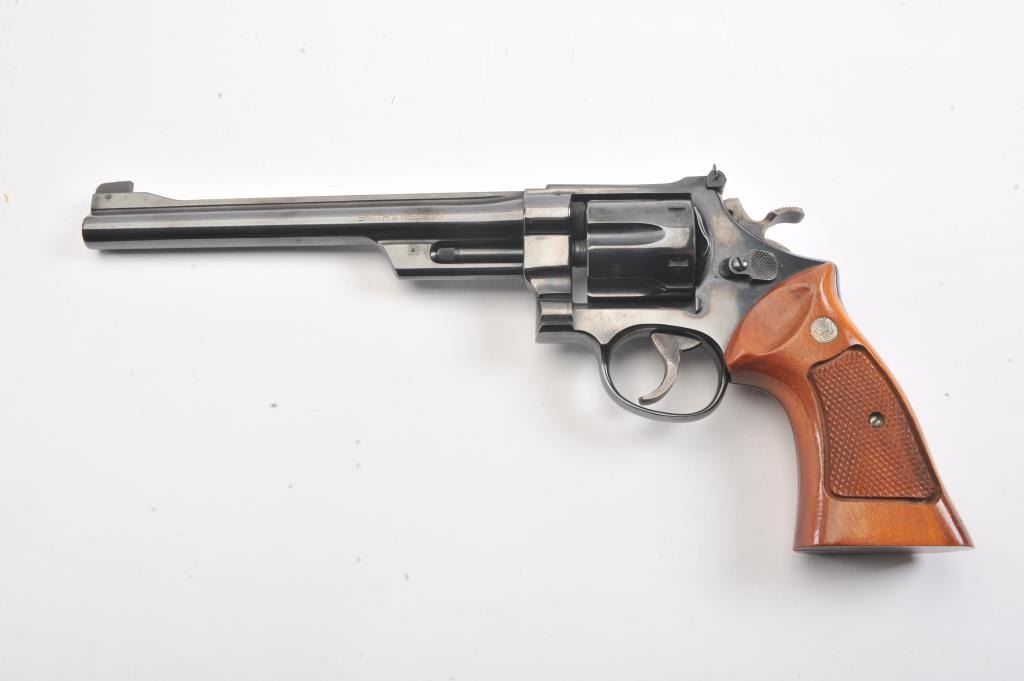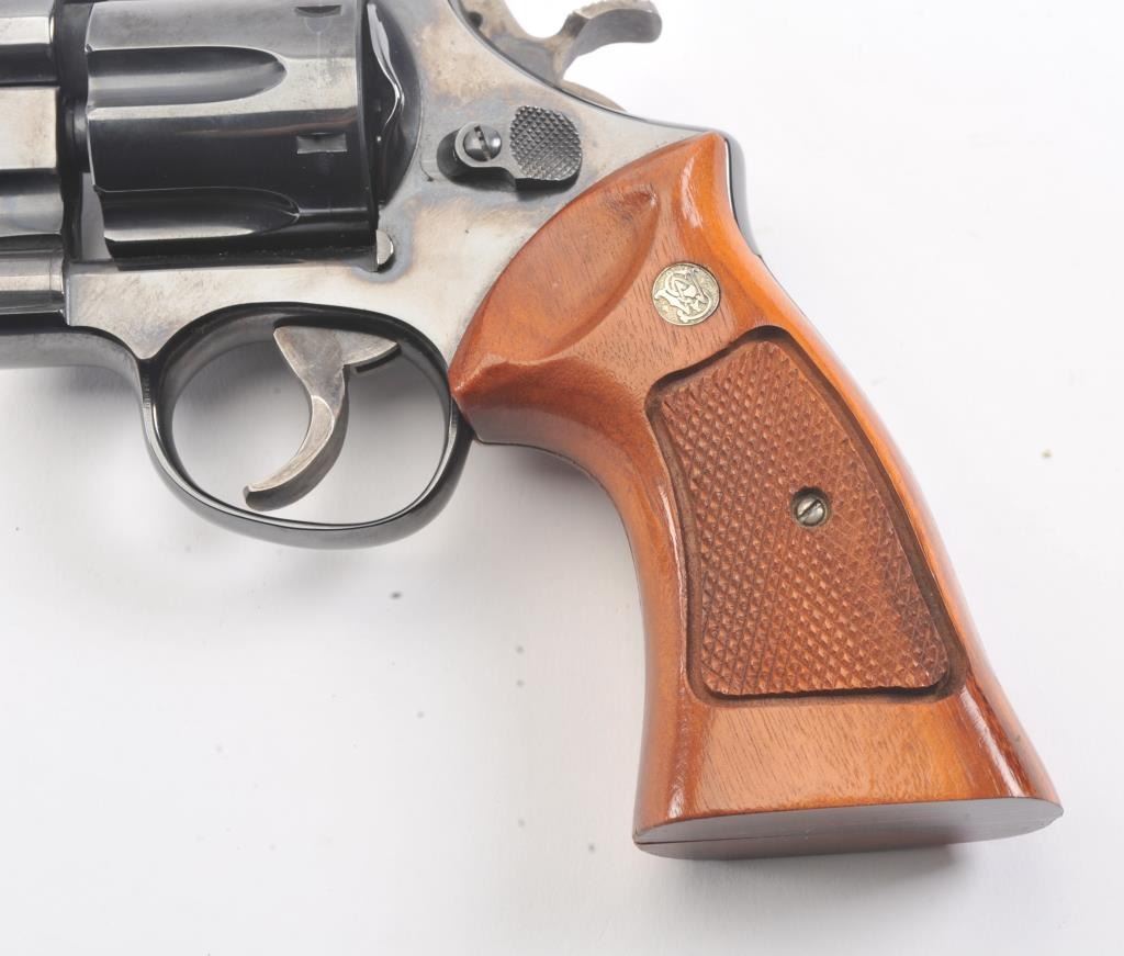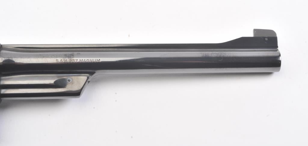 Smith & Wesson Model 27-2 double action revolver, .357 Magnum caliber, Serial #N377872. The pistol is in excellent overall condition with an 8 3/8” pinned barrel with a ramped blade front and adjustable rearsights. The pistol retains approximately 98%-99% of the original finish with light handling marks. The hammer and trigger are both beautifully case hardened. The checkered wood medallion grips are inexcellent condition with sharp checkering. The bore is good, the action is crisp and the markings are sharp. Est.: $700-$1,400. (Modern/PPT).