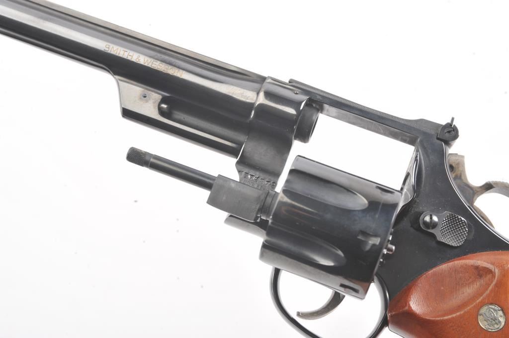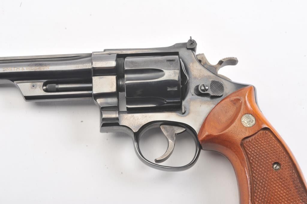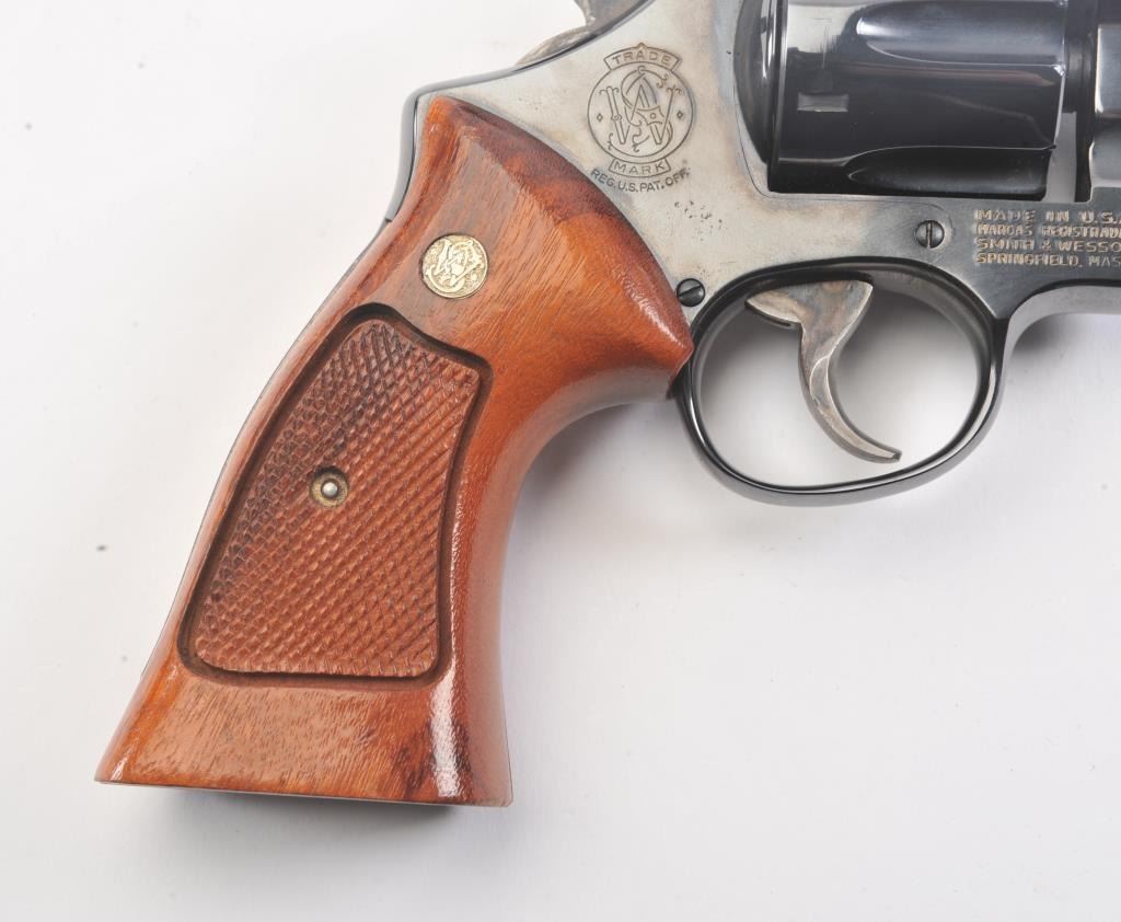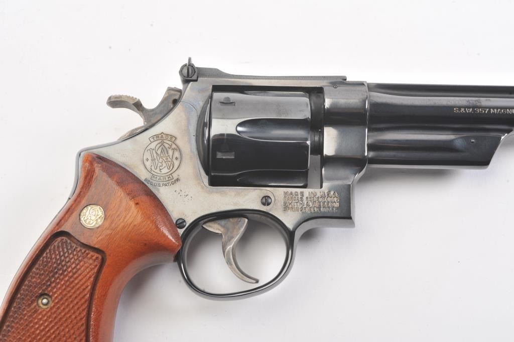 Smith & Wesson Model 27-2 double action revolver, .357 Magnum caliber, Serial #N377872. The pistol is in excellent overall condition with an 8 3/8” pinned barrel with a ramped blade front and adjustable rearsights. The pistol retains approximately 98%-99% of the original finish with light handling marks. The hammer and trigger are both beautifully case hardened. The checkered wood medallion grips are inexcellent condition with sharp checkering. The bore is good, the action is crisp and the markings are sharp. Est.: $700-$1,400. (Modern/PPT).