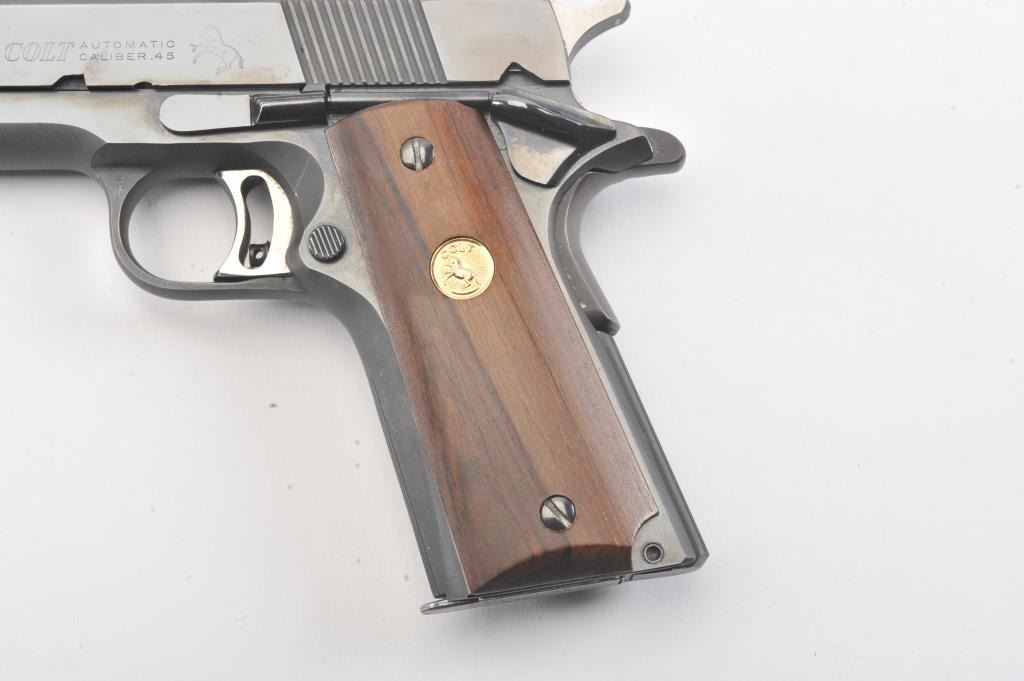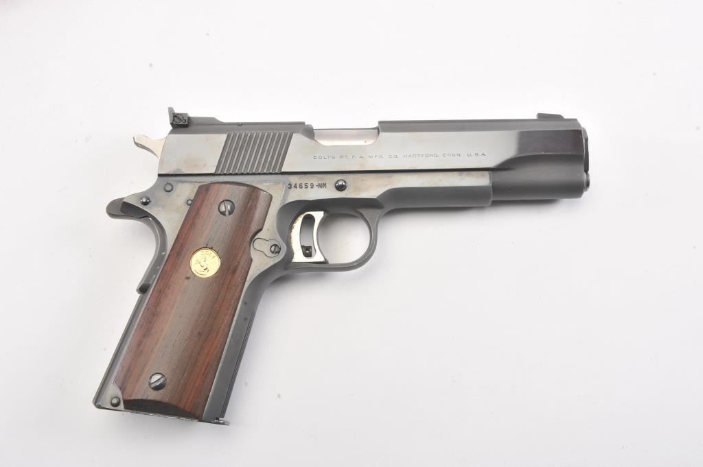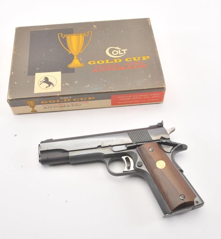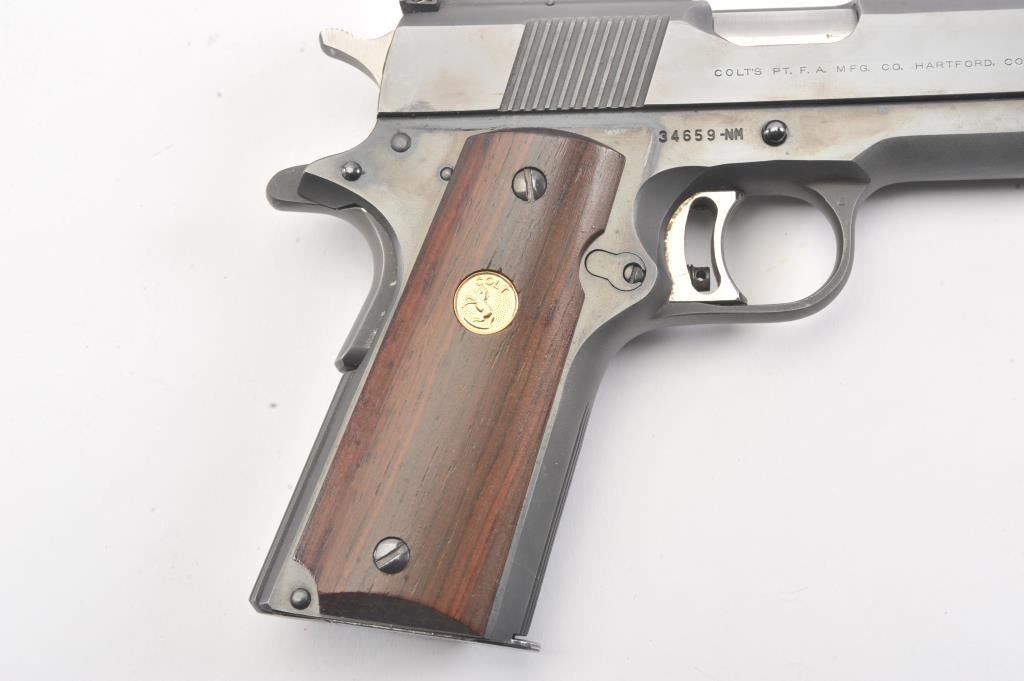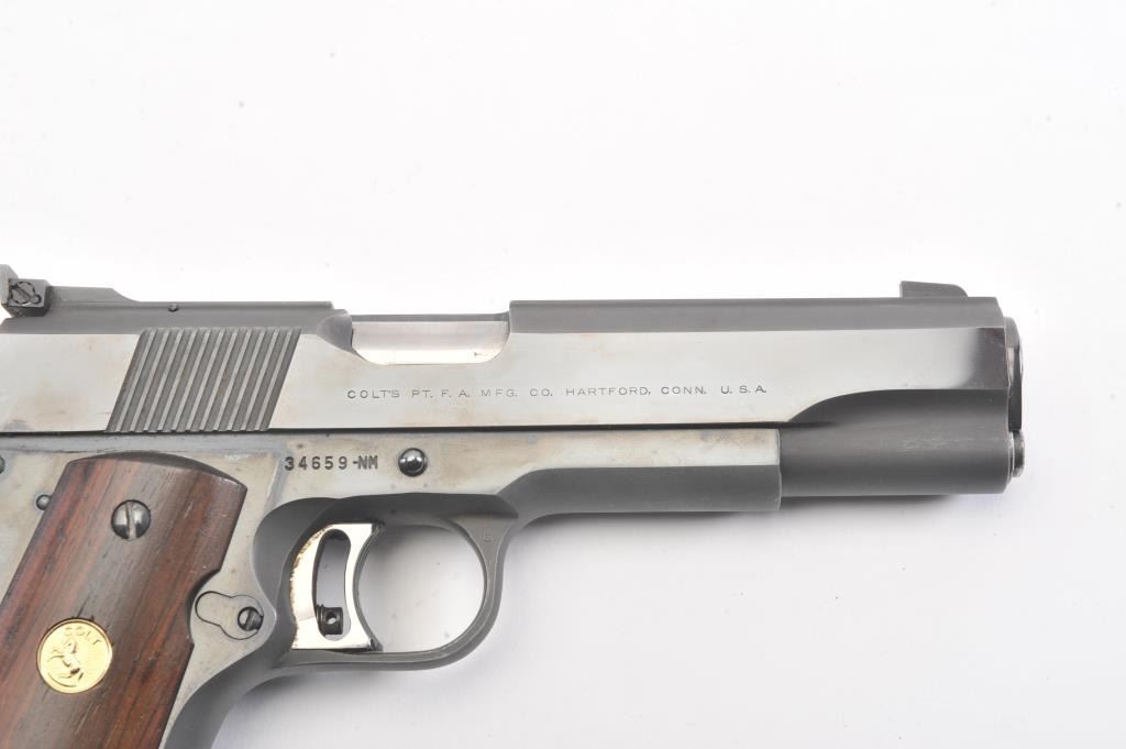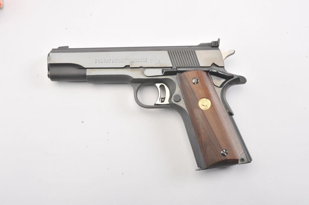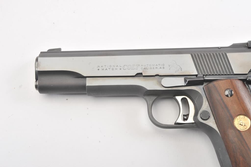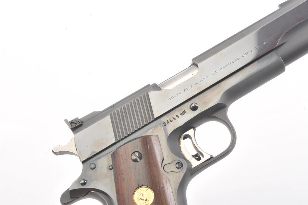 Colt National Match semi-auto pistol, #34659-NM, .45 ACP cal., 5” NM barrel, blue finish, plain wood grips. This gun is in fine condition showing 96-98% original blue, with light scratches, slight thinning on the high points, slide is starting to turn plumb. The bore is bright, good action, grips are near fine. In factory two piece cardboard Gold Cup National Match box, one correct mag. (C&R/PPT)) Est.: $1,000-2,000.