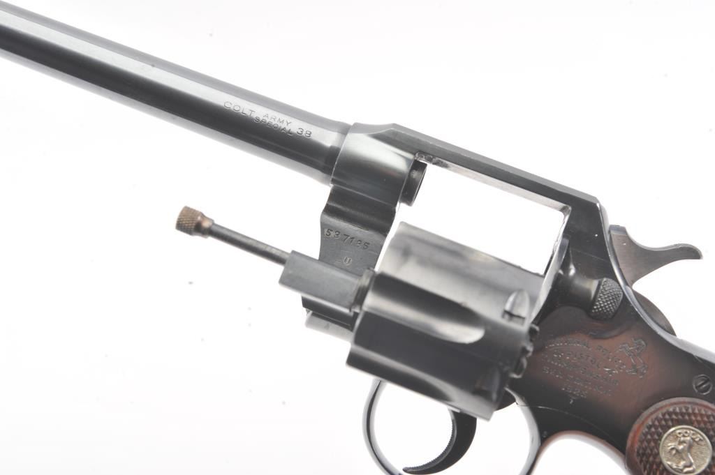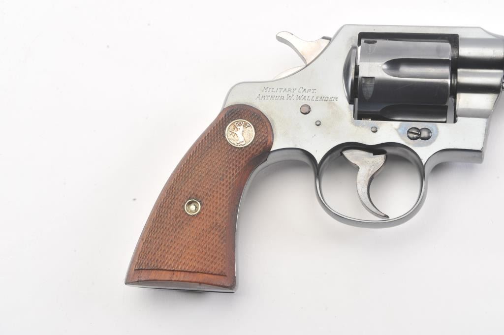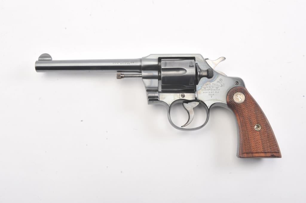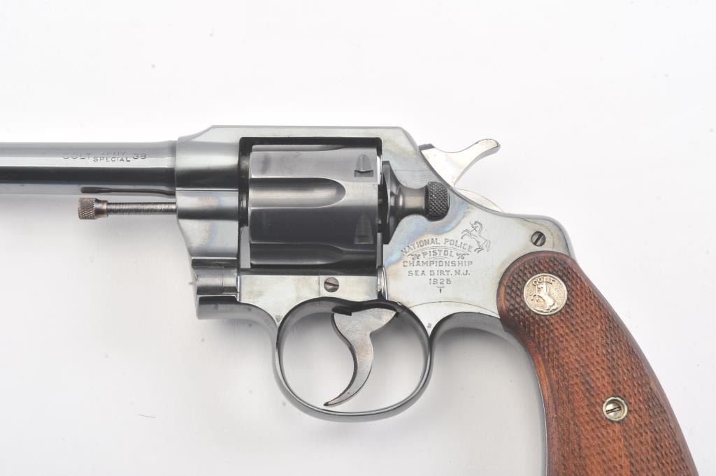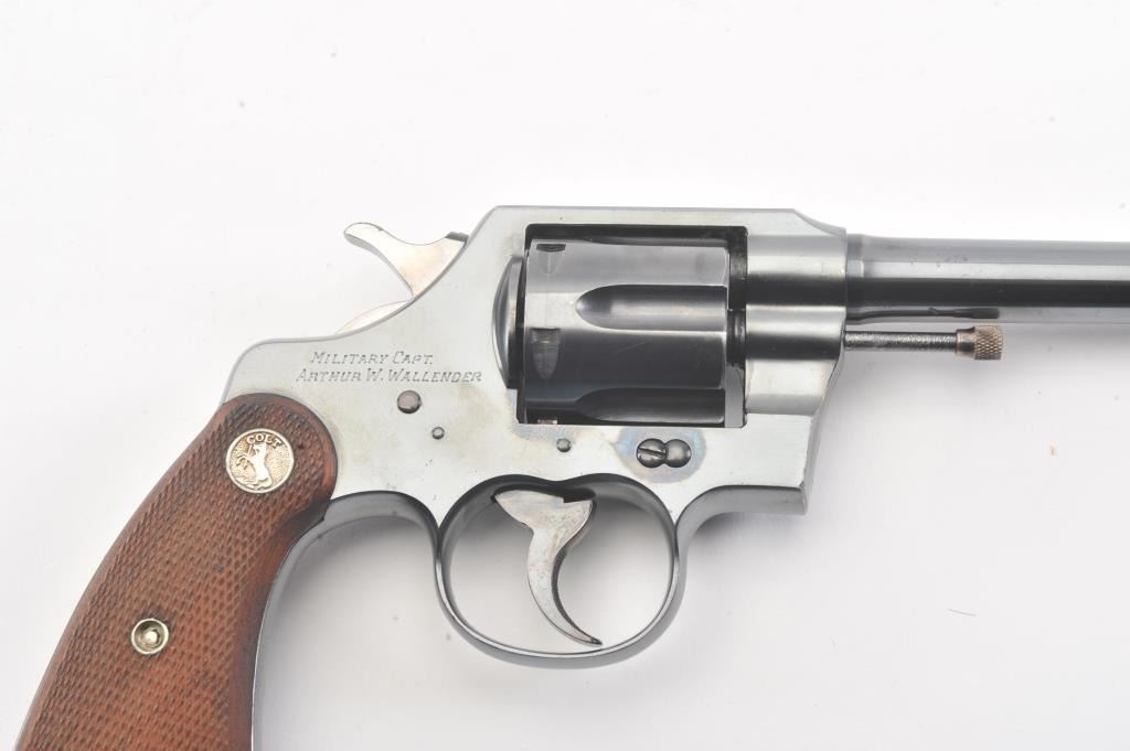 Colt Army Special DA revolver, #537185, .38 cal., 6" barrel, fixed sights, checkered wood medallion grips, with engraved sideplate which says " NATIONAL POLICE / PISTOL / CHAMPIONSHIP / SEA GIRT N. J. / 1926 " and on the right side " MILITARY CAPT . / ARTHUR W . WALLENDER ". The revolver is in near excellent condition overall, retaining 97% original finish, with some minor scratches and imperfections. The bore is about fine,the action is tight, and the grips are fine with crisp checkering, excellent fit and finish, and just minor losses on the left panel at the base. This revolver should be further researched and lettered, as it wasprobably an award, possibly from Colt. (C&R/PPT) Est. $700-1400