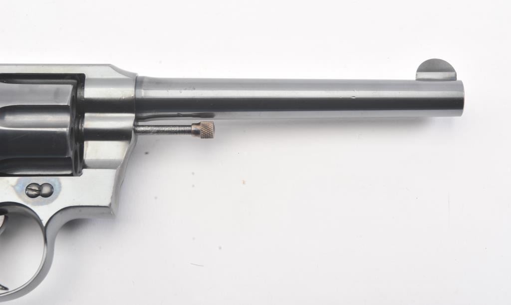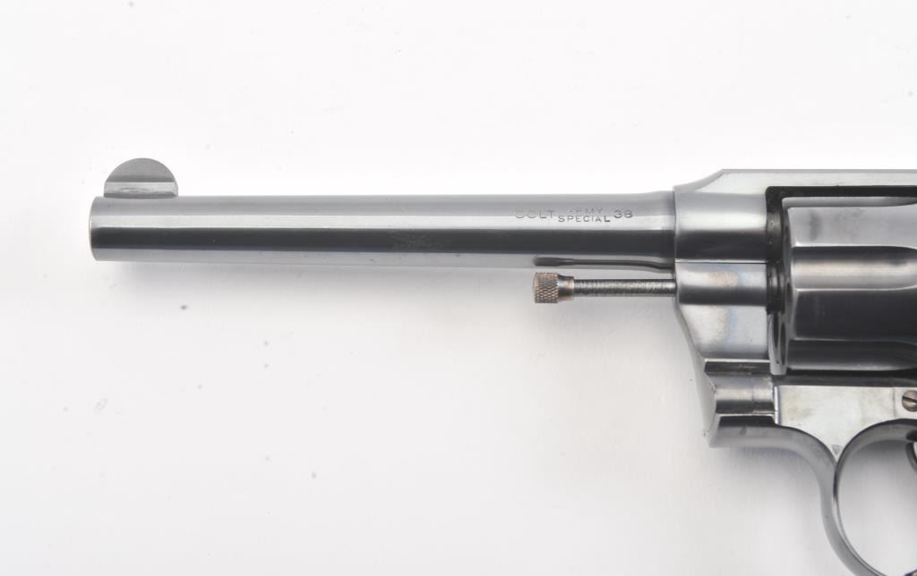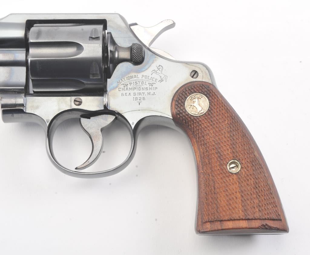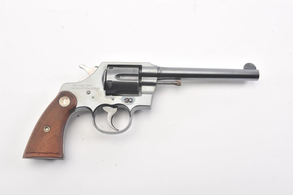 Colt Army Special DA revolver, #537185, .38 cal., 6" barrel, fixed sights, checkered wood medallion grips, with engraved sideplate which says " NATIONAL POLICE / PISTOL / CHAMPIONSHIP / SEA GIRT N. J. / 1926 " and on the right side " MILITARY CAPT . / ARTHUR W . WALLENDER ". The revolver is in near excellent condition overall, retaining 97% original finish, with some minor scratches and imperfections. The bore is about fine,the action is tight, and the grips are fine with crisp checkering, excellent fit and finish, and just minor losses on the left panel at the base. This revolver should be further researched and lettered, as it wasprobably an award, possibly from Colt. (C&R/PPT) Est. $700-1400