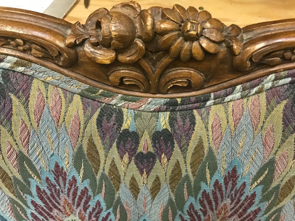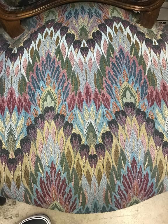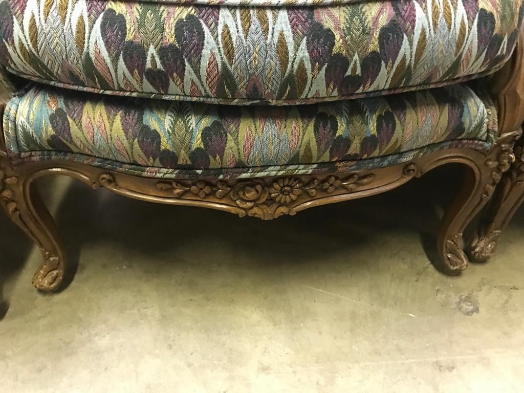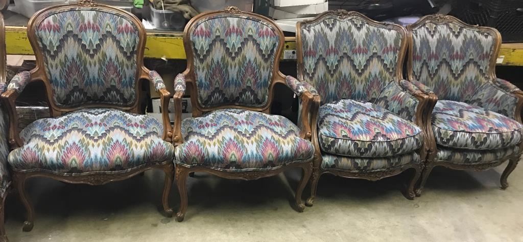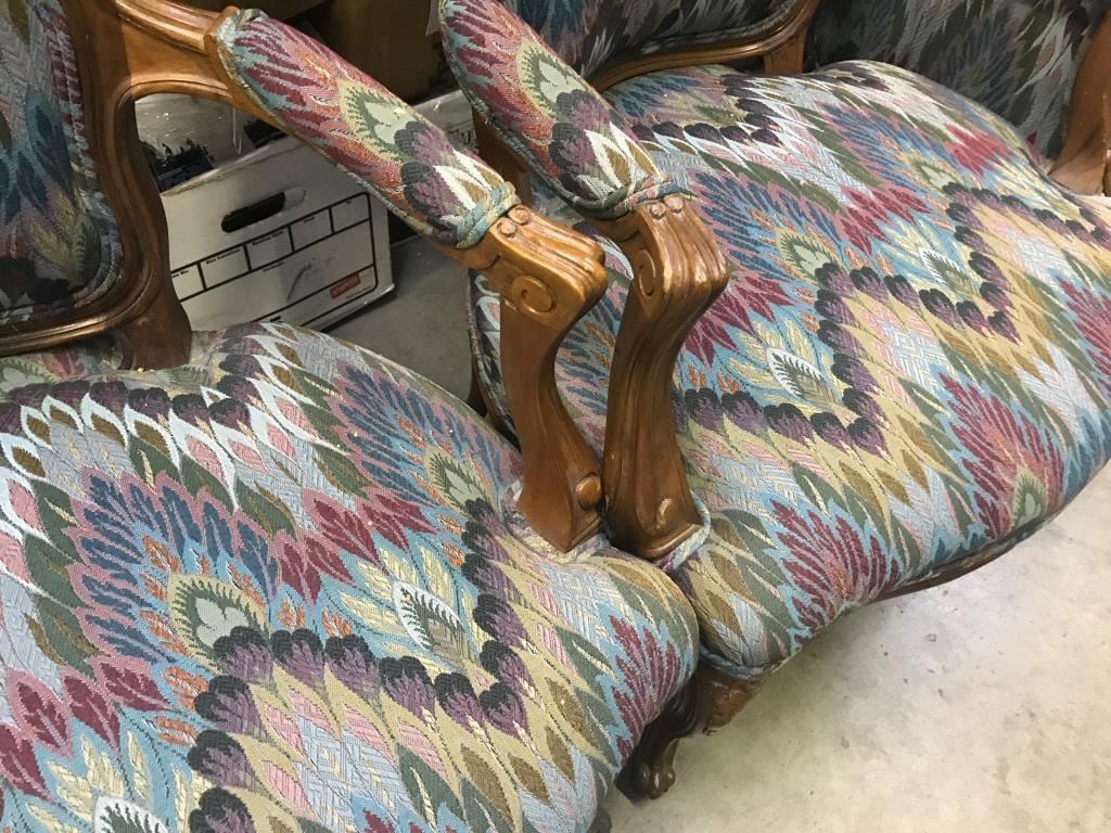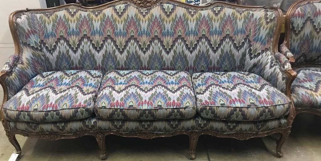 Vintage-style matching suite of a large couch and four side chairs with multi-color print fabric; couch is approximately 3 feet in height, 6 feet in width and 32” deep; the chairs are each approximately 3 feet inheight, 26” wide and 27” deep. Est.: $450-$900.
