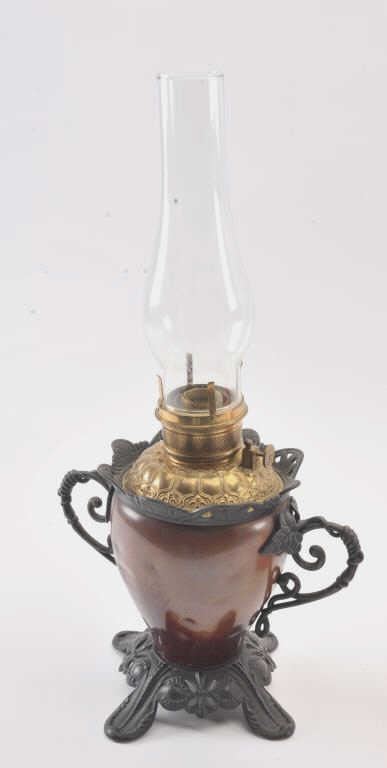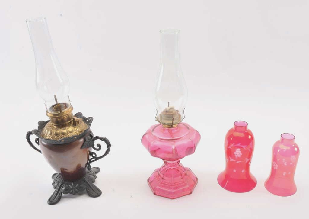 Lot of 10 antique oil lamps including simple and fancy designs; glass chimneys accompany the lamps along with a box of additional chimneys. Est.: $150-$300.
