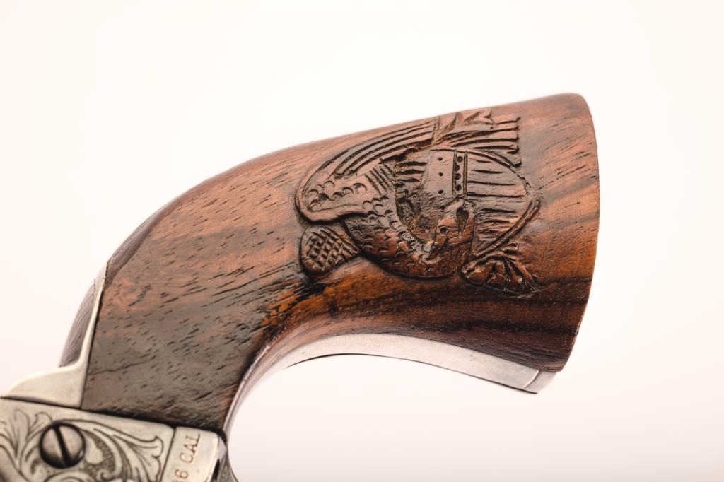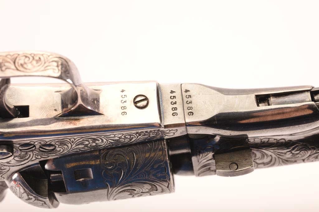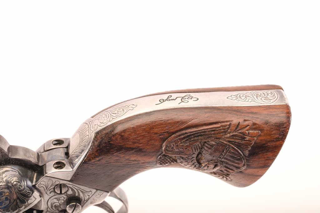 Colt 1861 New Blackpowder series B6 caliber percussion revolver S/N 45386. Its factory engraved, silver plated, and has carved wood eagle grips with Sam L Colt on backstrap. 1 of few produced by custom workshopre-creating Custer’s Colts. In excellent condition with toned silver in associated case. Est.: $1200-2400