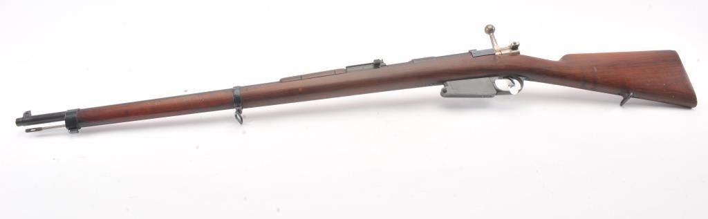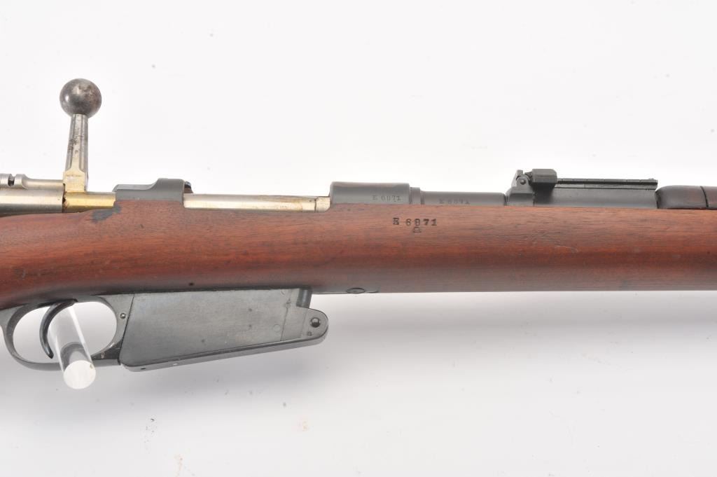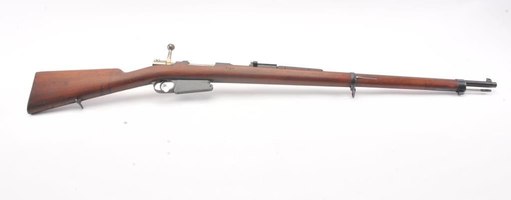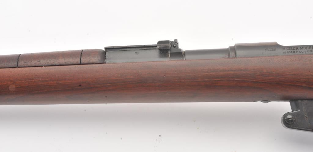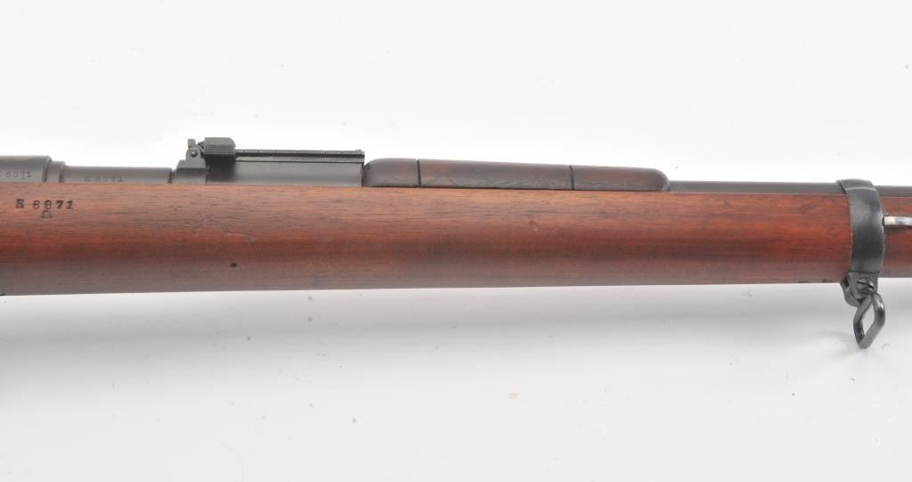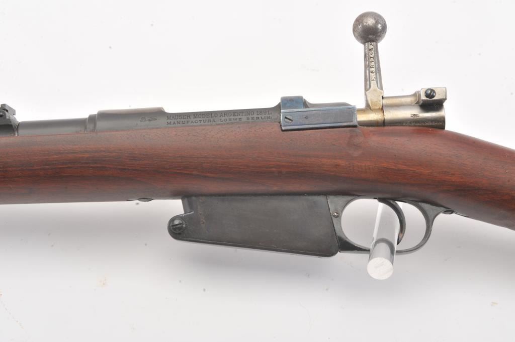 Beautiful Model 1891 Argentine Mauser rifle. All matching serial numbers, S/N E6871. This rifle is in 7.65 x 53 caliber and retains nearly all its original finish with great wood. Argentine crest is ground as is usual.Manufactured by Lowe and Pre-1899. A fine antique Mauser. (Antique) Est.: $400-$800