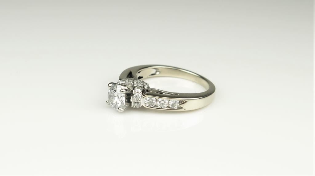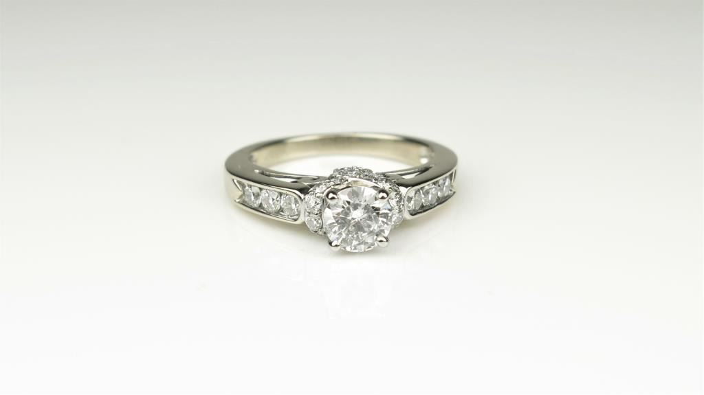 Beautiful Cathedral Style Diamond Ring featuring an ‘IDEAL’ cut center Diamond weighing approx. 0.60 carats with H-I colors impeccably detailed with 26 round Diamonds weighing approx. 1.00 carats with H-I colorsand SI clarity crafted in 14 karat white gold. Retail $3,000-$4,000 Estimates $2,000-$2,500
