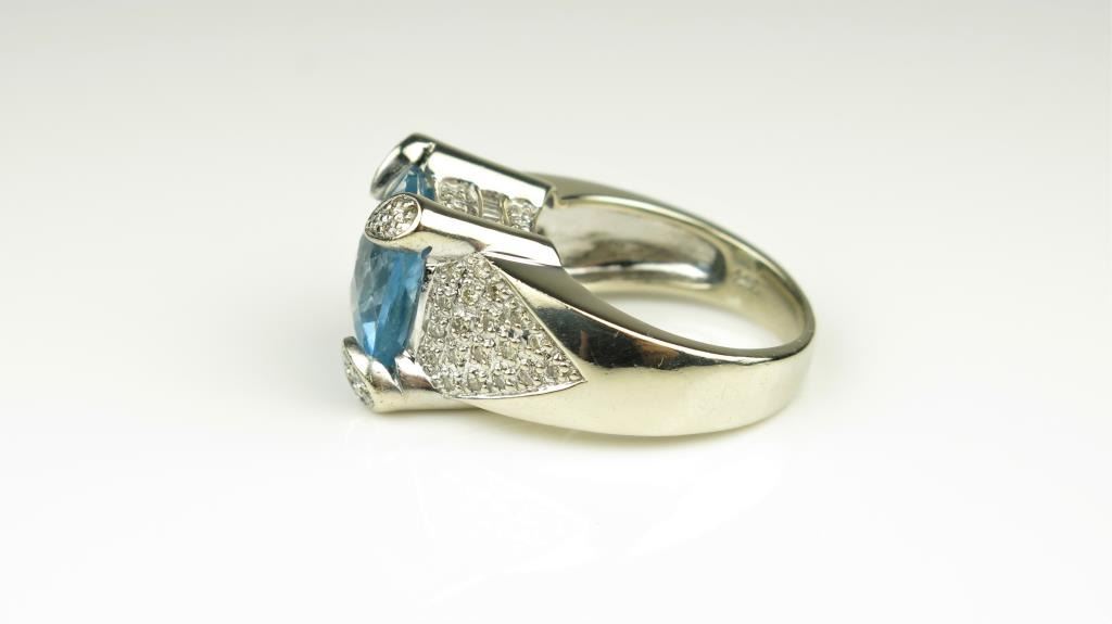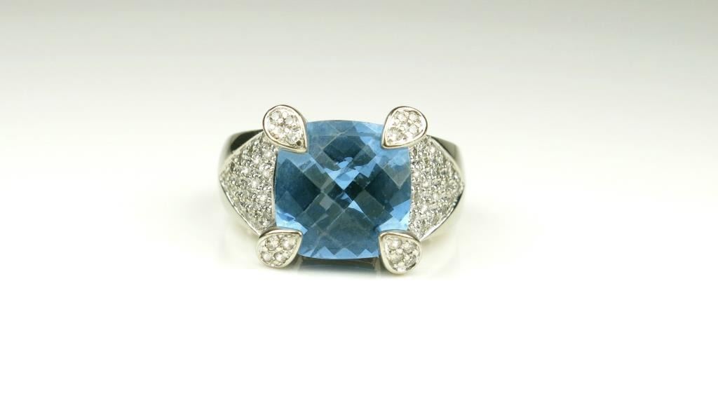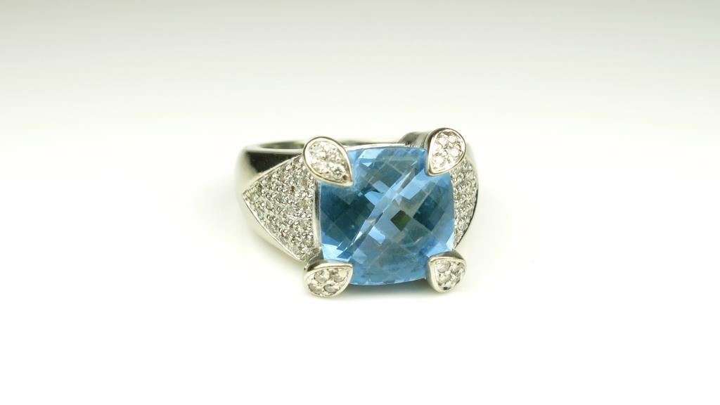 Stunning Blue Topaz and Diamond Ring featuring an approx. 7.00 carat checkerboard cut Topaz accented with 72 fine cut round and baguette Diamonds weighing approx. 1.00 carat with G-H colors and VS clarity set inan intricate labor-intensive designer style ring. Retail $3,000-$4,000 Estimates $2,000-$3,000