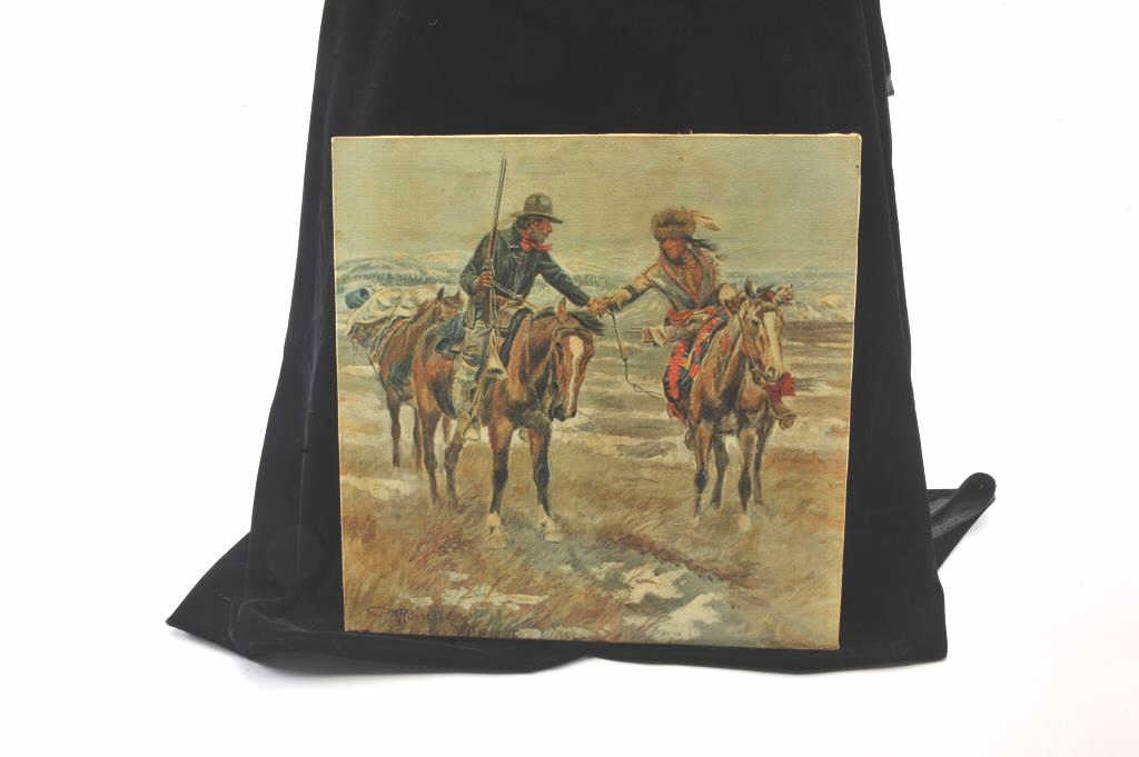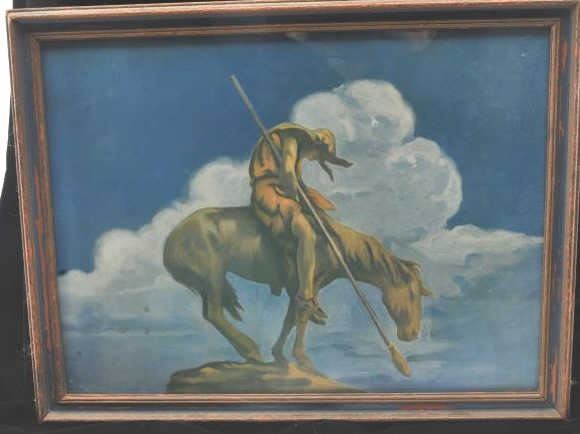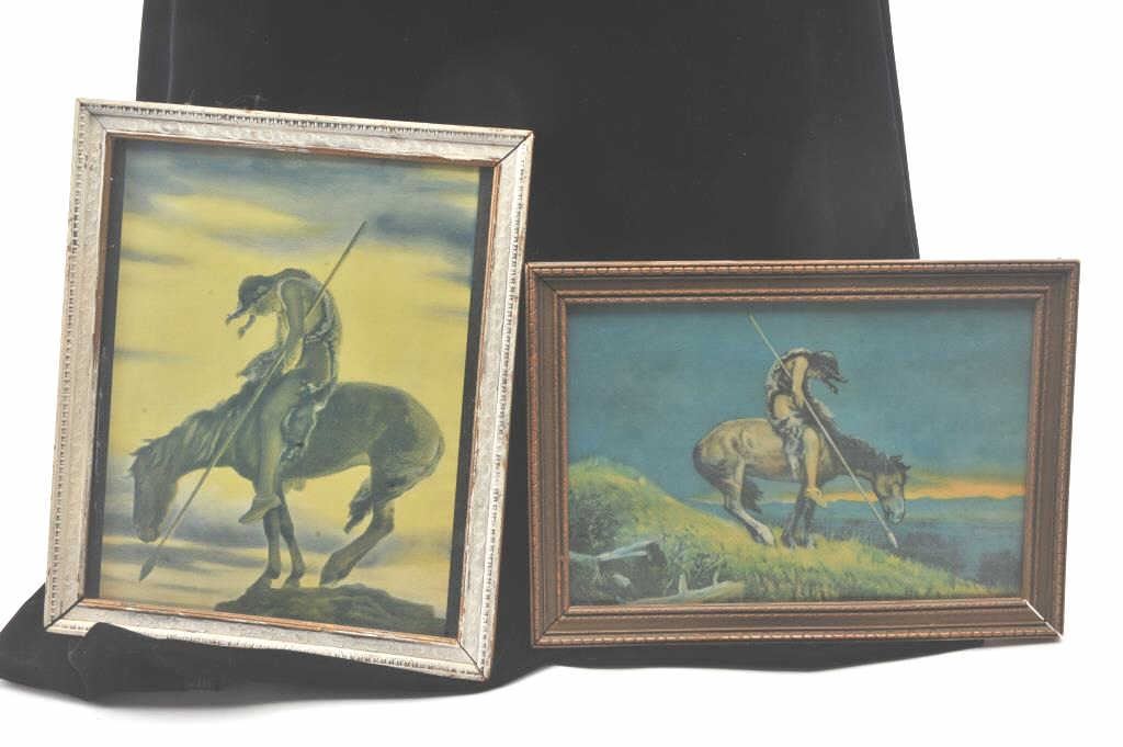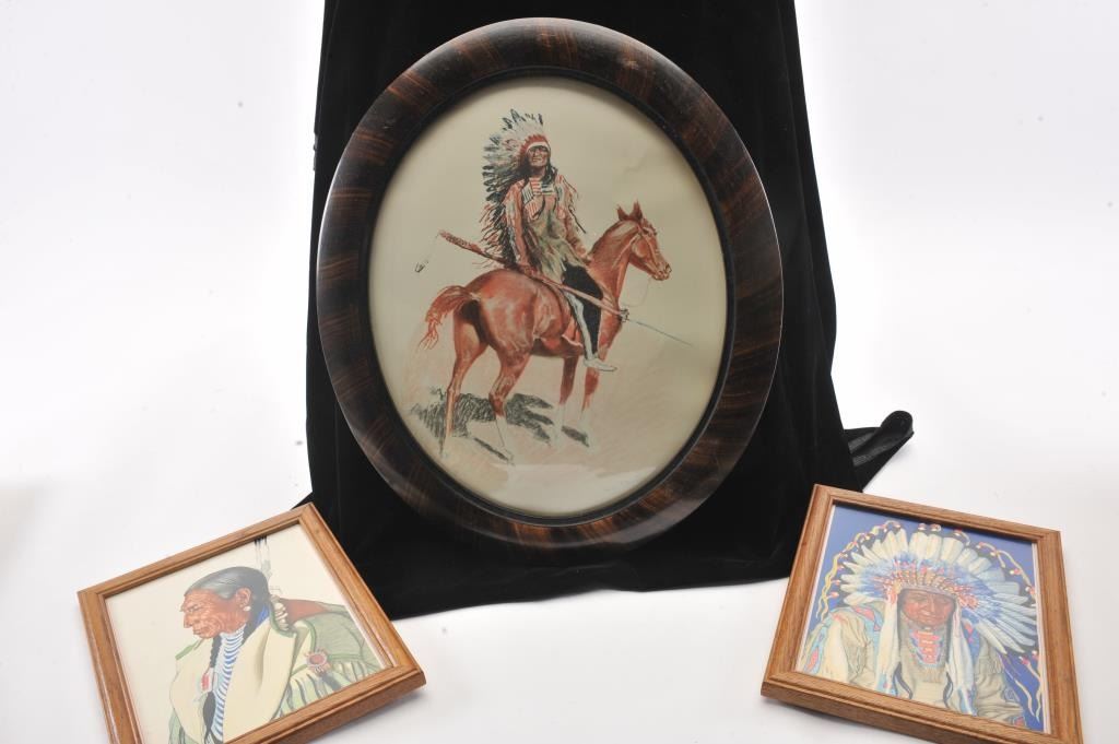 Lot of eight pieces of western art including: two small 9 ½” x 7 ½” prints of Indian chiefs in hardwood frames, 9” x 12” framed B/W print of a horse, three assorted sized framed prints of “END OF TRAIL” in niceantique wooden frames, a reproduction Frederic Remington print in an antique burl wood veneer oval frame and an unframed reproduction C.M. Russell print on canvas measuring 16” x 16”. A nice lot of westerndecorator items. Est.: $100-$200.