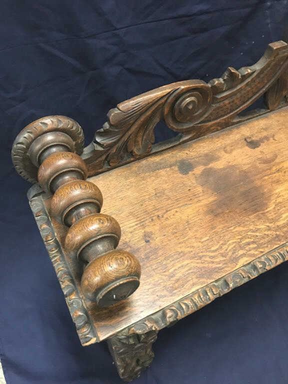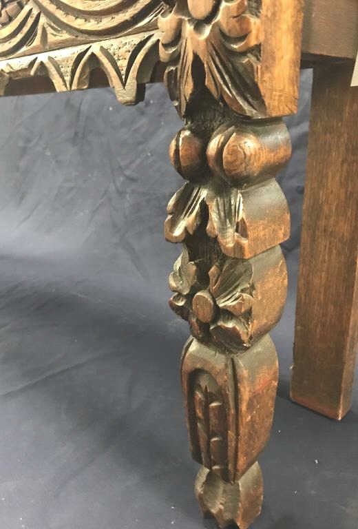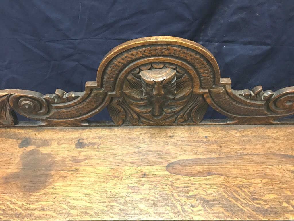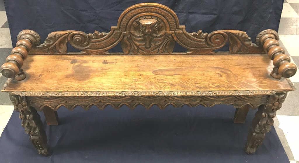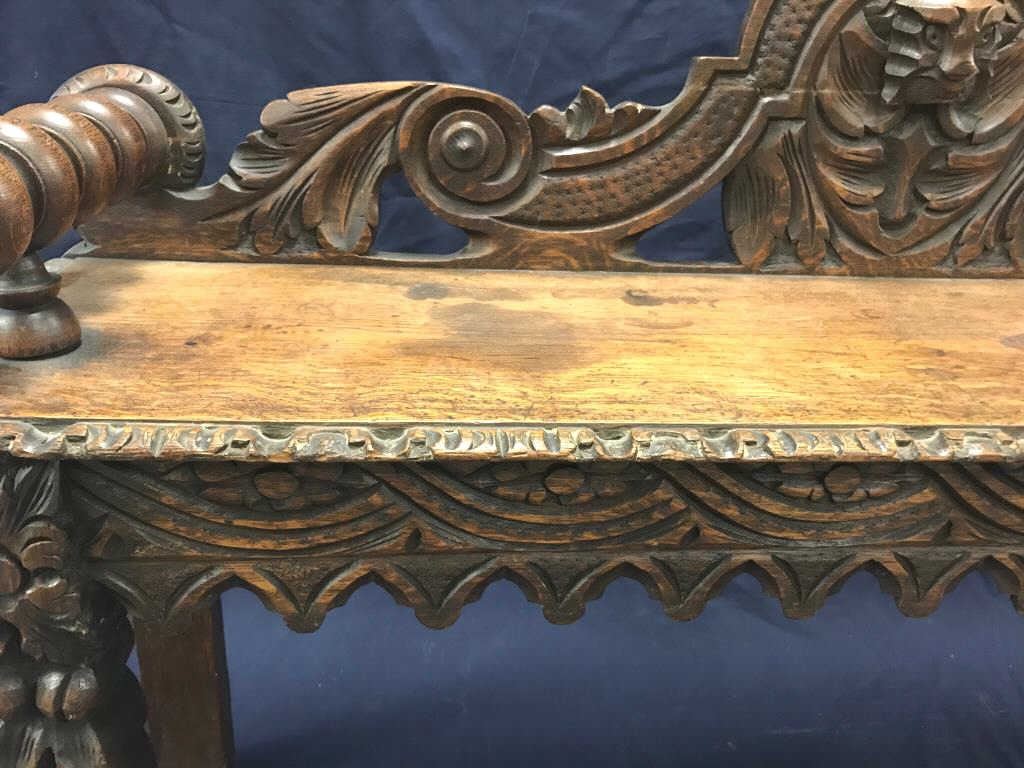 Heavily carved antique oak hall bench with quarter sawn oak sitting area; approximately 30” in height, 48” long and 12” deep; small old edge trim seat losses (approximately 3” left side and 4” right side). Est.:$150-$300.