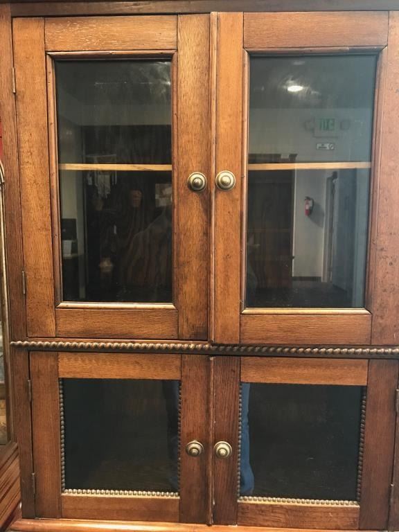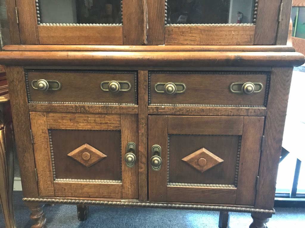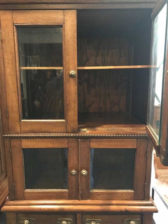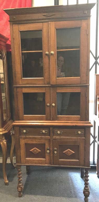 Vintage wood and glass display case over 2 drawers and storage area, old brass knobs, spindle legs; approximately 70” in height, 29” wide and 18” deep. Est.: $500-$1,000.