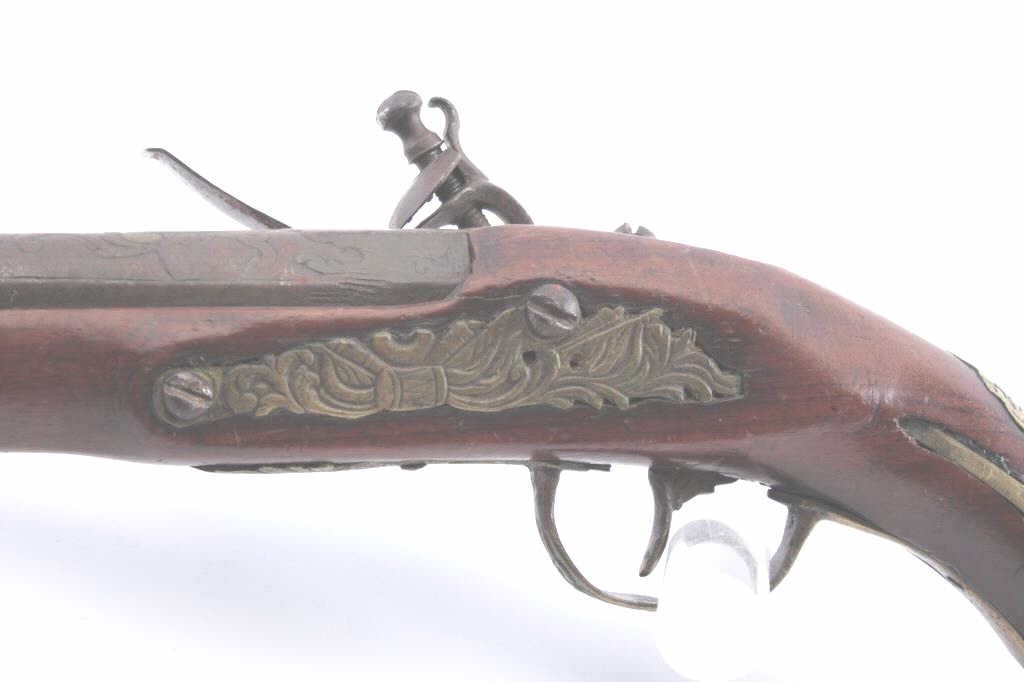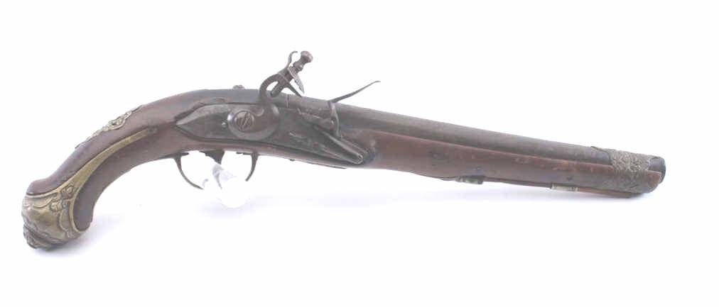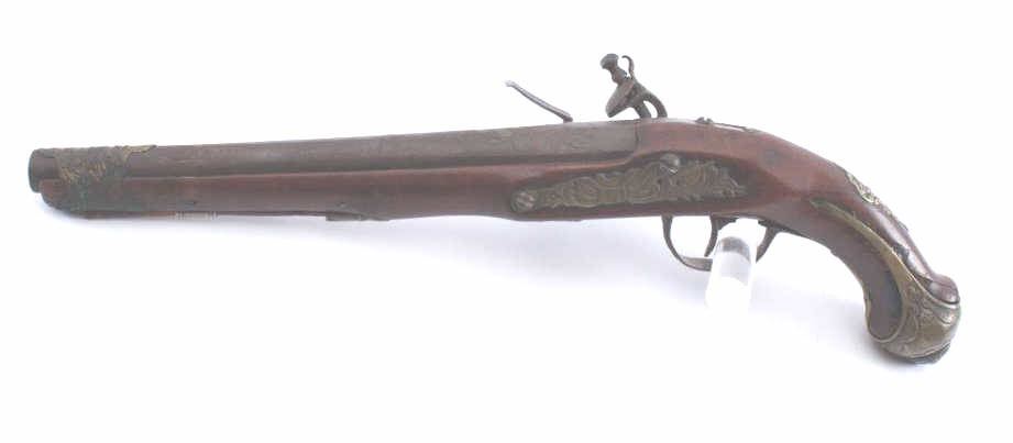 Good quality flintlock pistol continental made for Eastern trade circa 18th to early 19th century. Measures 17” overall with a 10 ½” barrel of .69 caliber smoothbore. Banana shaped early lock. Brass mounts. Goodoverall. Works well. (Antique) Est.: $400-$800