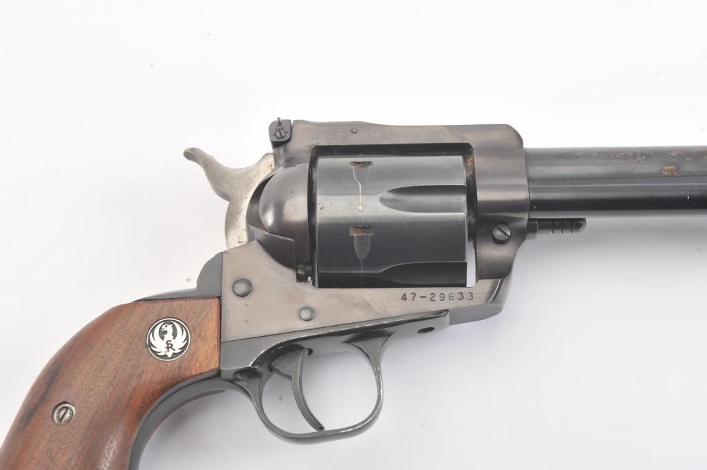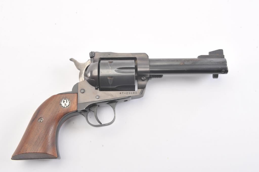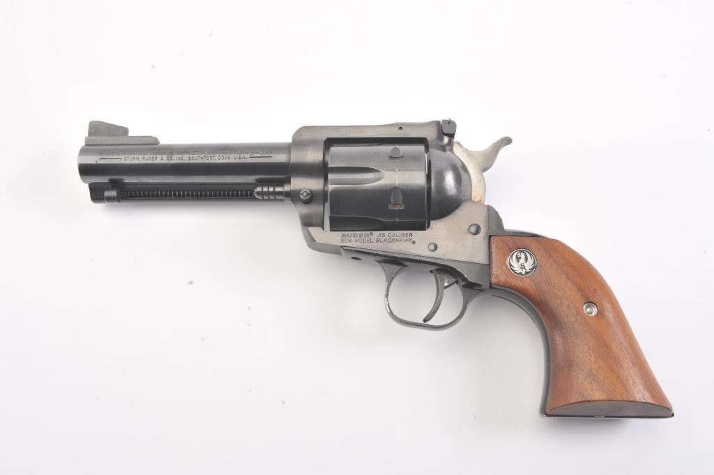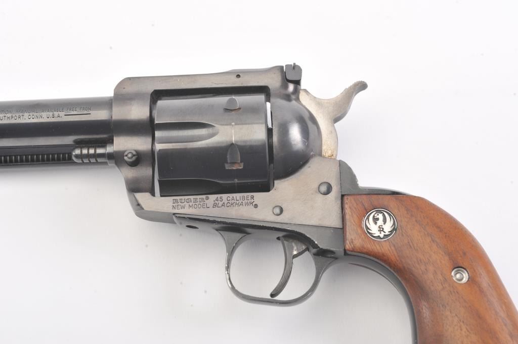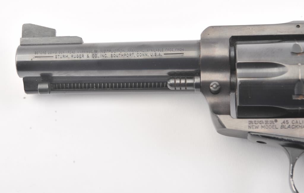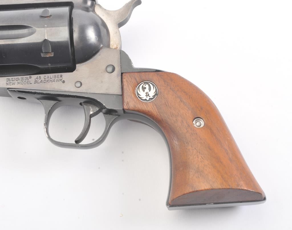 Ruger New Model Blackhawk single action revolver, .45 caliber, 4.75” barrel, blued finish, smooth wood medallion grips, S/N 47-29633; overall very good condition with some loss to finish on right side of barrel,crisp action, sharp markings, un-cleaned bore and near fine grips. (Modern/NO PPT). Est.: $300-$500.