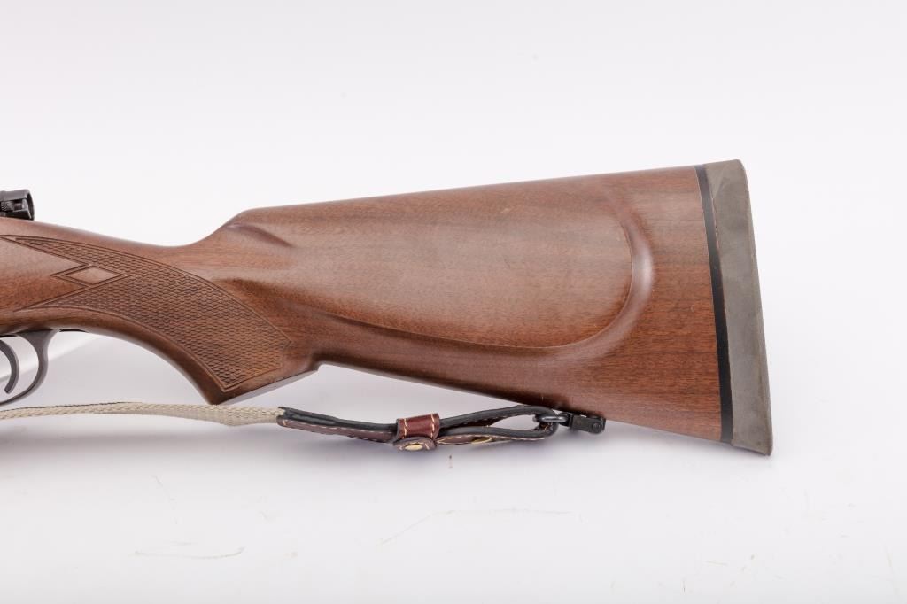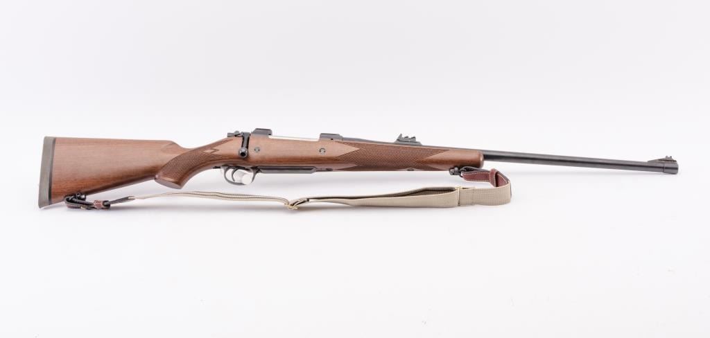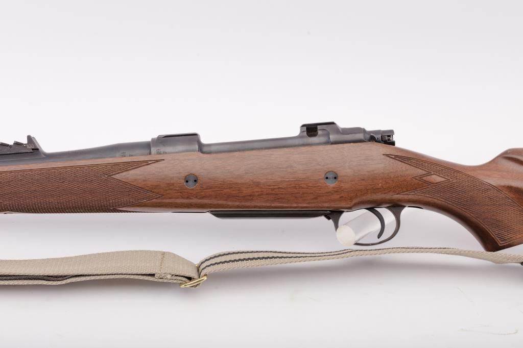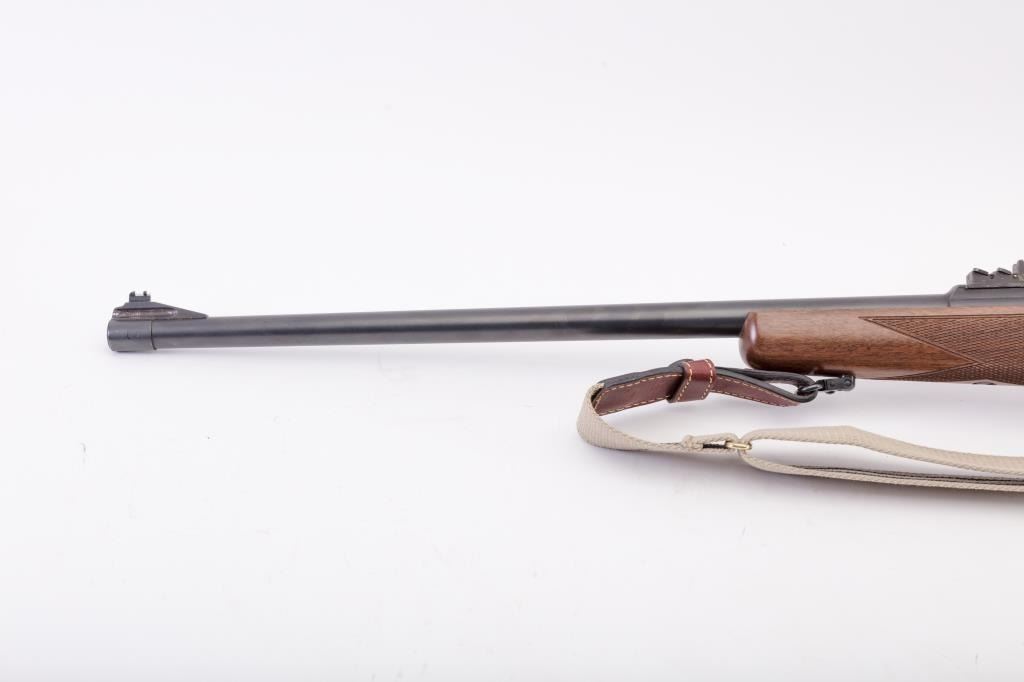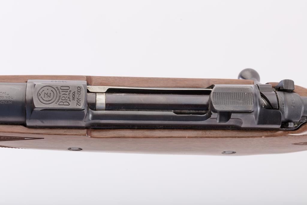 BRNO CZ Model ZKK 602 bolt action rifle, .459 Hedrat caliber, Serial #10542. The rifle is in very good overall condition with a 25” barrel with a ramped blade front and three folding rear sights. The metal surfacesretain the majority of the factory blue finish with wear at the muzzle. The receiver is import marked and features integral scope mounts. Originally chambered in .458 Winchester Magnum, the rifle is marked, “T.J. Taylor .459 Hedrat” in front of the ring. The checkered wood stock is in very good condition and ends with a solid rubber recoil pad. The bore is good, the action is crisp and markings are sharp. The lot includessling swivels and a custom canvas and leather sling. Est.: $900-$1,800. (Modern).