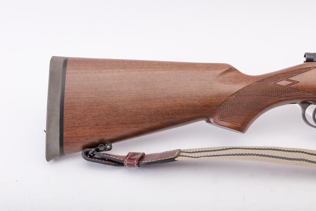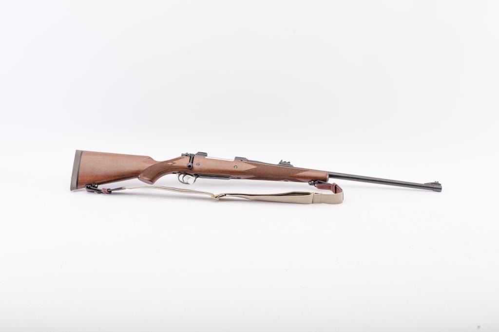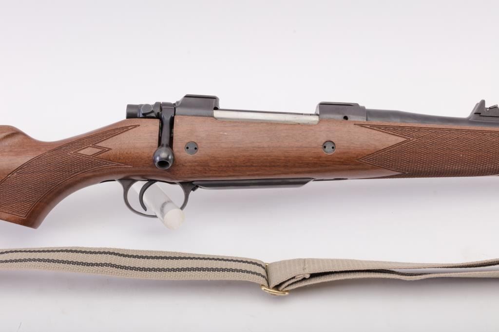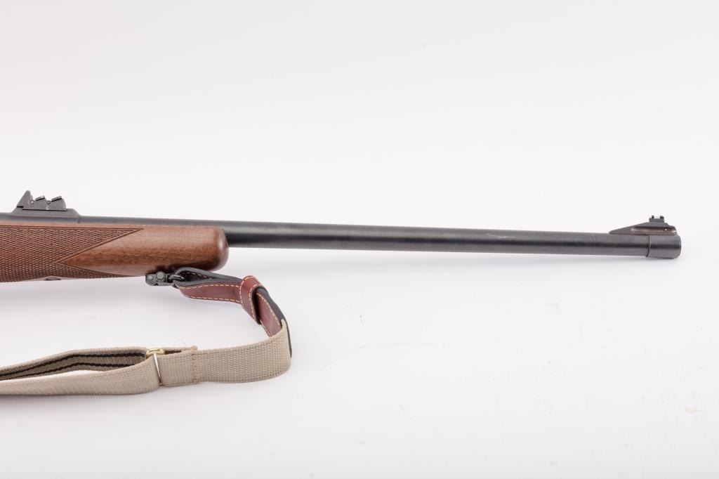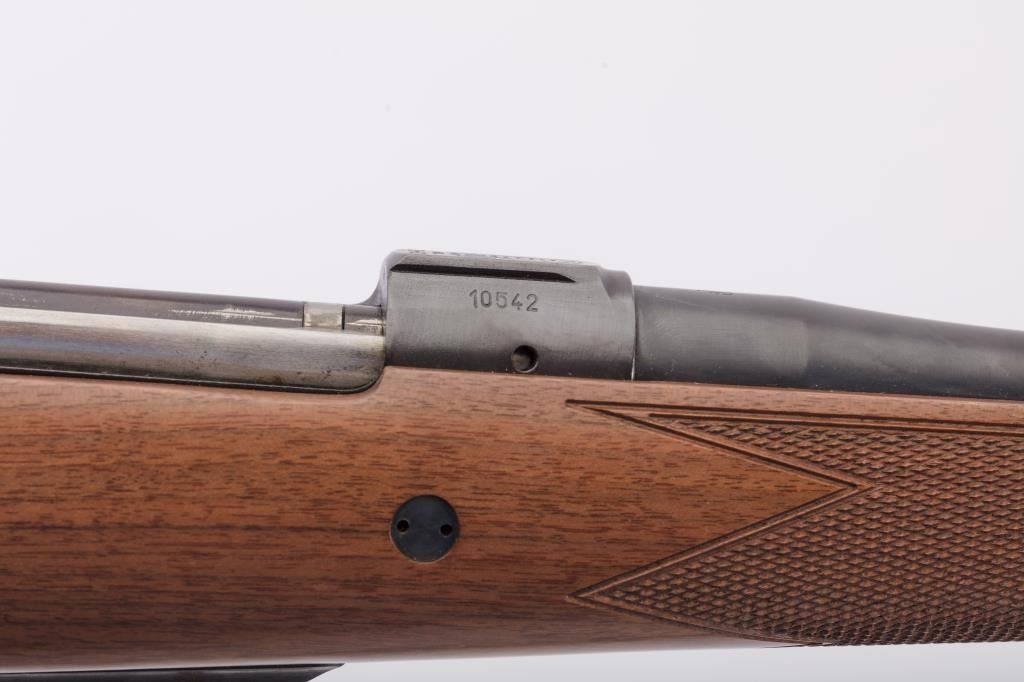 BRNO CZ Model ZKK 602 bolt action rifle, .459 Hedrat caliber, Serial #10542. The rifle is in very good overall condition with a 25” barrel with a ramped blade front and three folding rear sights. The metal surfacesretain the majority of the factory blue finish with wear at the muzzle. The receiver is import marked and features integral scope mounts. Originally chambered in .458 Winchester Magnum, the rifle is marked, “T.J. Taylor .459 Hedrat” in front of the ring. The checkered wood stock is in very good condition and ends with a solid rubber recoil pad. The bore is good, the action is crisp and markings are sharp. The lot includessling swivels and a custom canvas and leather sling. Est.: $900-$1,800. (Modern).