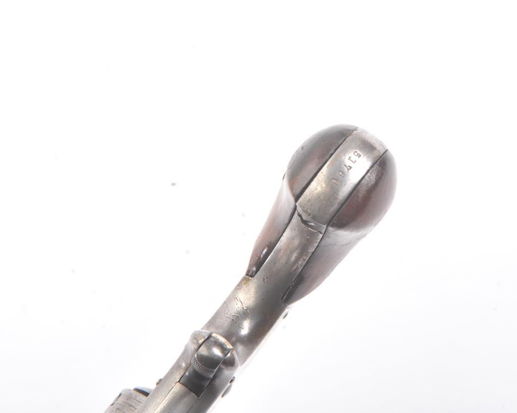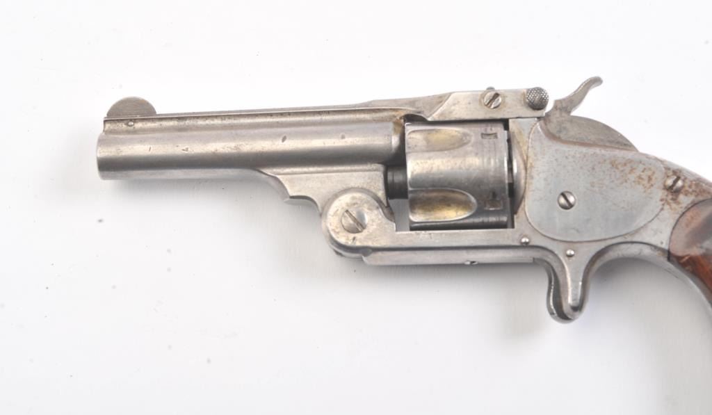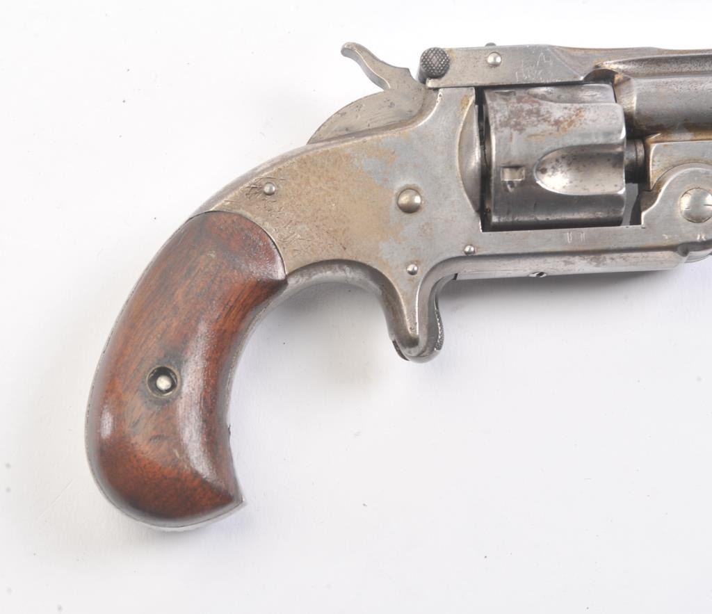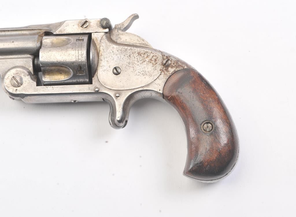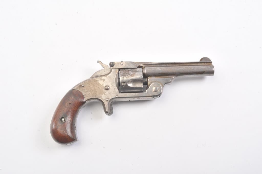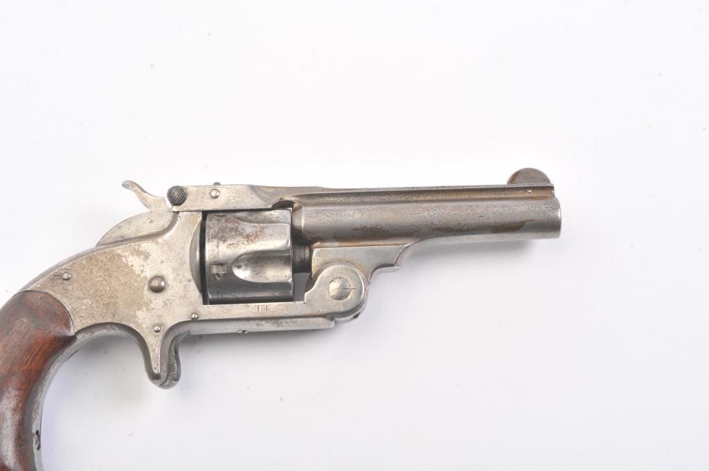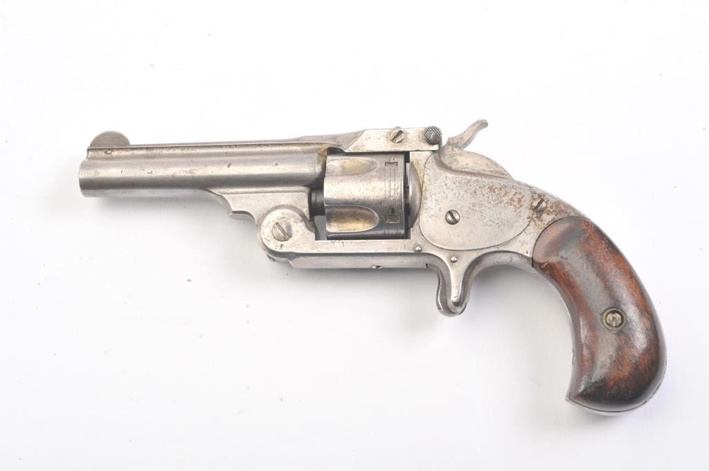 Smith & Wesson Model 1 ½ single action revolver, .32 caliber, Serial #51766. The pistol is in very good overall condition with a 3” barrel. The pistol retains the majority of its nickel finish with scratches, mars and light surface rust on the cylinder and frame. The smooth wood grips are in good condition with an extra coat of varnish added. The action is crisp, the markings are legible and the bore is fair. Est.:$200-$400. (Antique).