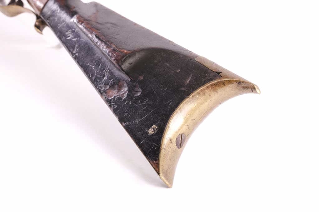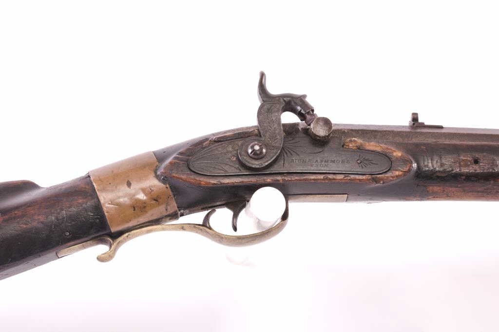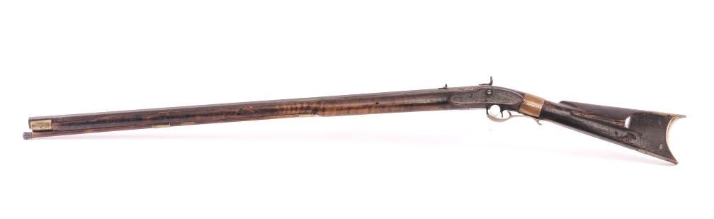 American full stock transition Kentucky and marked on lock “Rich’D Ashmore & Son”. Measures 50 ½” overall with a 35” medium weight octagon barrel in approximately .42 caliber smoothbore (For buck or ball). “V”notch sight on barrel. Old copper repair to wrist with some wood losses. Works well. Pleasing frontier look from many campfires. (Antique) Est.: $250-500
