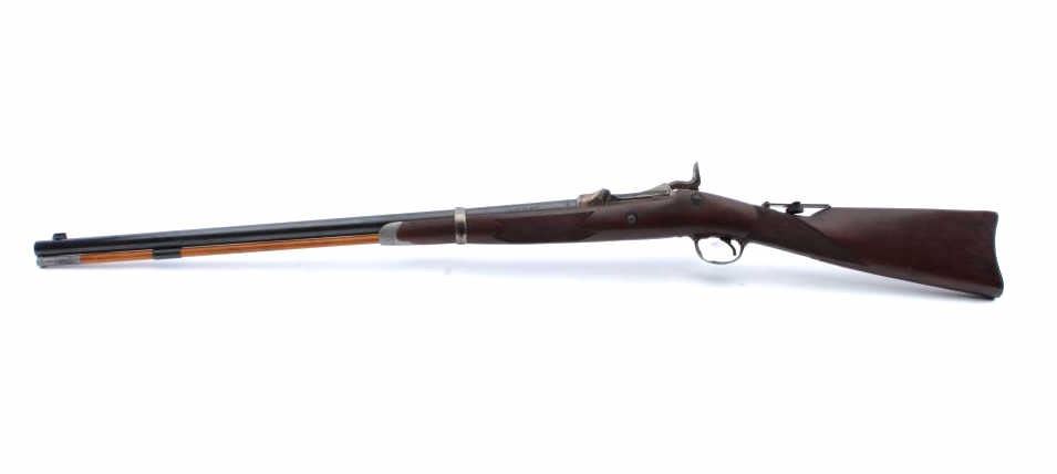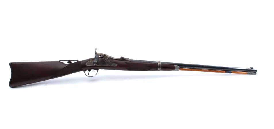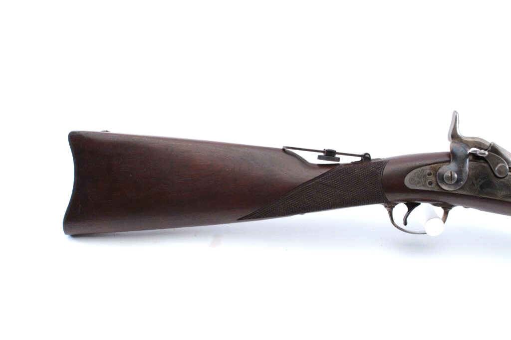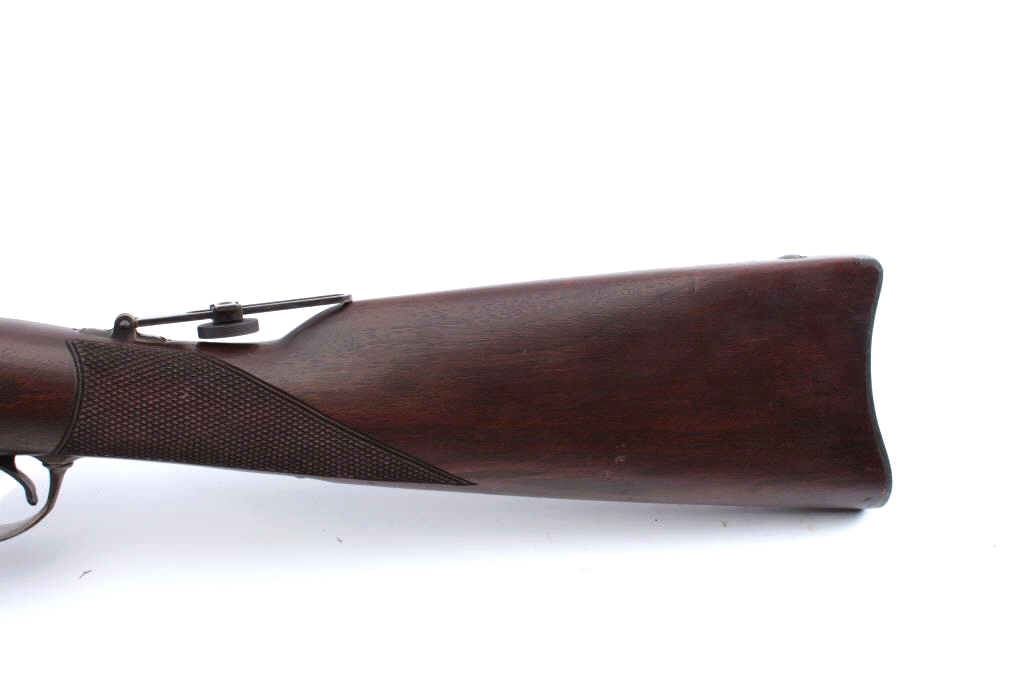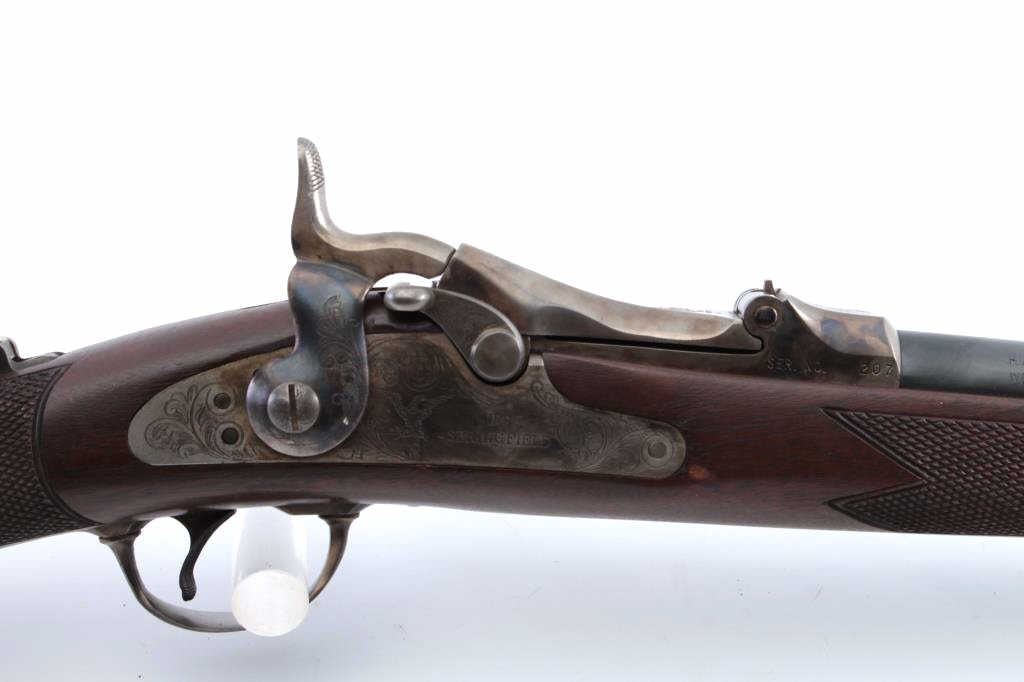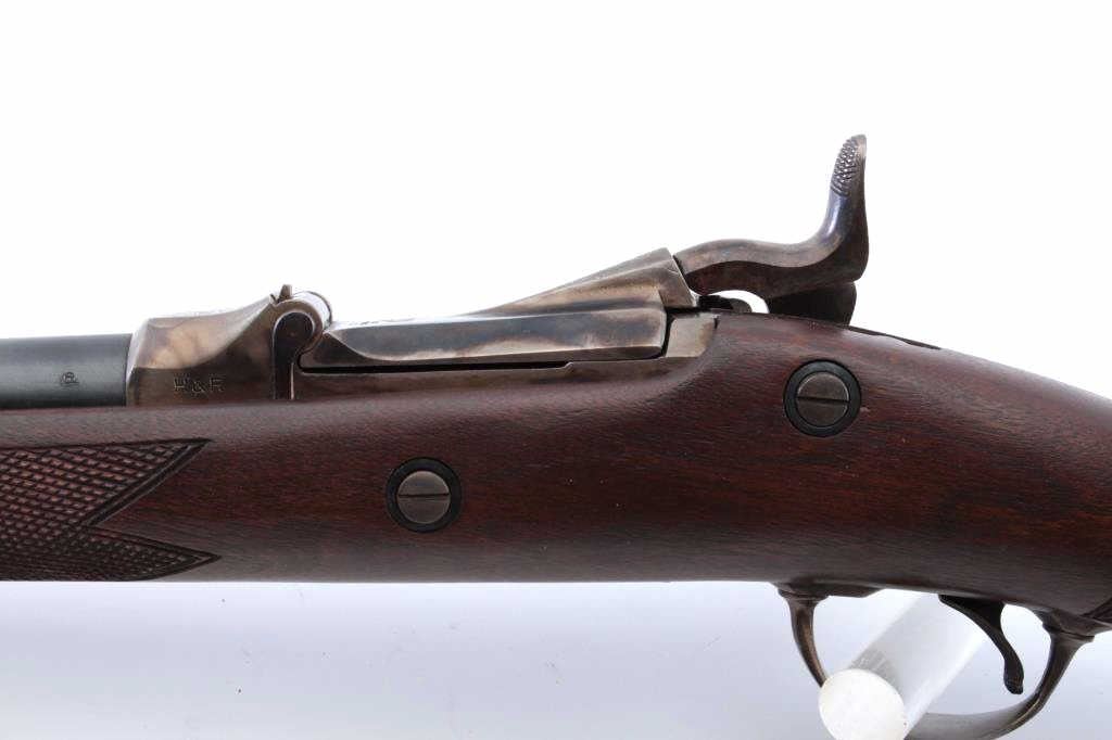 Harrington & Richardson copy of a U.S. Springfield Model 1873 “Trapdoor” rifle in the style of an Officer’s Model with engraved side plate, receiver, trigger guard and forend tip, .45-70 caliber, 26.5” barrel,blued and case hardened finish, checkered wood stock, wood cleaning rod, flip-up adjustable rear sight mounted on top of stock’s wrist, S/N 207 in like new condition. (Modern). Est.: $750-$1,500.